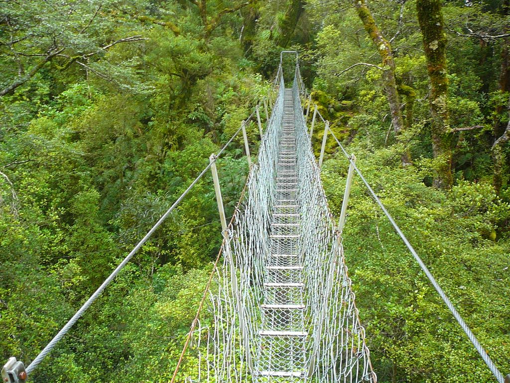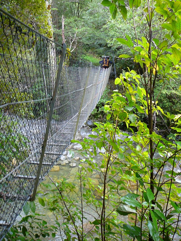 44. Au détour d'un virage, un pont suspendu: le refuge est posé sur son extrémité à gauche de la photo.