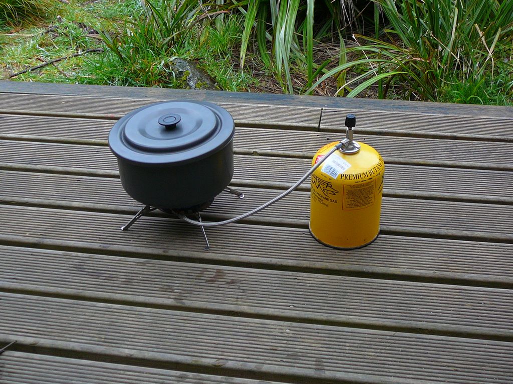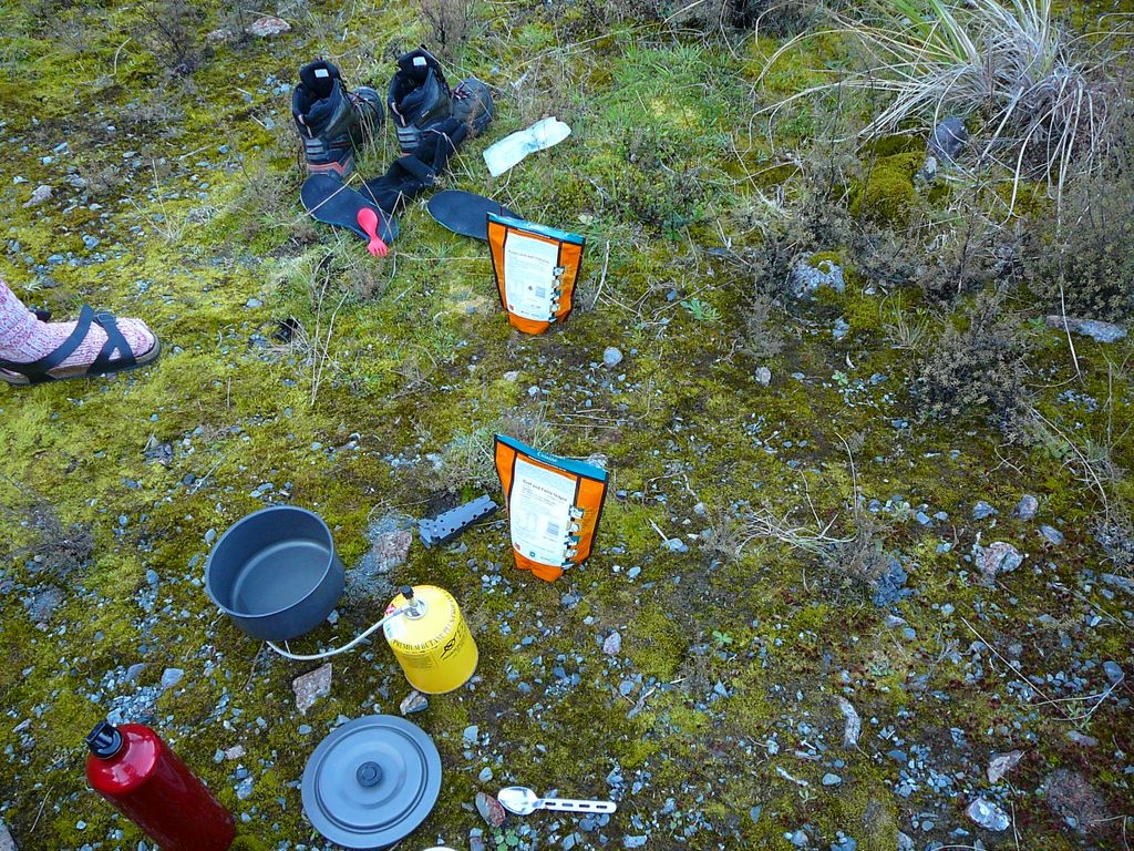 31. Le repas du campeur: liophilisé! J'ai chauffé l'eau et l'ai répartie dans les deux sacs/repas. En gros, on attent que ça cuise!