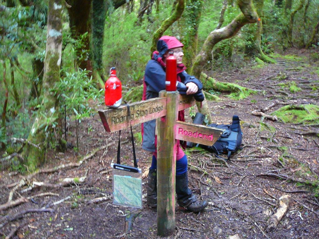 51. On progresse rapidement, et très vite, on rejoint l'intersection où, 2 jours plus tôt, nous sommes partis vers le fond de la photo, vers Herepai. Aujourd'hui, nous revenons depuis l'autre côté, depuis le Roaring Stag Lodge. Il nous reste une heure avant le parking.