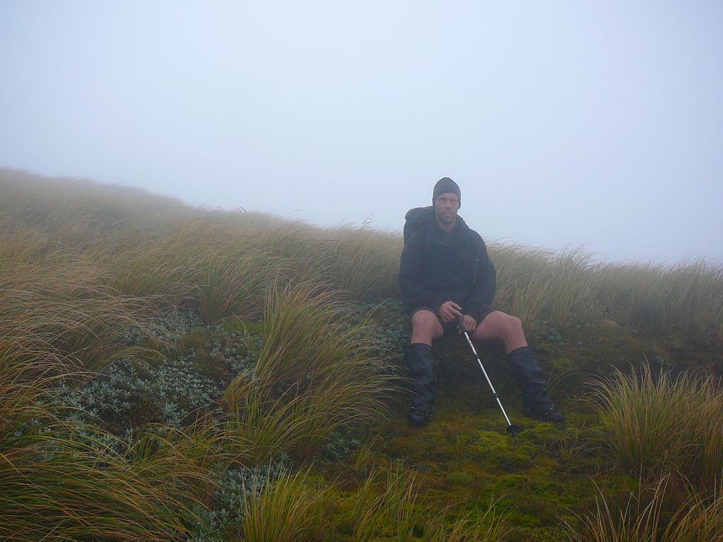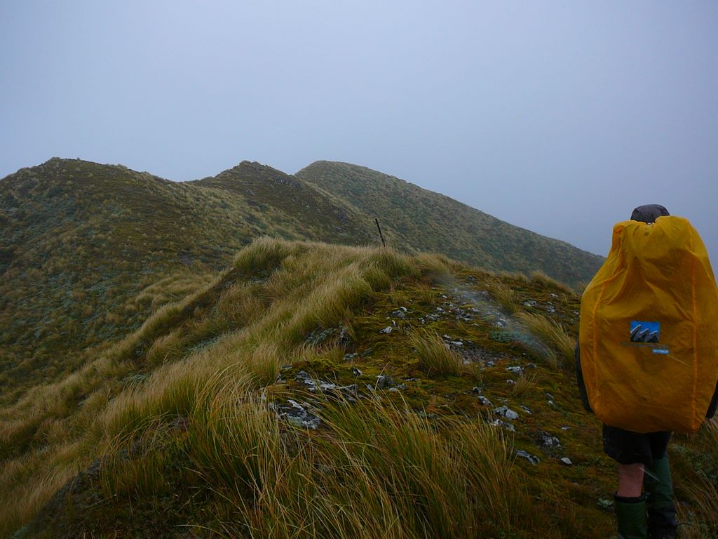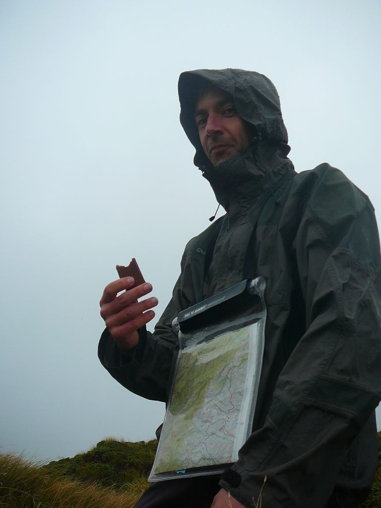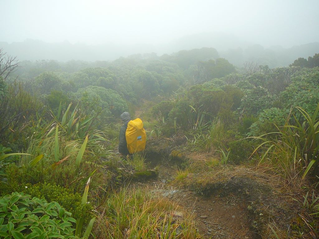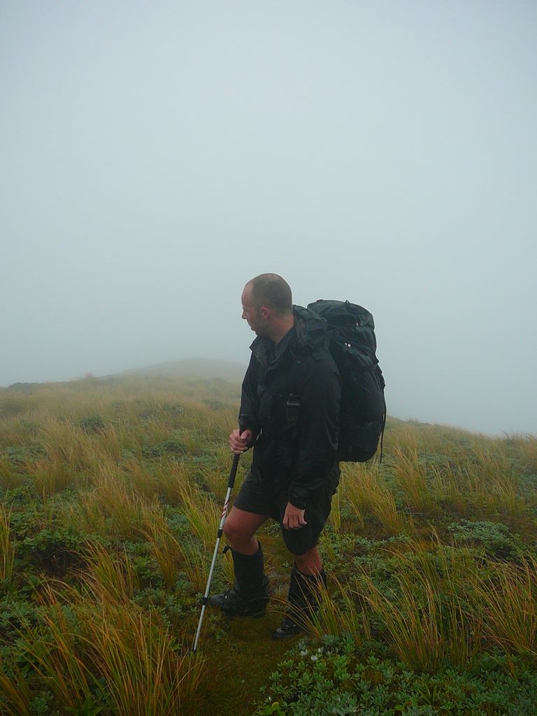 58. Nous sommes sur une crête et il s'agirait de ne pas se perdre. Heureusement, il n'y a pas trop de vent, juste de la pluie, et le nuage n'est pas très dense. On voit à 50m, ce qui est suffisant.