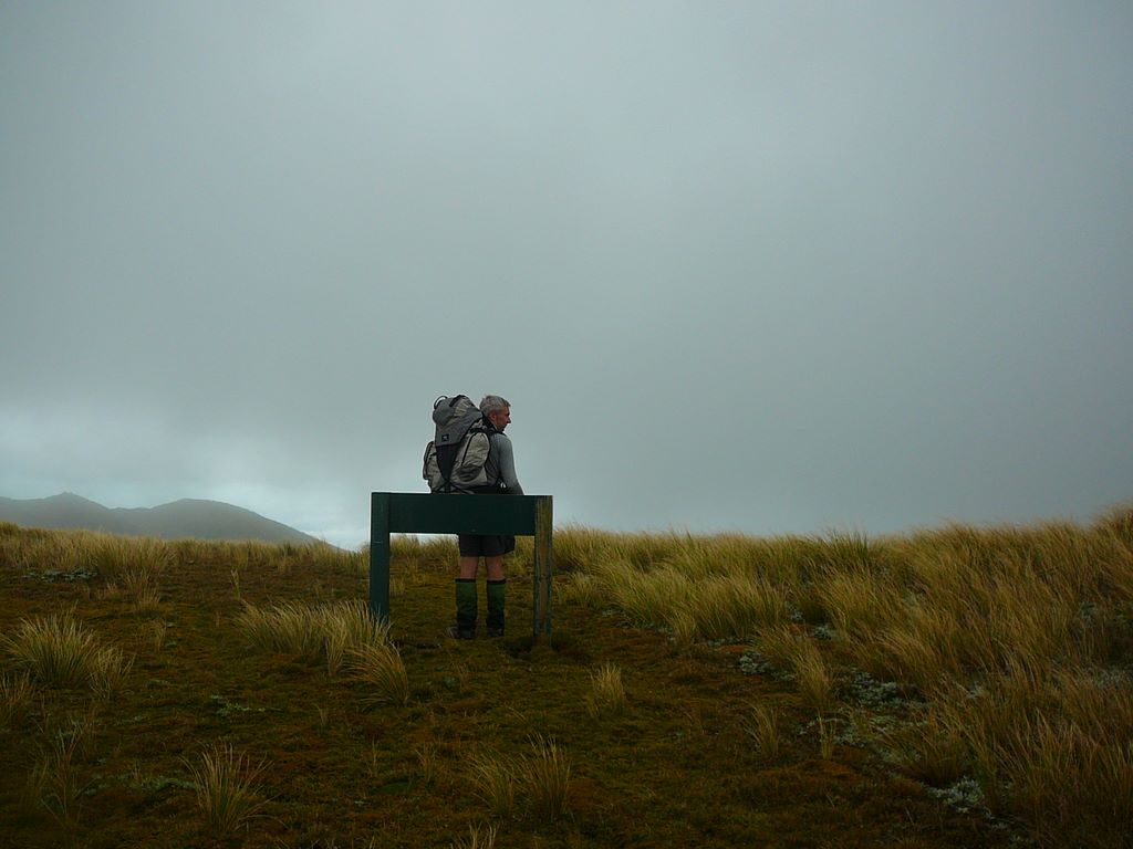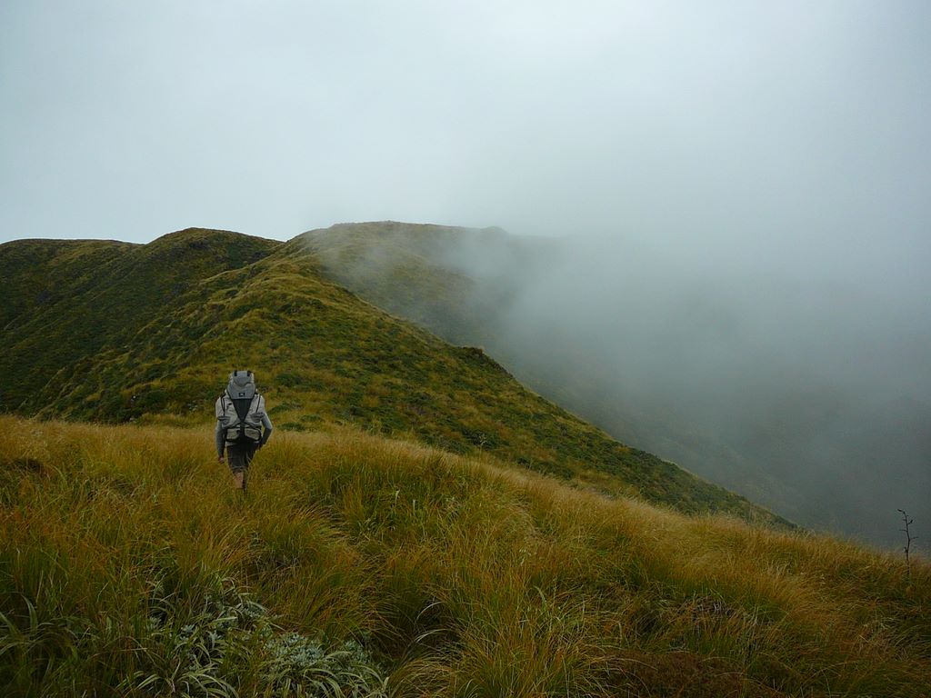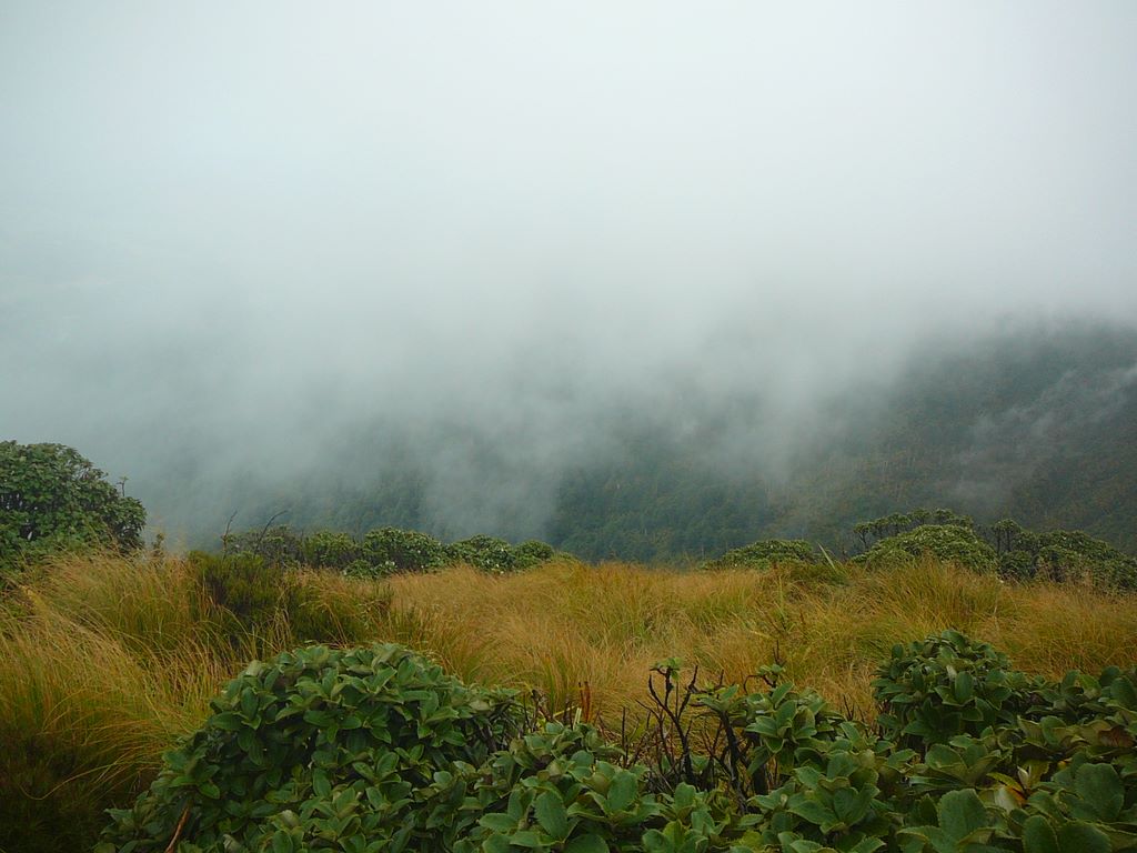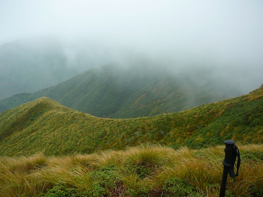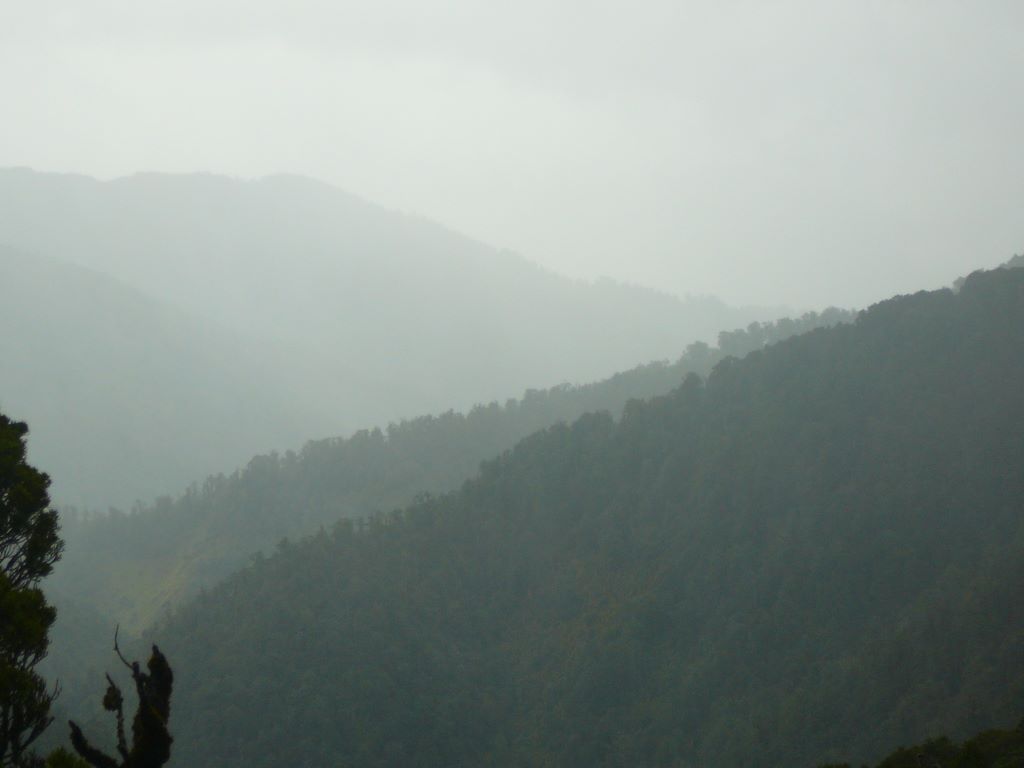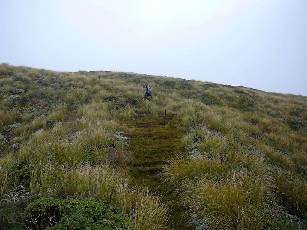 58. Nous sommes sur une crête et il s'agirait de ne pas se perdre. Heureusement, il n'y a pas trop de vent, juste de la pluie, et le nuage n'est pas très dense. On voit à 50m, ce qui est suffisant.