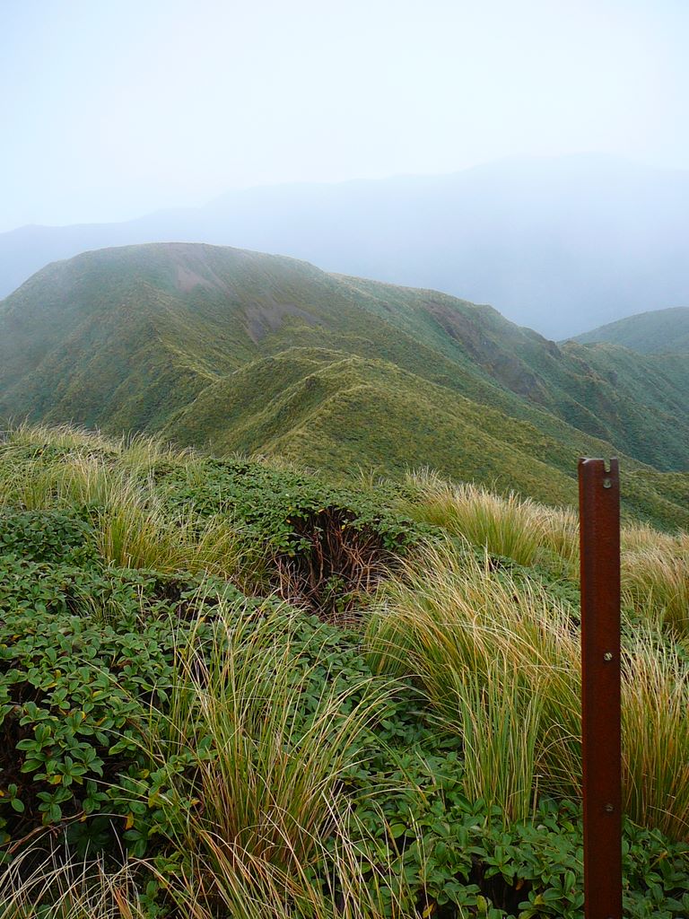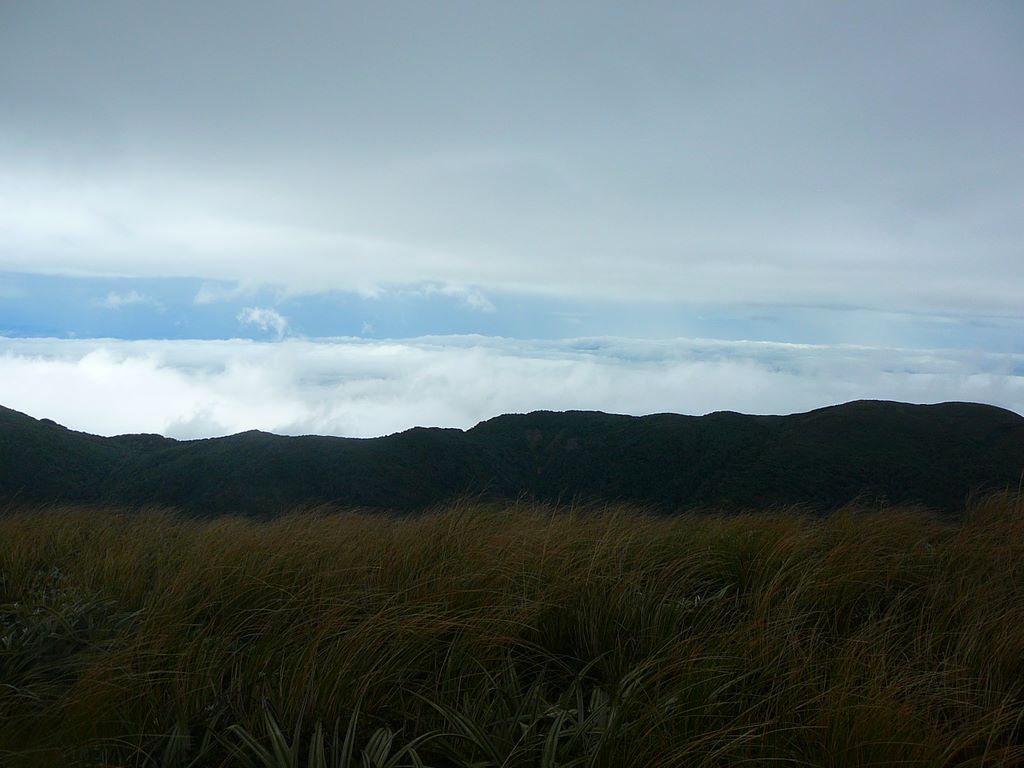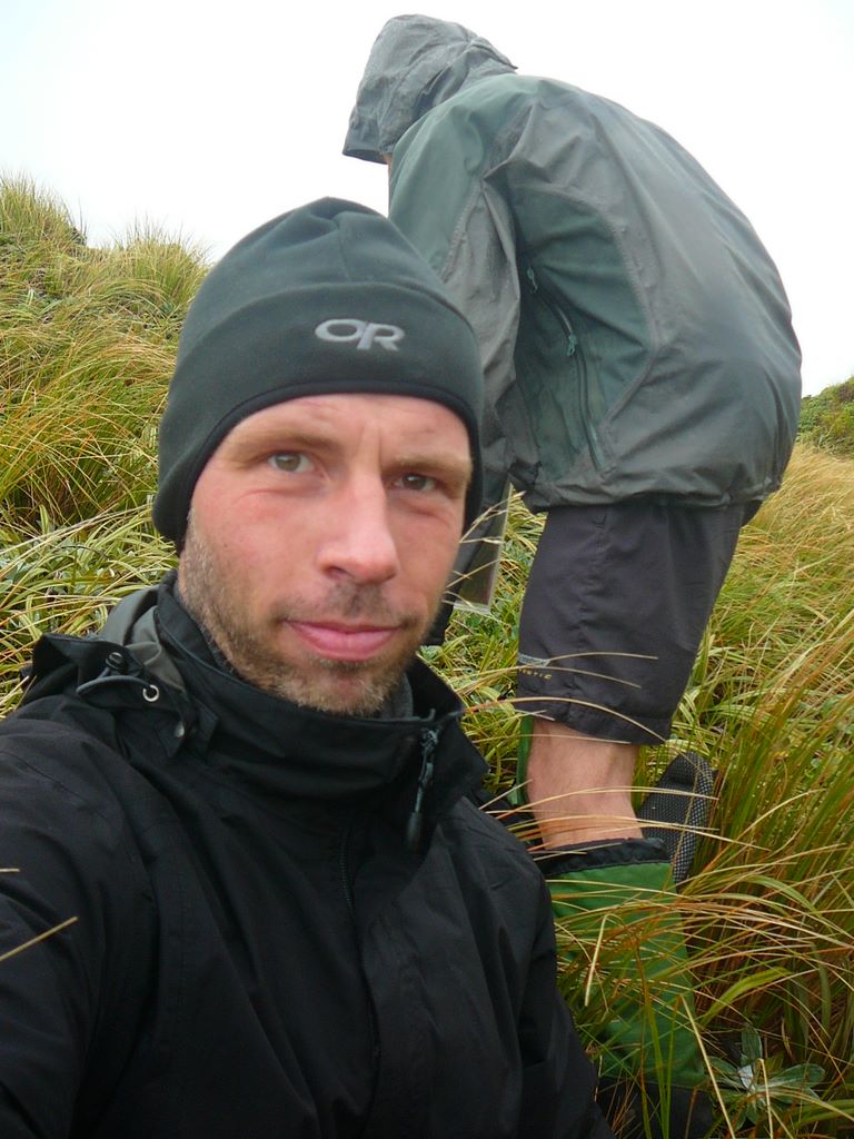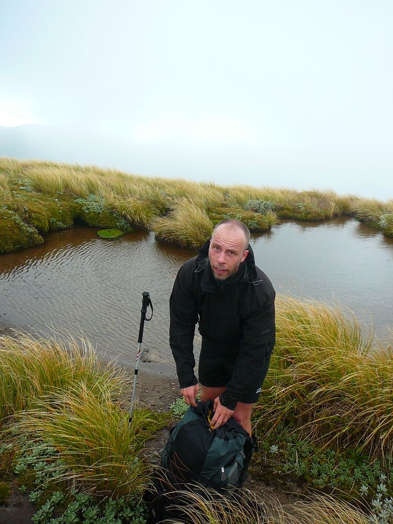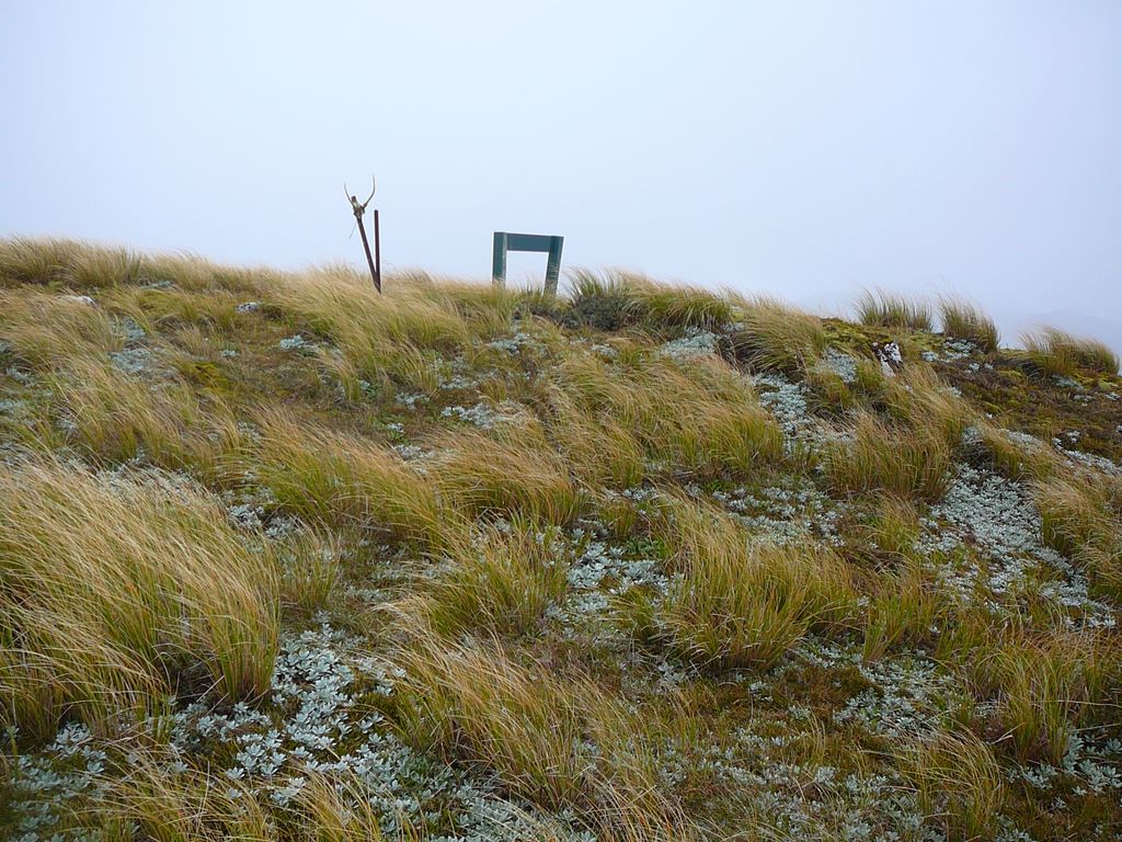58. Nous sommes sur une crête et il s'agirait de ne pas se perdre. Heureusement, il n'y a pas trop de vent, juste de la pluie, et le nuage n'est pas très dense. On voit à 50m, ce qui est suffisant.