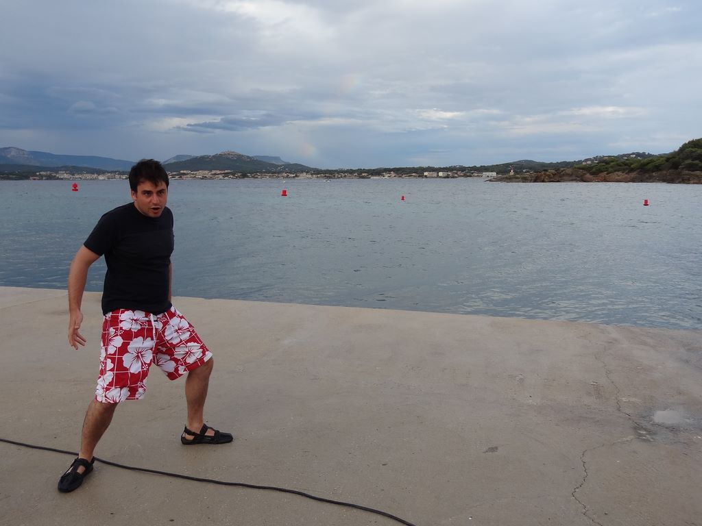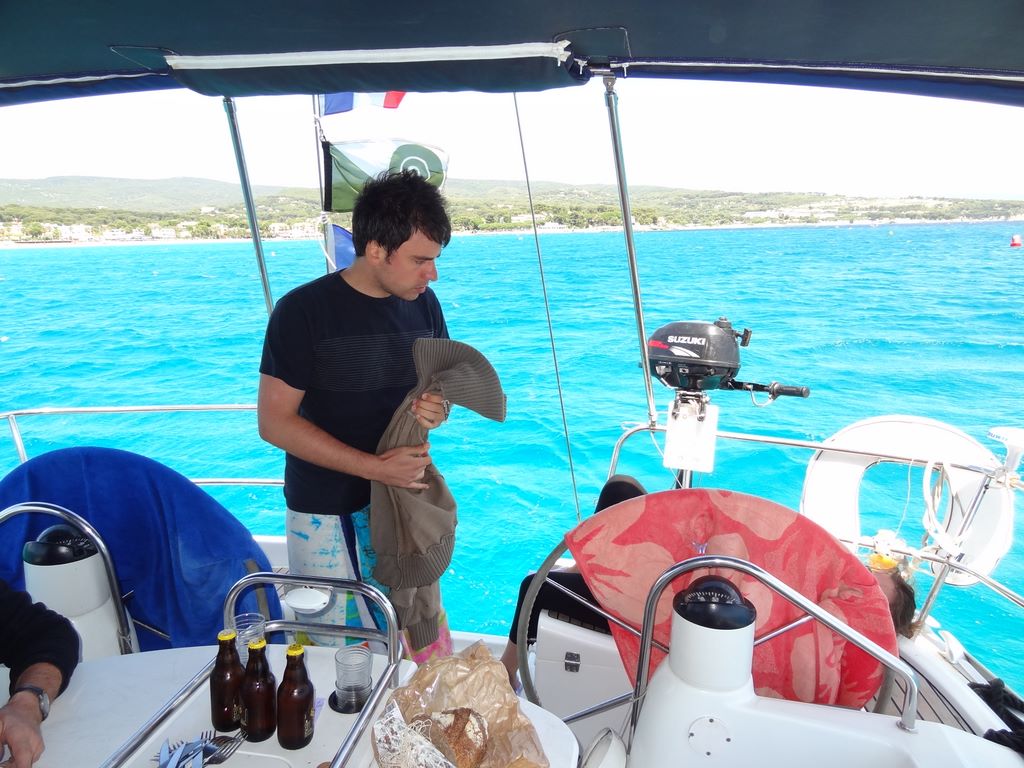 93. L'idée est qu'ensuite, il reviendra avec nous à bord pour réparer la panne. C'est Nico et moi qui partons pour la plage, couverts comme des marins (c'est à dire avec polaire et coupe vent). Notre arrivée sur le rivage sera remarqué par les estivants, tous en maillots de bain!