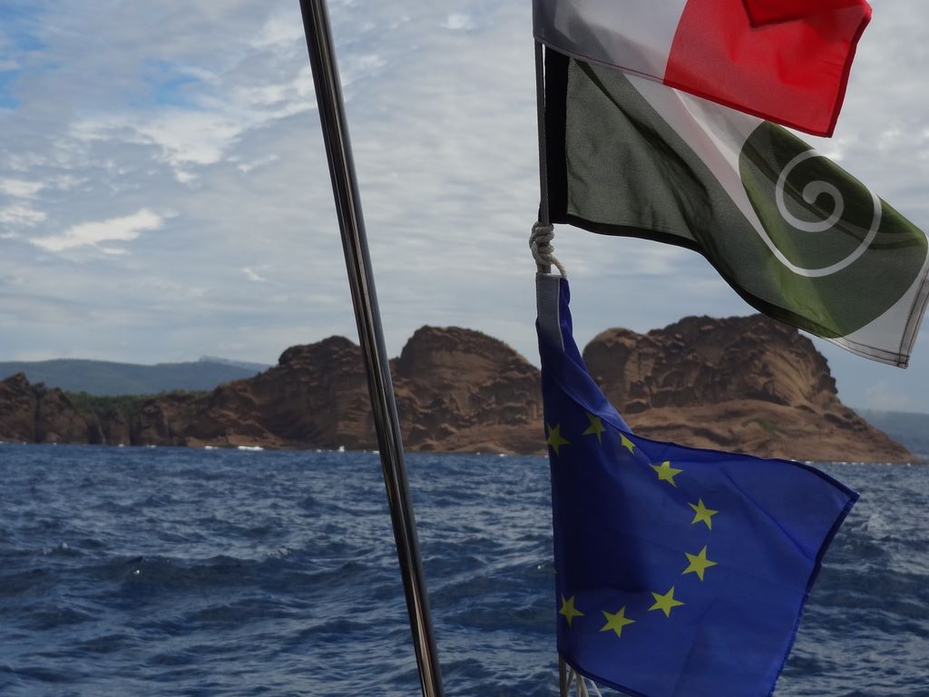 57. Sur Anne de Bretagne, il y avait un drapeau Francais. Nous y avons adjoint un drapeau Néo-Zélandais et un drapeau Européen!