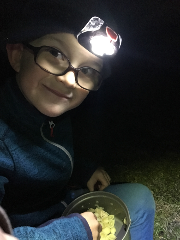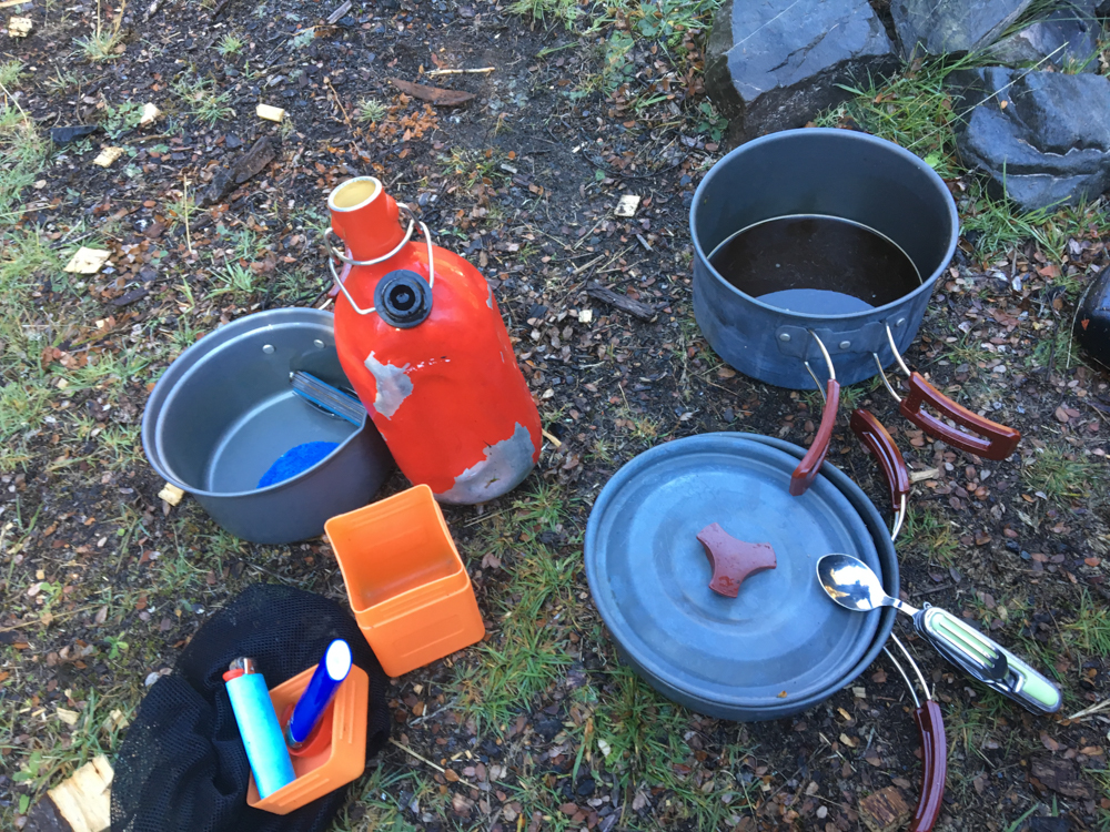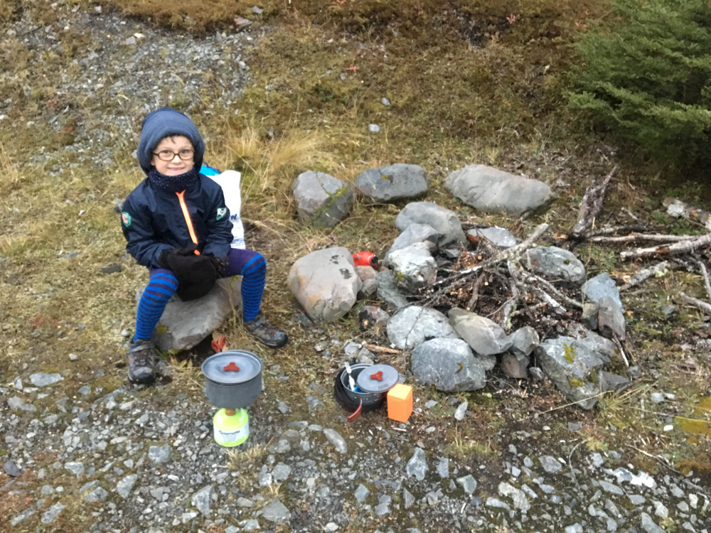 66. Arriés au refuge, on constate qu'il n'a que trois places et qu'elles sont déja prises. On plante donc rapidement la tente à côté sur un petit emplacement plat, pour profiter aussi de l'eau, et je prépare le souper. On a marché 16kms aujourd'hui, et mon garçon n'a rien dit!