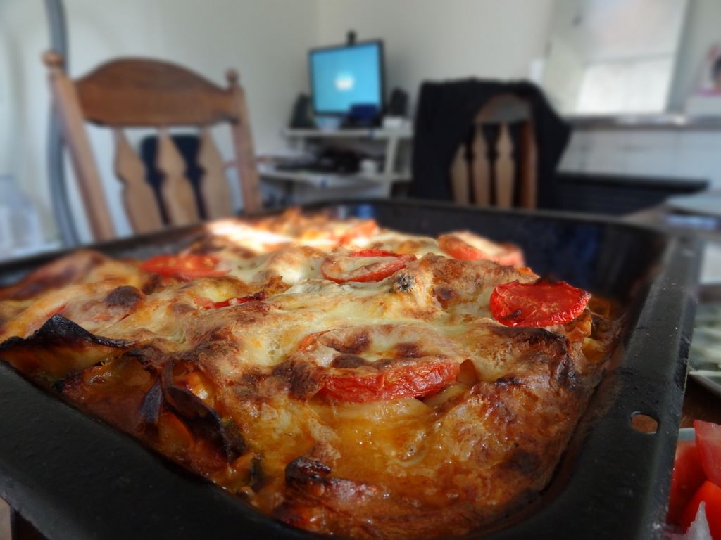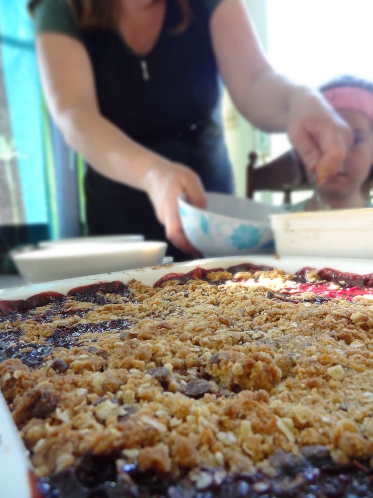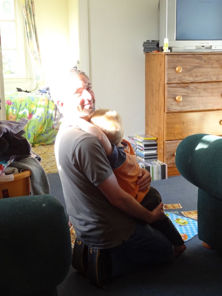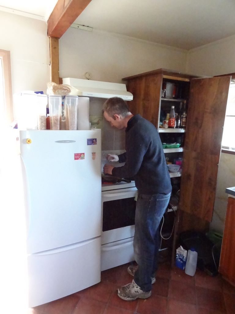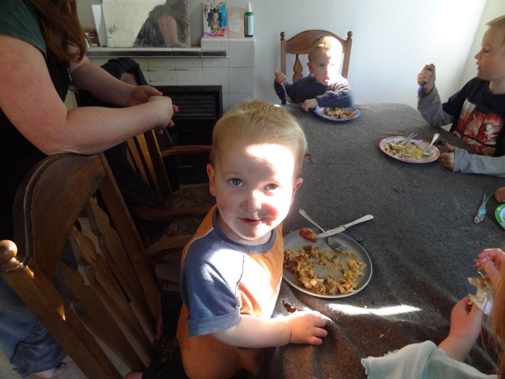86. Lundi matin, avant de repartir, Jono s'essaye à la cuisson de crêpes, dont j'ai préparé la pâte.