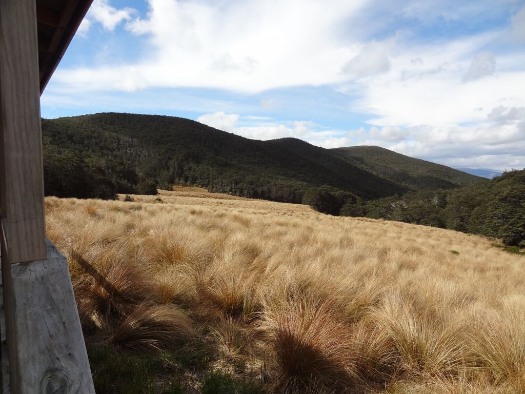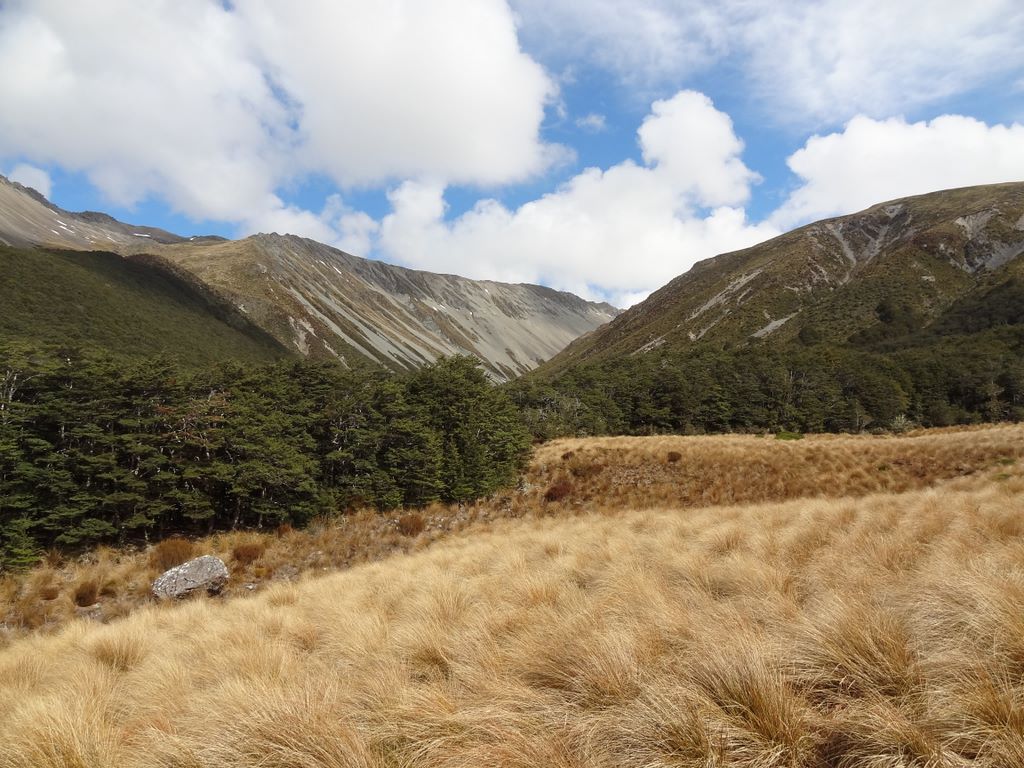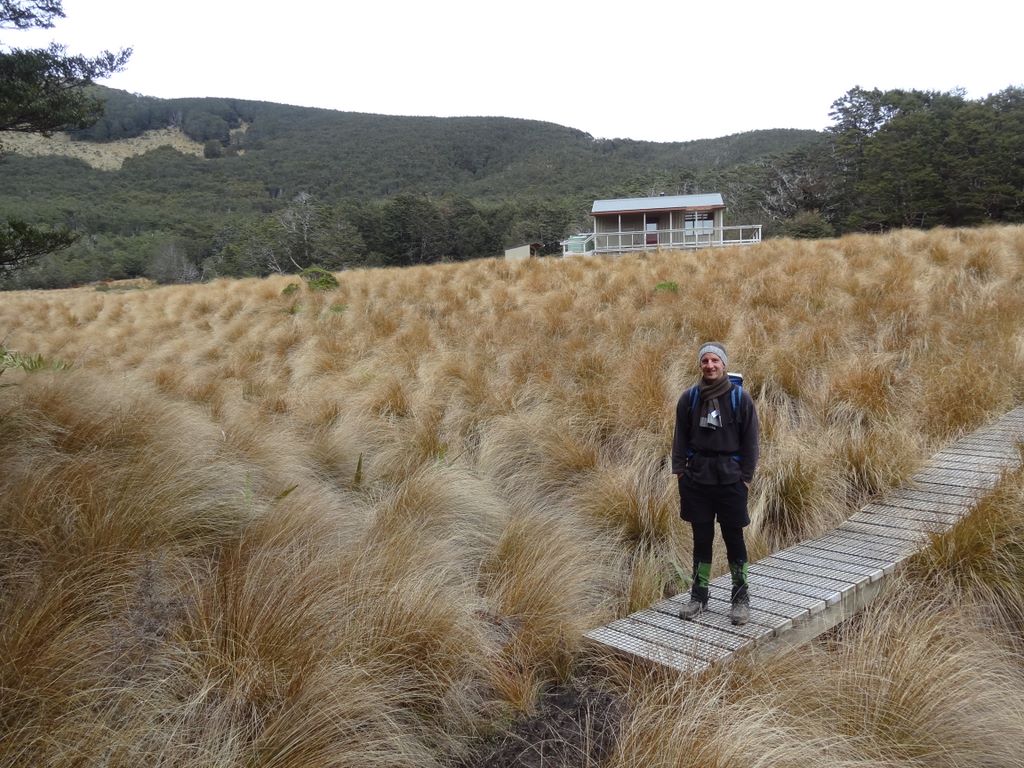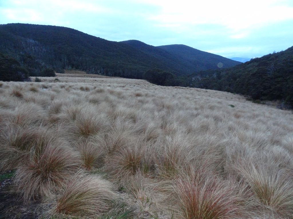 92. En bas, nous avons rejoint la Speargrass hut. J'étais aussi passé par ce refuge, il y a 5 ans, mais en arrivant par la vallée Sabine. Le champ de speargrass est toujours aussi magnifique.