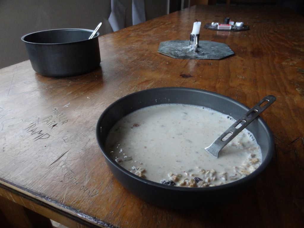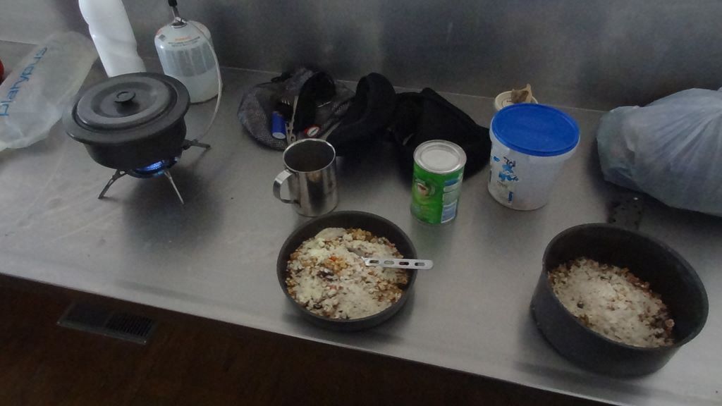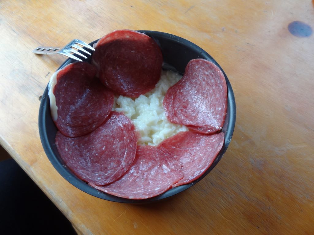 97. Changement pour le souper de ce soir: fini les pates, vive le riz à la charcuterie et à la sauce fromage! Qui a dit que la randonnée était une aventure gastronomique? Pas moi!