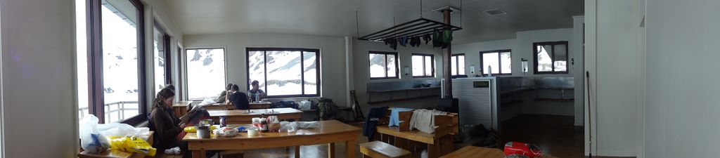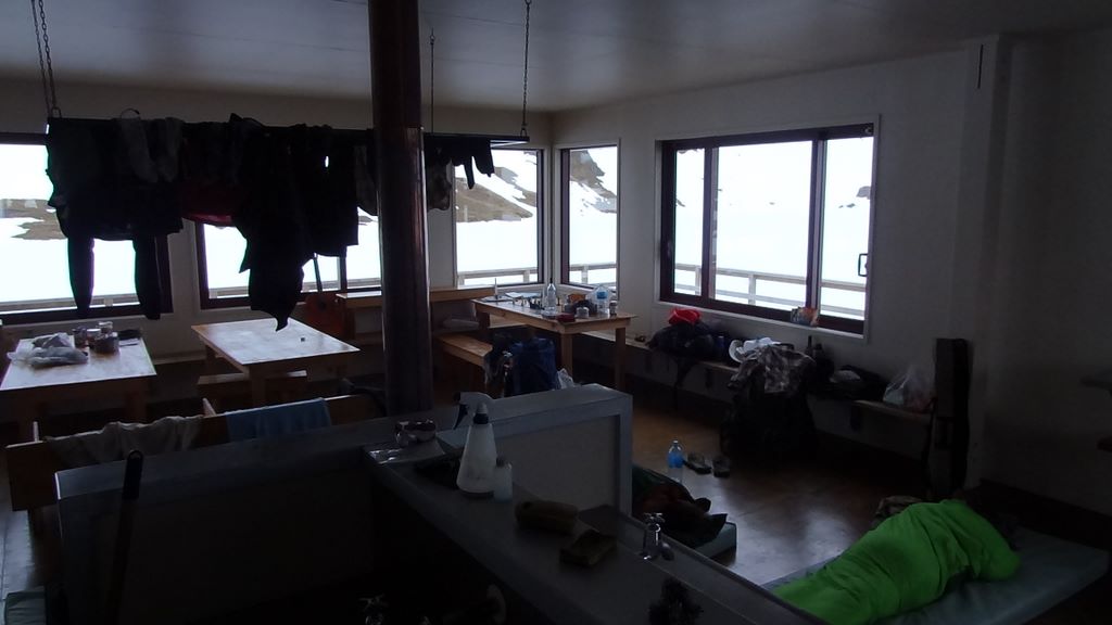 60. A l'intérieur du refuge, il y a un couple d'allemands, et un autre groupe, formé d'un allemand, d'un américain et d'un français. Il fait bon car le poêle tourne depuis longtemps.