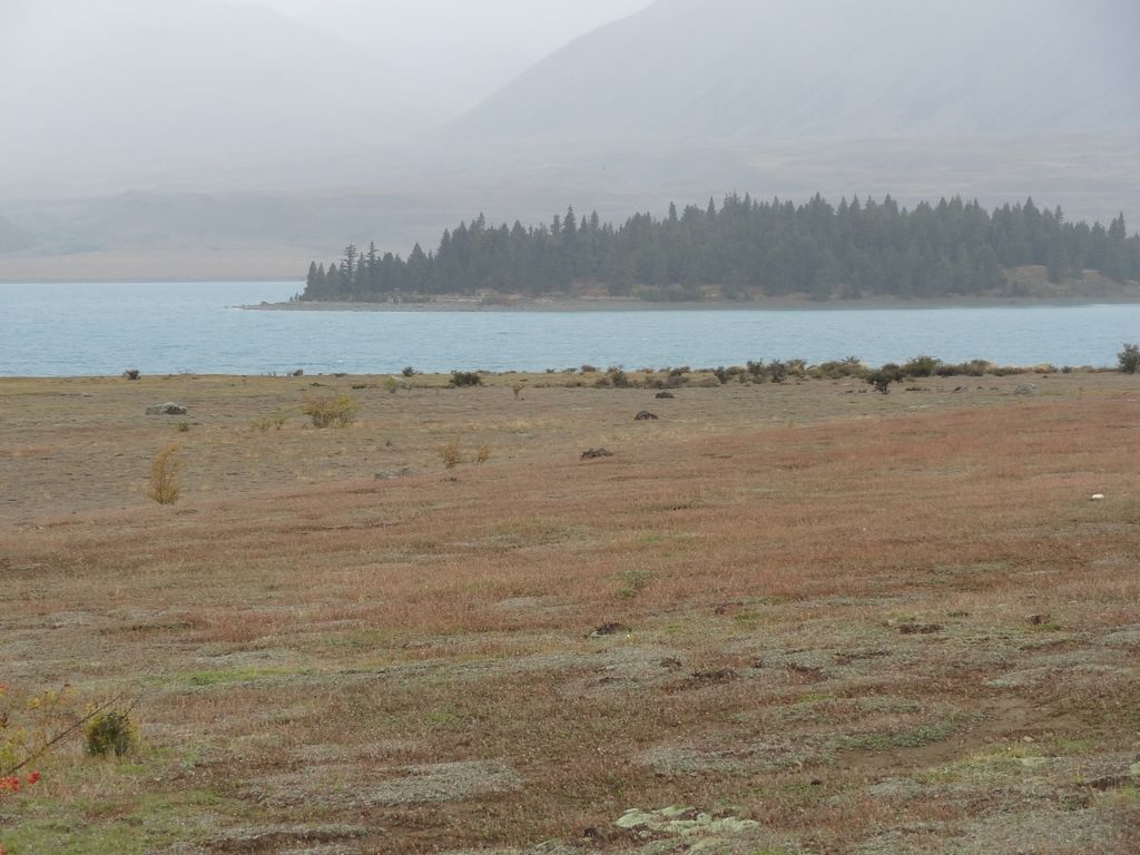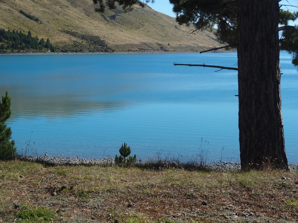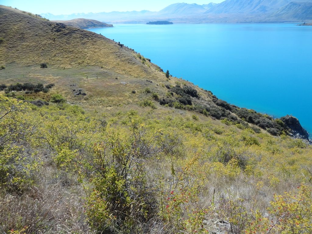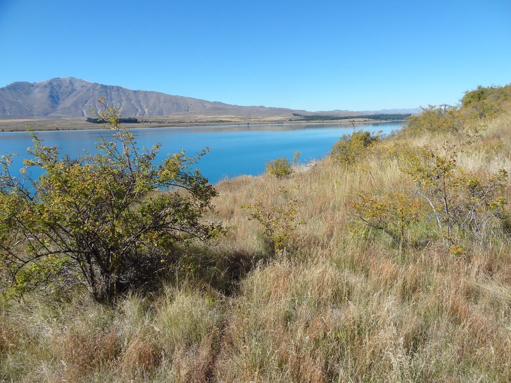 48. Les abords du lac Tekapo. Mon programme de la journee: escalader le mont St John ce qui devrait me donner de jolis points de vue sur le lac.
