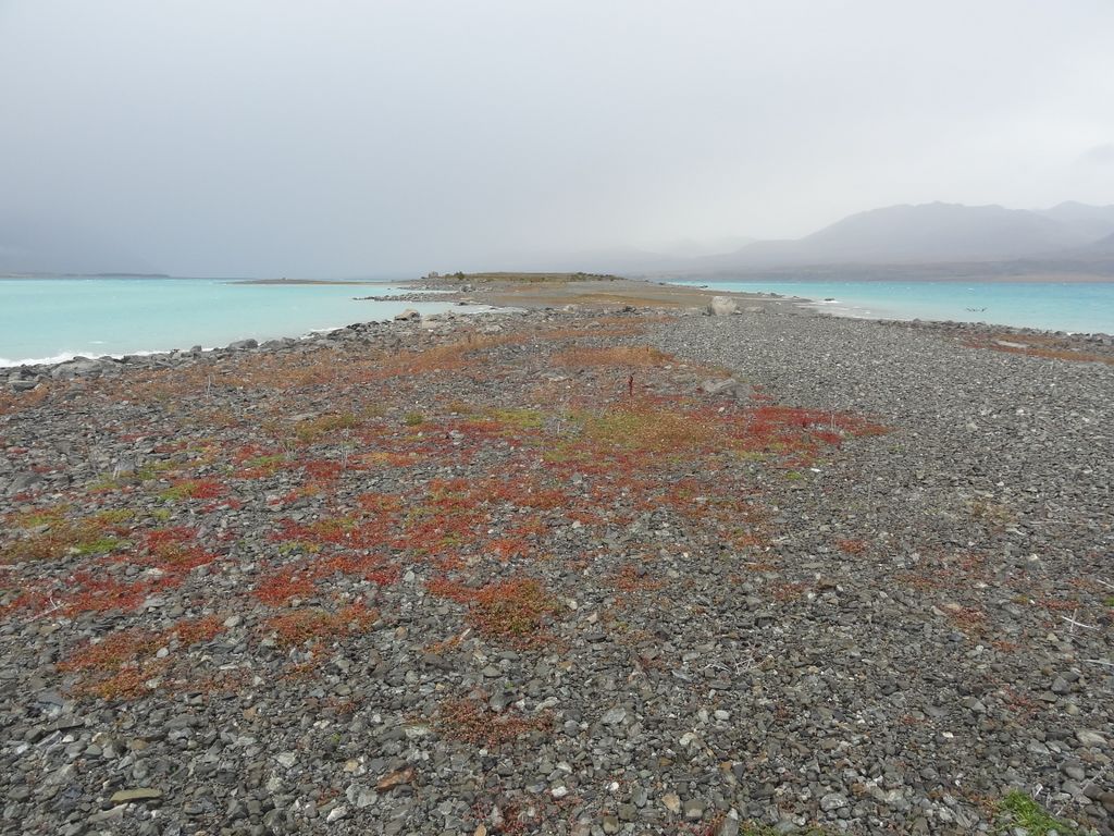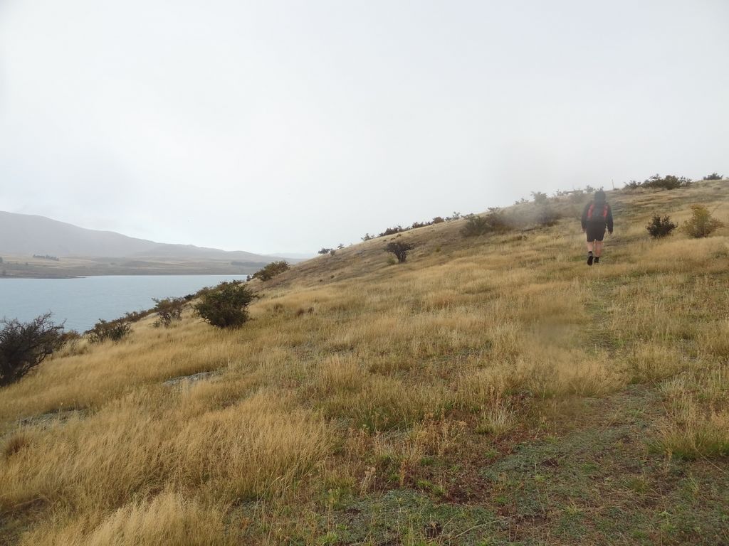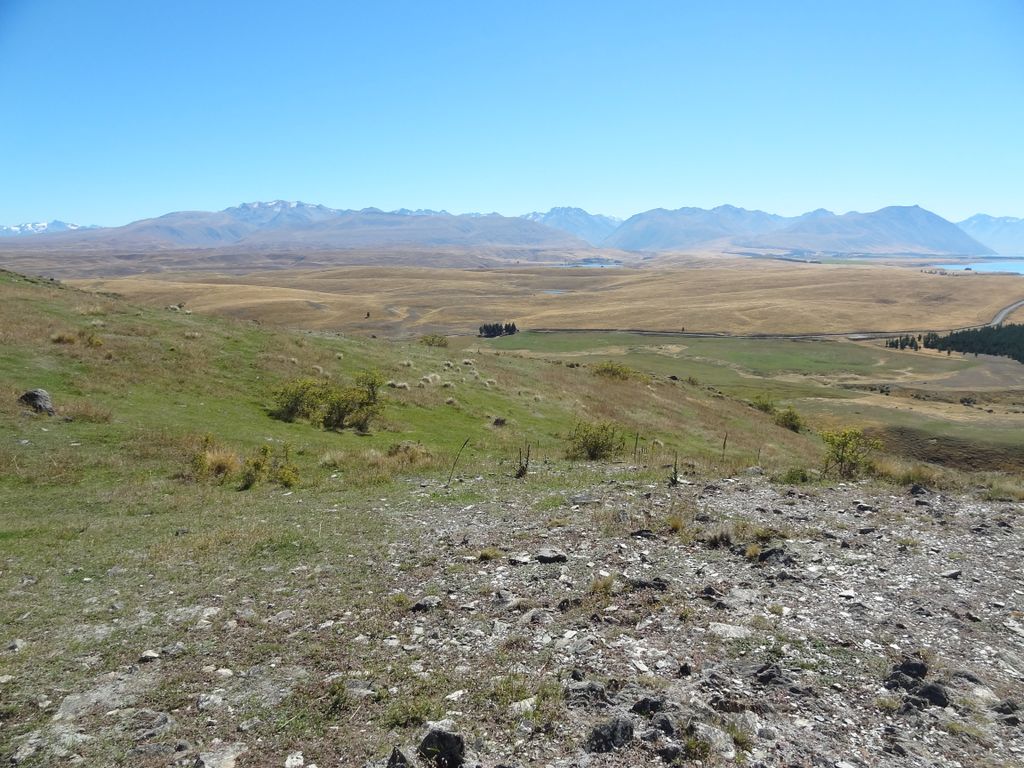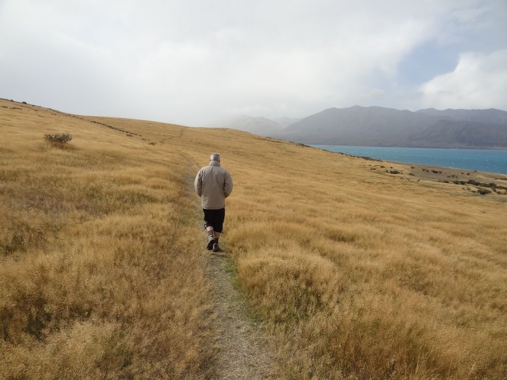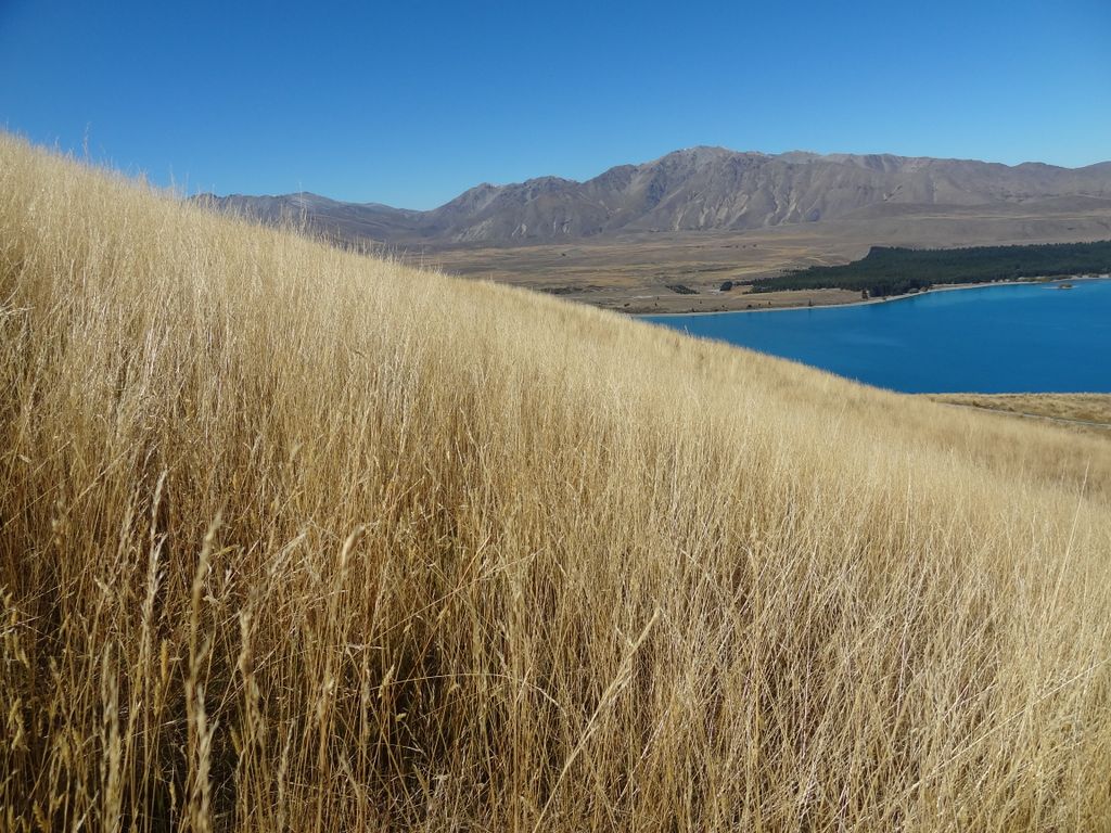 48. Les abords du lac Tekapo. Mon programme de la journee: escalader le mont St John ce qui devrait me donner de jolis points de vue sur le lac.