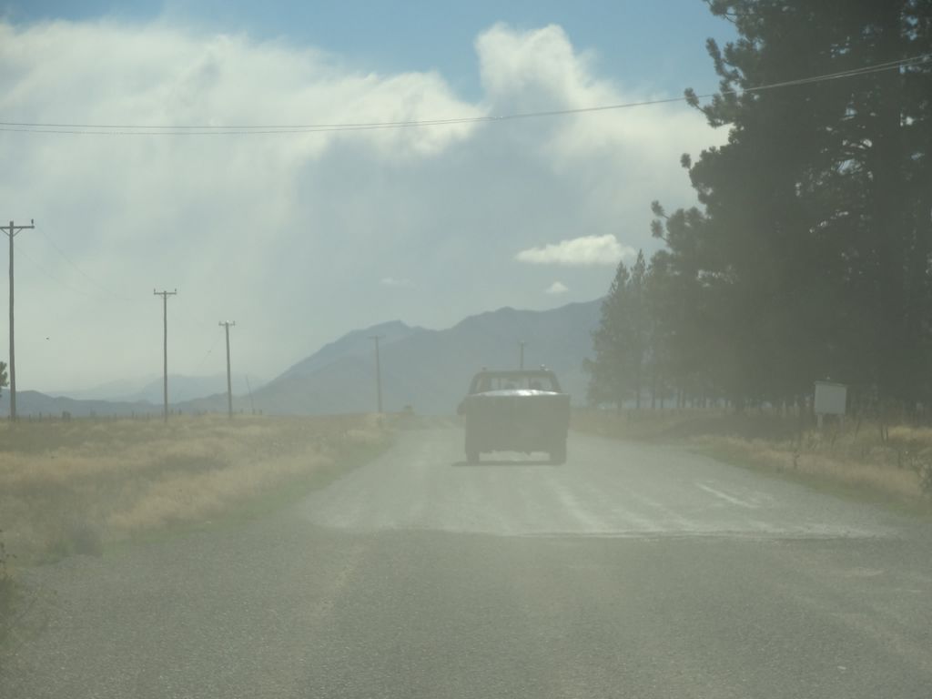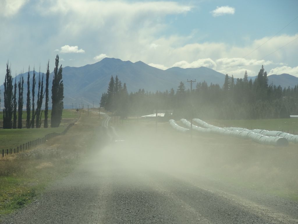 80. Vision classique sur les gravel roads de Nouvelle Zelande. On suit une voiture qui, comme nous, souleve un max de poussiere. Cette fois, notre predecesseur ...