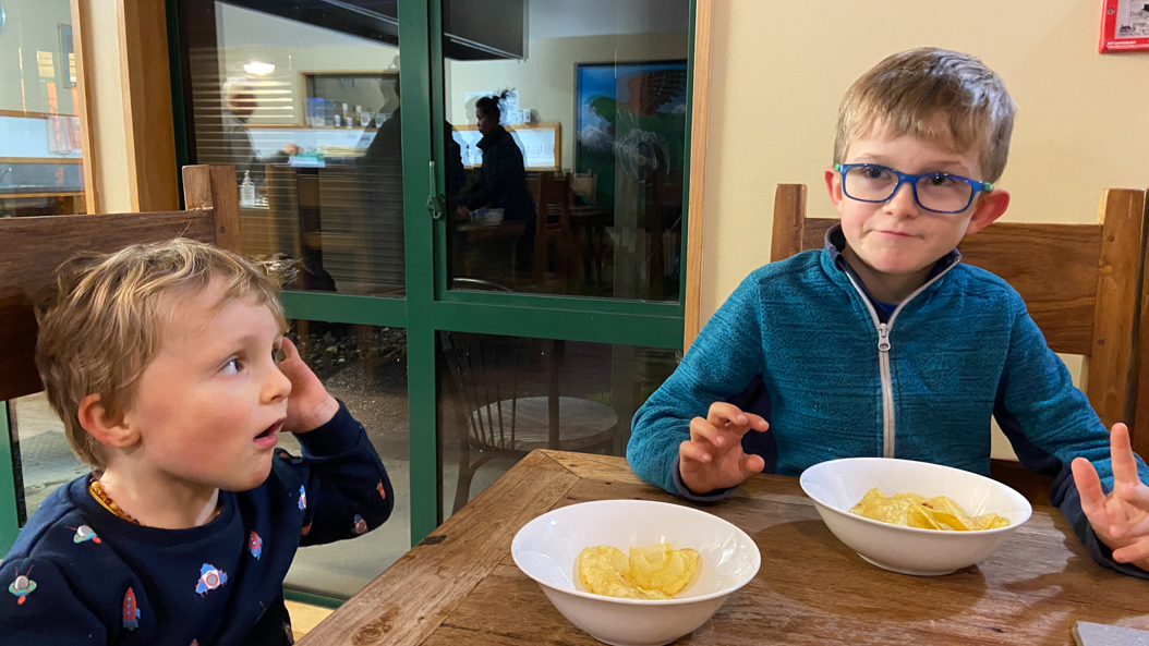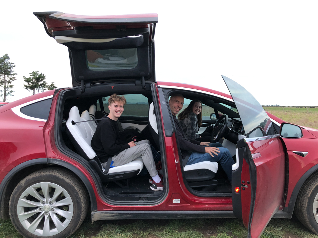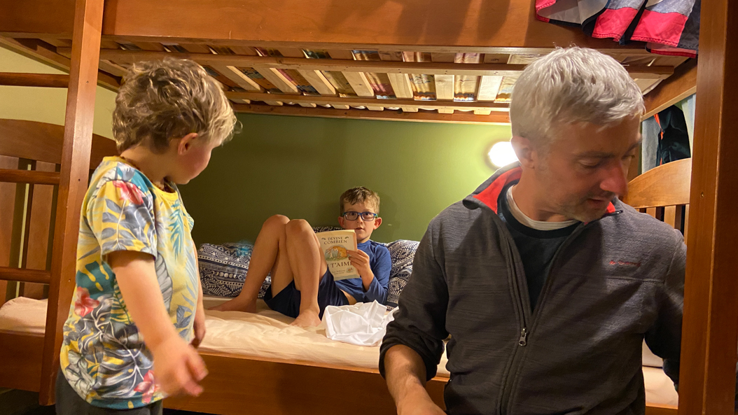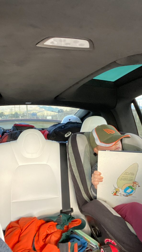 123. Le chargeur pour la voiture ne fait que 25kW, au lieu de 50. Il nous faut deux heures pour faire le plein, mais on en profite pour donner du bon temps aux enfants.