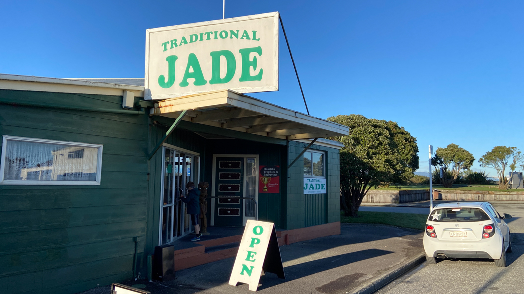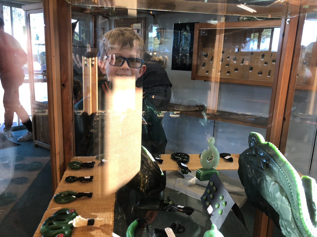 85. A Hokitika, Seb souhaite m'offrir un nouveau koru. Nous retournons à notre petite échoppe, loin des supermarchés du jade.