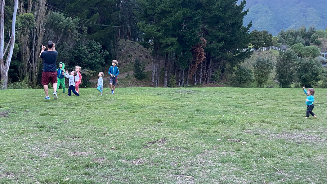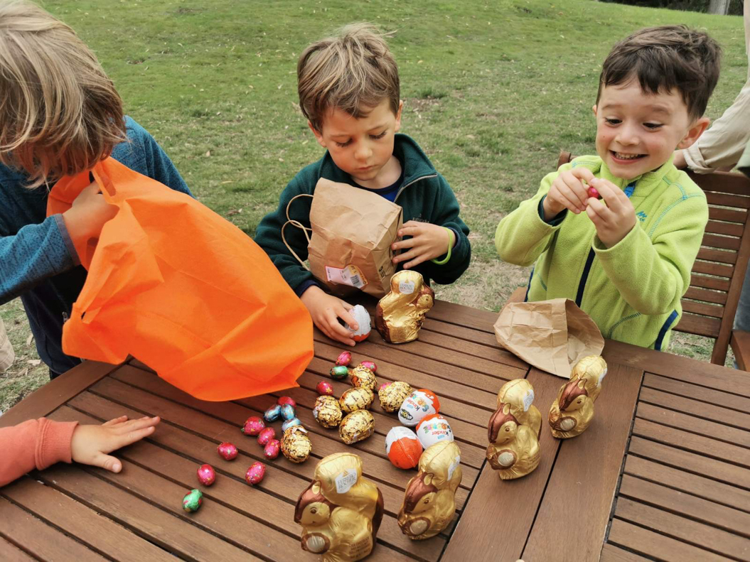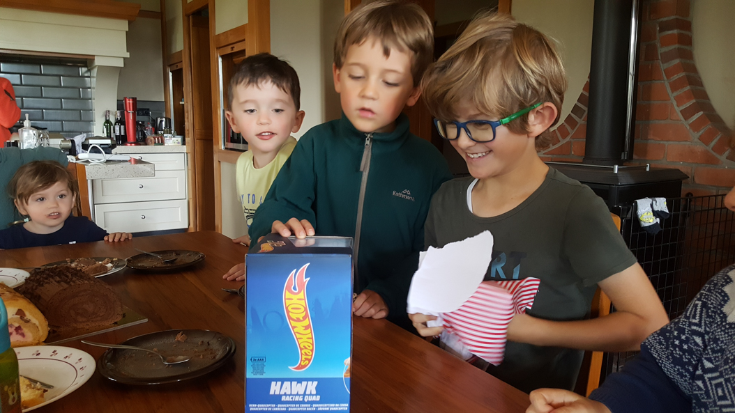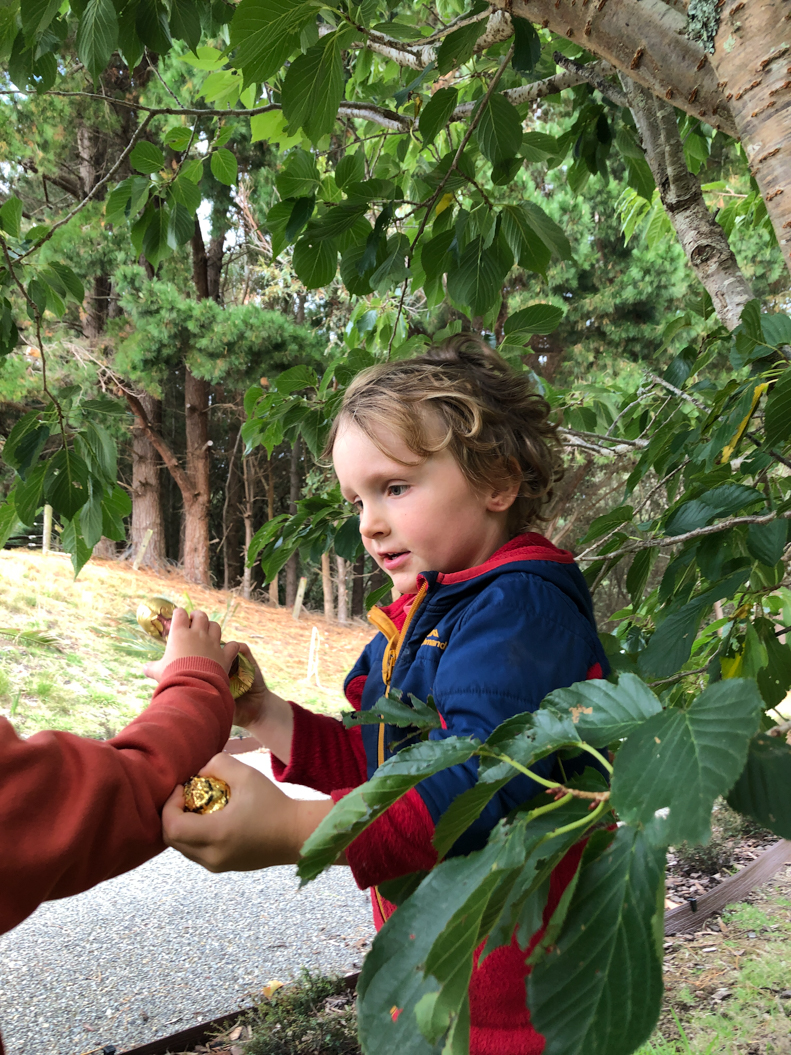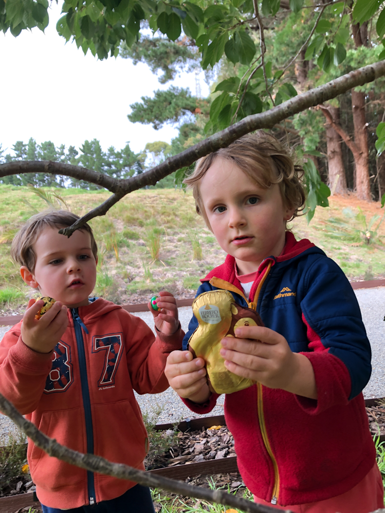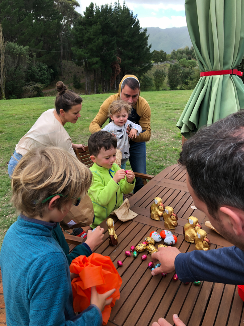 Pour la deuxième année consécutive, nous sommes allés passer le weekend dans cette grande maison au calme, un peu en retrait de la mer à Waikanae. Il y avait Nico et Lolo et leurs familles respectives, donc forcément, un grand moment pour les cousins! On en a profité aussi pour fêter l'anniversaire d'Adan qui, bien qu'un peu malade, s'est senti bien entouré et aimé ce weekend. Et puis bien sur, il y a eu la chasse aux oeufs: celle-ci s'est bien passée garce a l'établissement d'un jeu de règles bien précis et clairement énoncés avant le lachage des enfants dans le jardin! Juste un peu dommage que Seb se soit fait repérer un peu avant en train de "chercher son téléphone dans le jardin"!