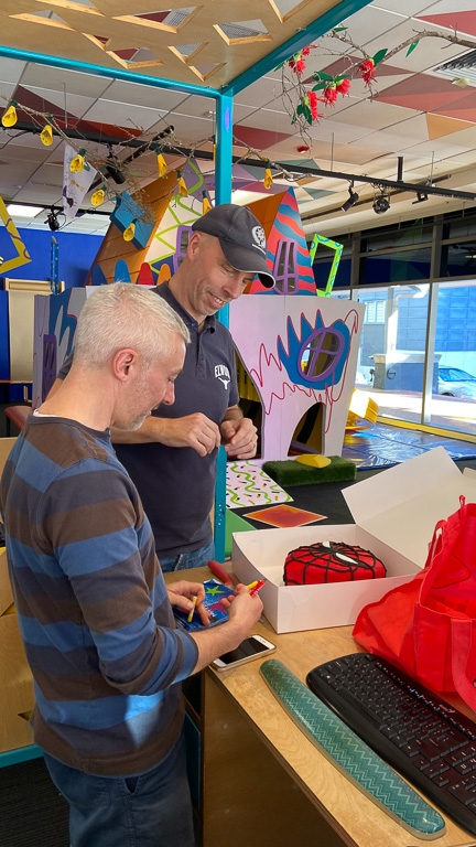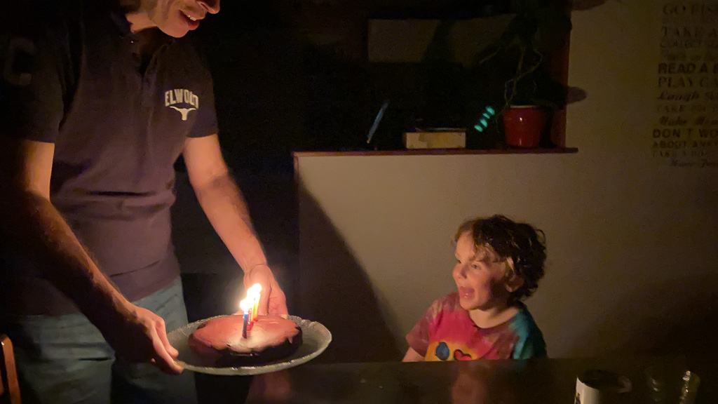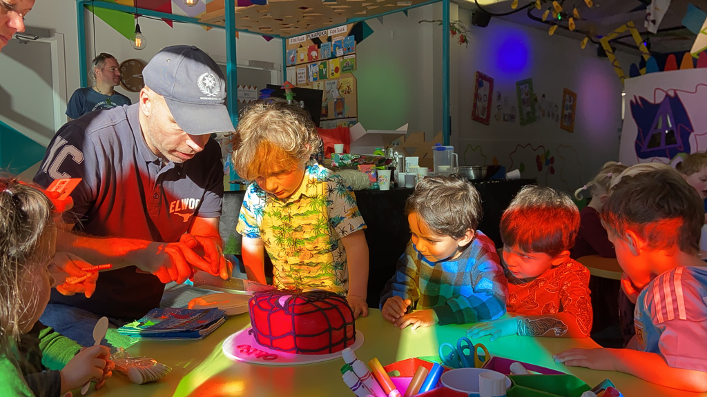 24. Au moment du gateau, Cosmo se cogne la tete avec un copain, ce qui le destabilise un peu. Mais tout le monde chante.