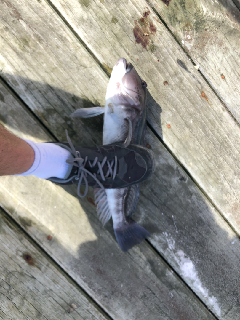 17. Pendant que certains s'occupent de retablir le courant, d'autres pechent le repas du soir. Adan chope son premier blue cod, un beau bestiau de 35 centimetres