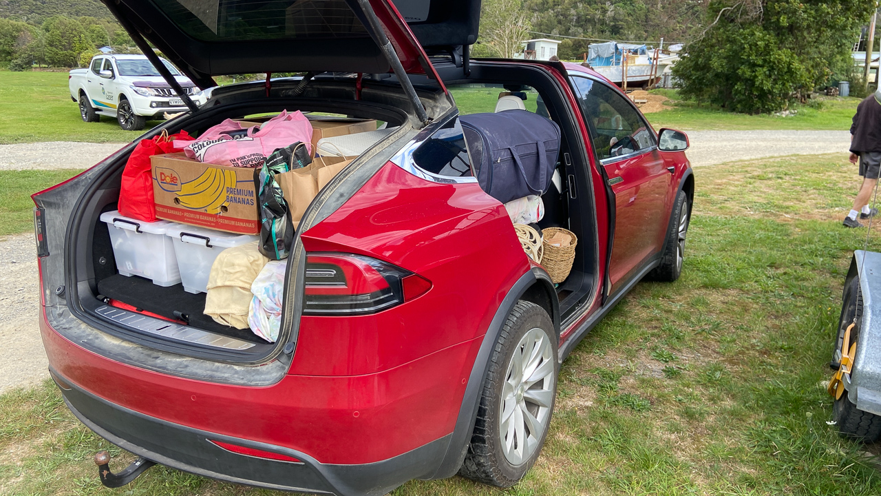 1. La voiture, bien trop pleine, avec de la nourriture, des planches pour une table, et une antenne satellite!