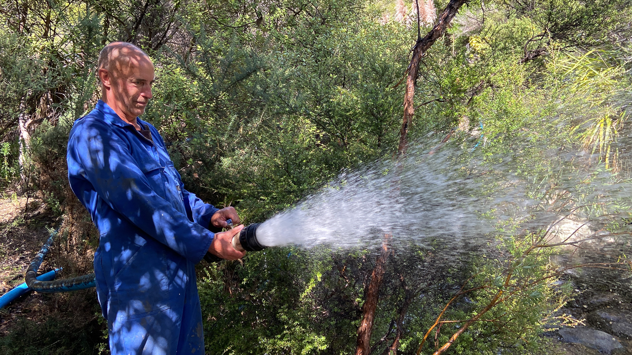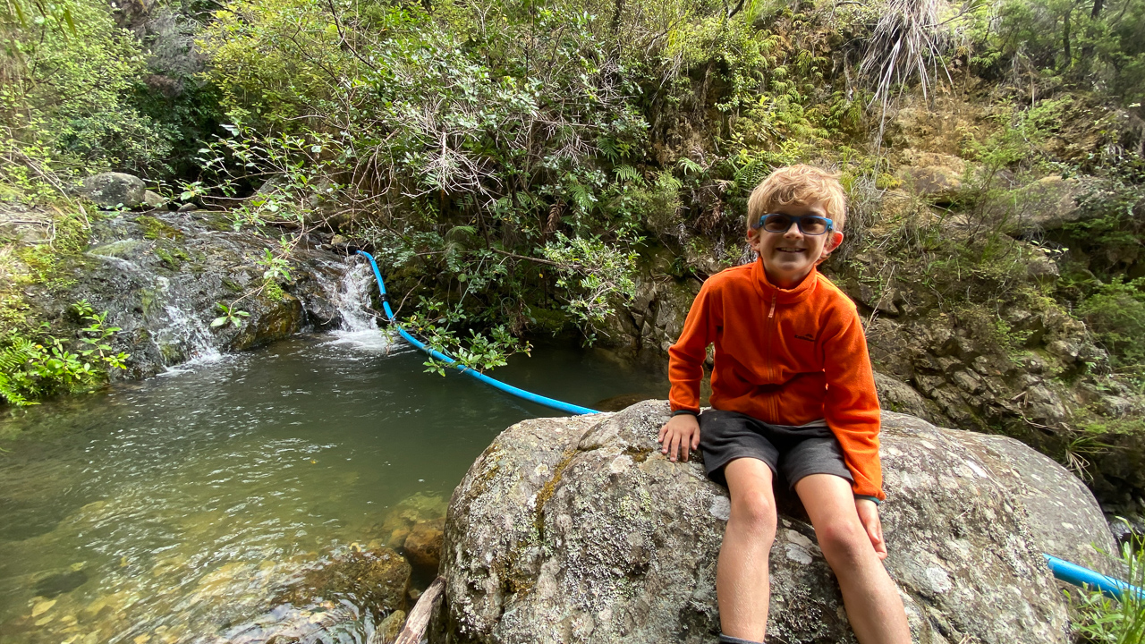 15. Ca fait plusieurs heures que Graeme et moi tentons de remplir ce tuyau, et nous pensons tenir le bon bout. En redescendant de la riviere, je vois, pour la premiere fois, cette superbe vallee ou l'on distingue discretement notre maison