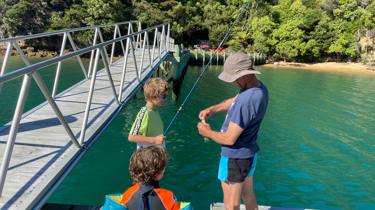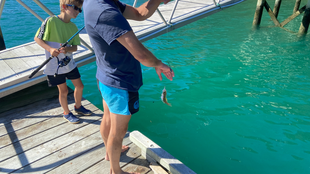 24. Mercredi soir. Graeme, avant de nous faire visiter son bateau et avant le diner, passe un peu de temps avec Adan pour lui montrer comment pecher.