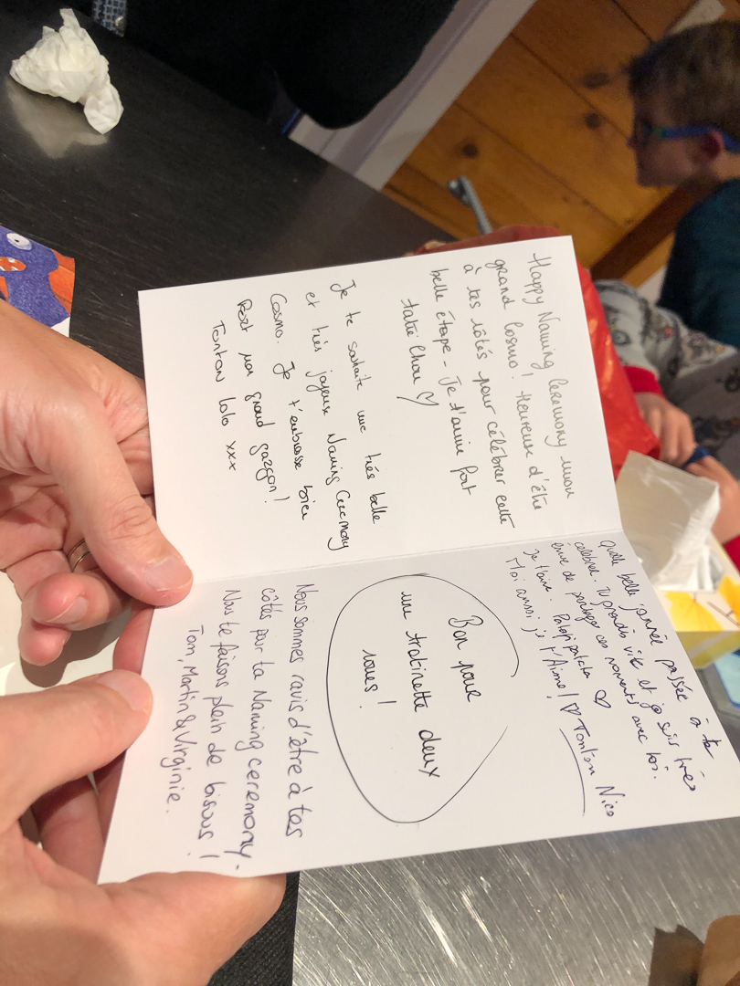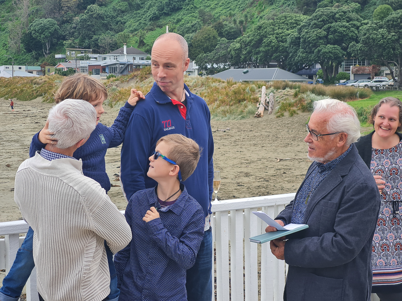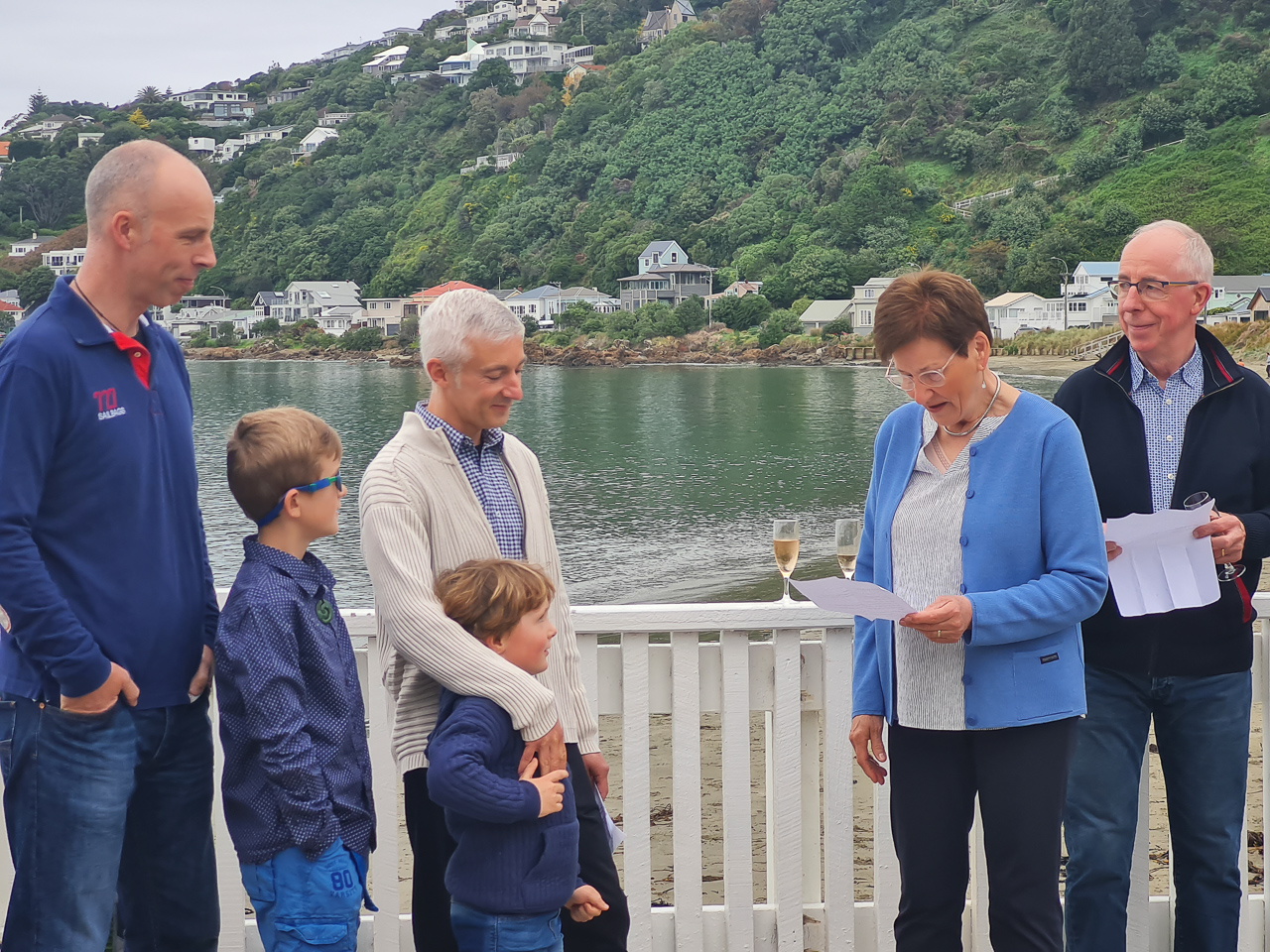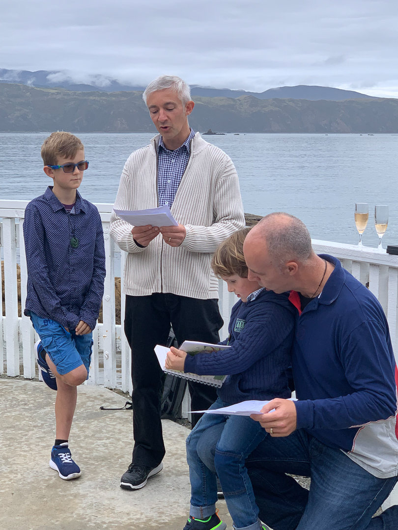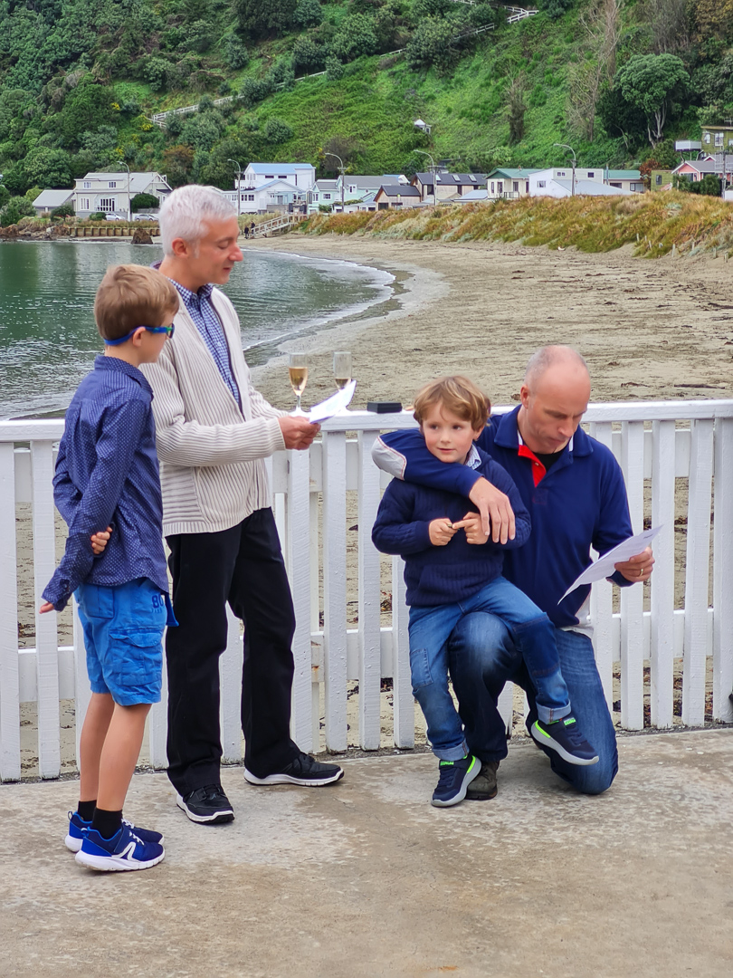 A l'approche des 5 ans de Cosmo, et profitant de la presence des parents, nous avons organise le bapteme civil de Cosmo. Le petit gars etait tout remonte et on pouvait voir a quel point il goutait chaque seconde de cette journee. La meteo ne nous a pas permis de faire ca a la maison, alors on s'est rattrape sur le surf club de Worser Bay, la ou Seb et moi nous etions maries, en 2014. Tous les acteurs de cette super journee etaient la, y compris Roy, notre ami et celebrant, toujours present pour les grands moments de notre famille.