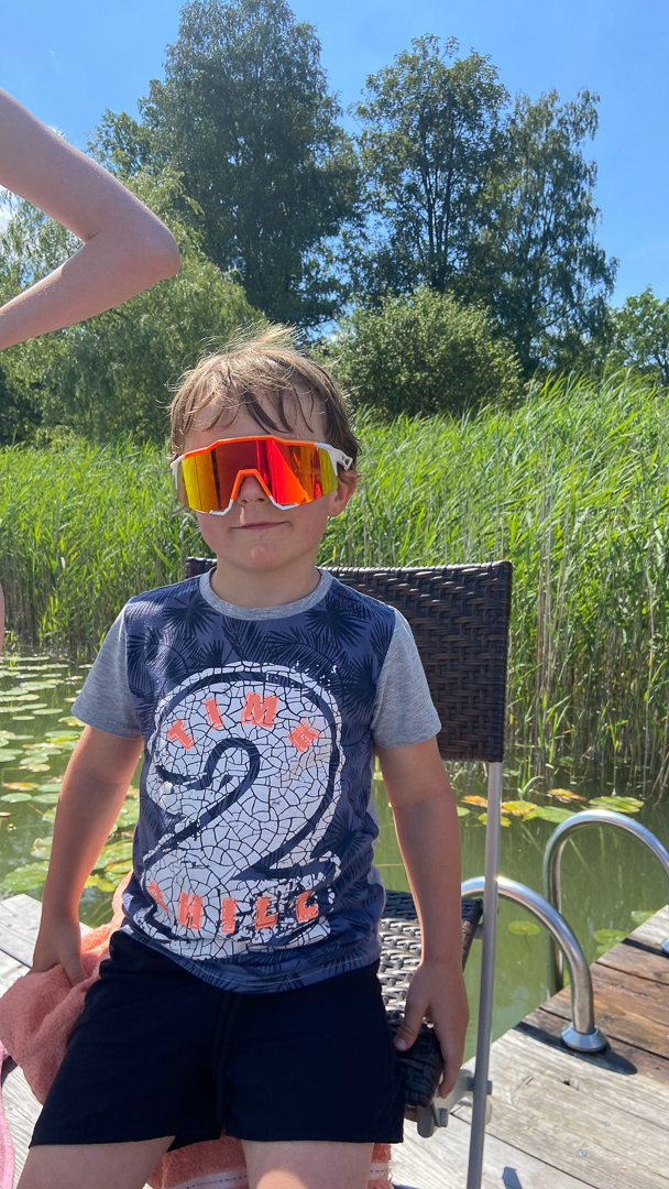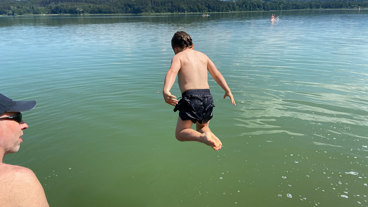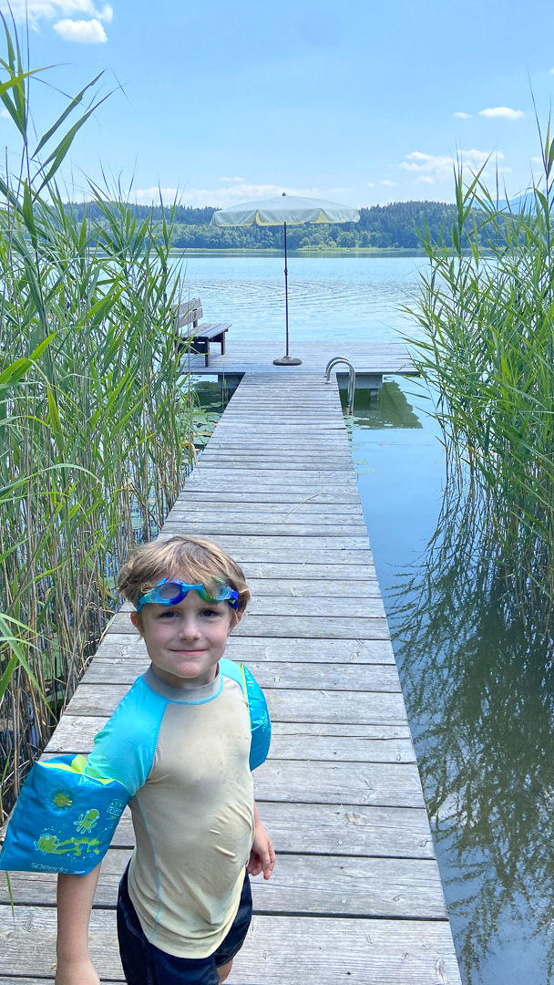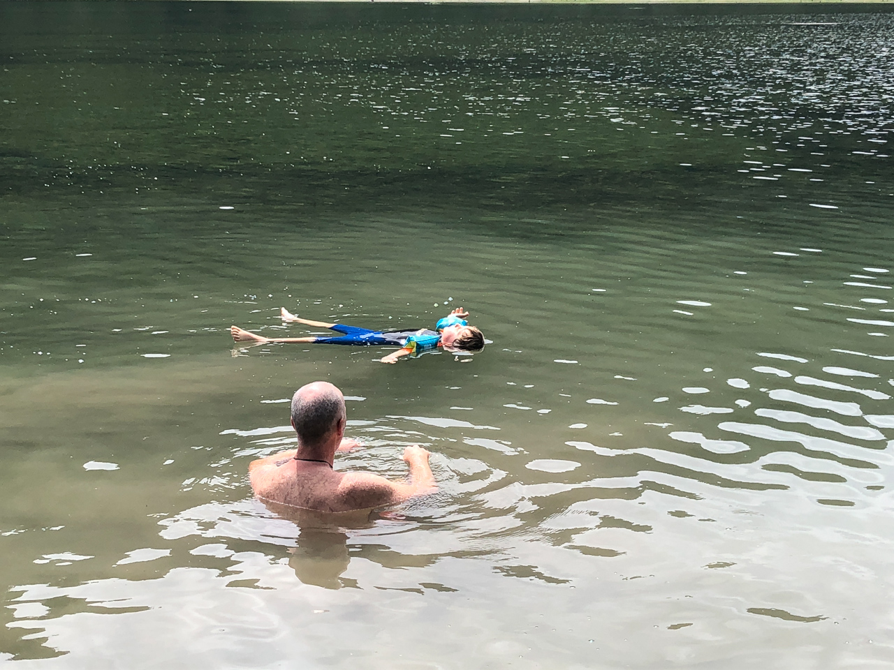 196. Cosmo a decide qu'il sauterait dans l'eau (ou il n'a pas pied) sans ses brassards. C'est donc en ce jour de Juillet 2022 qu'il sait nager!