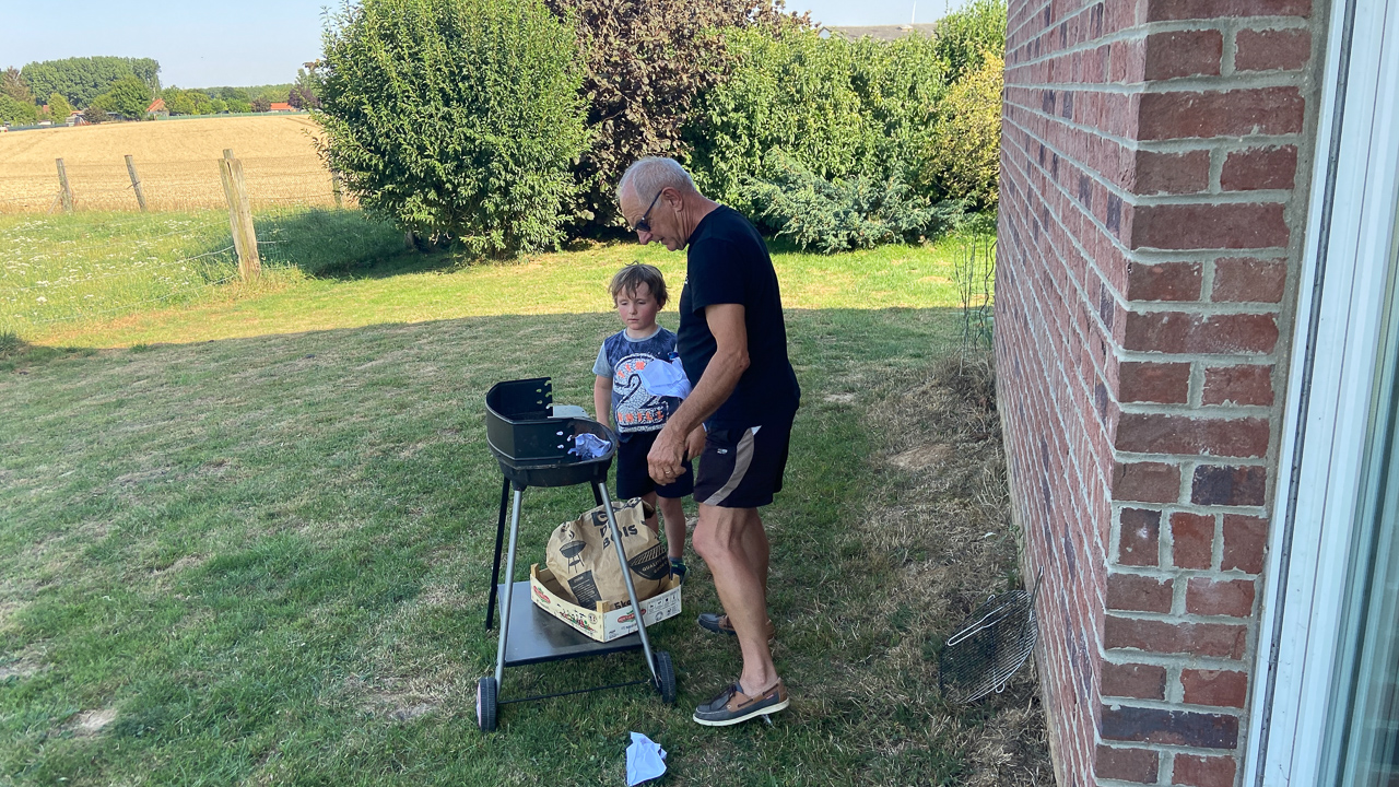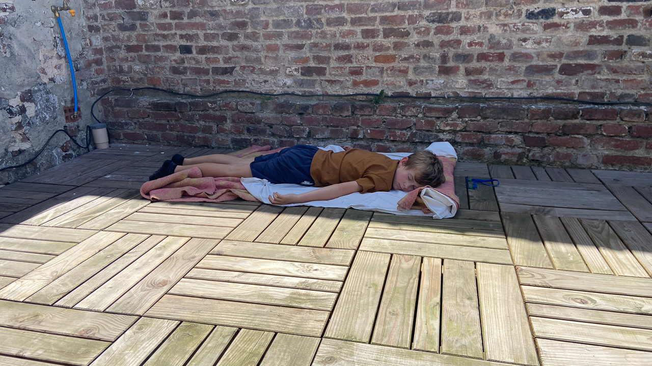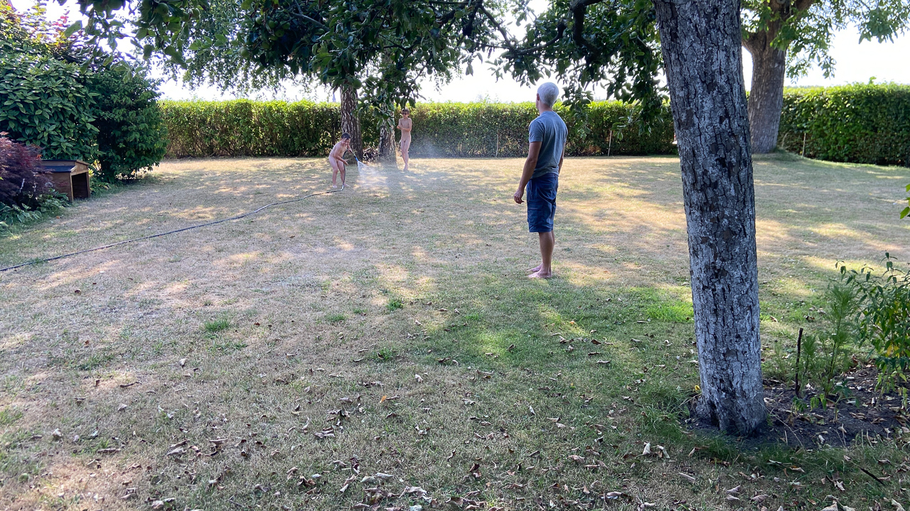 217. 40 degres a Sainghin. C'est la canicule. Alors on raffraichit les enfants sur la pelouse avec le jet d'eau