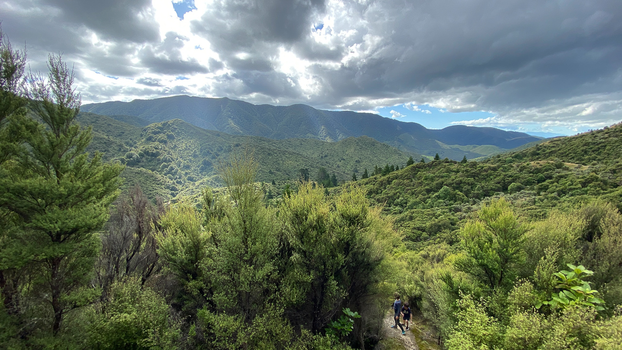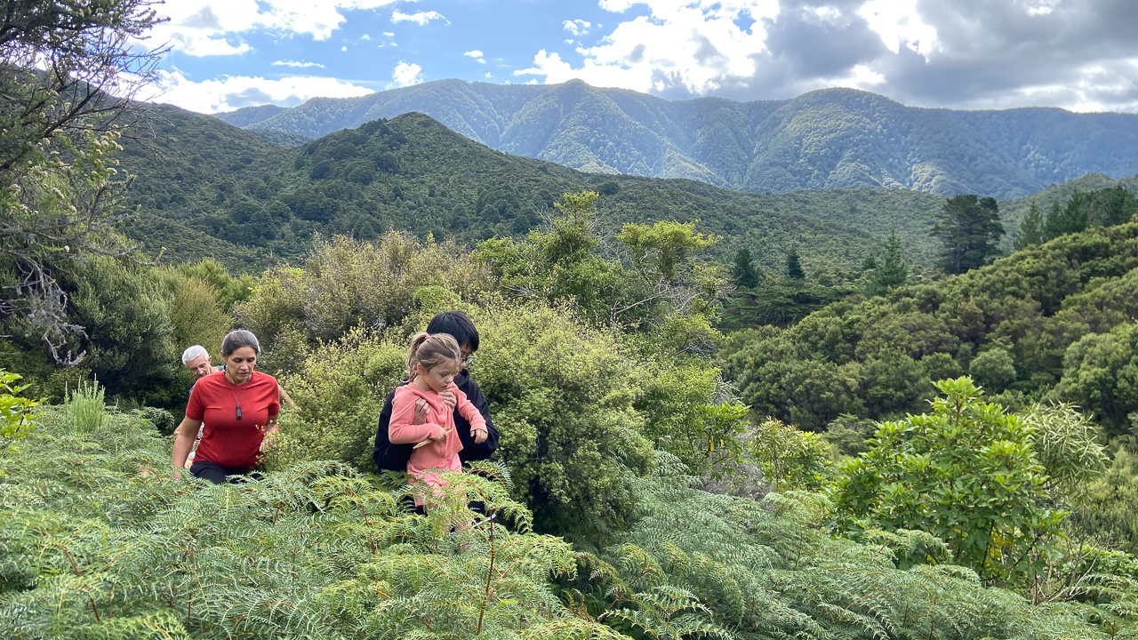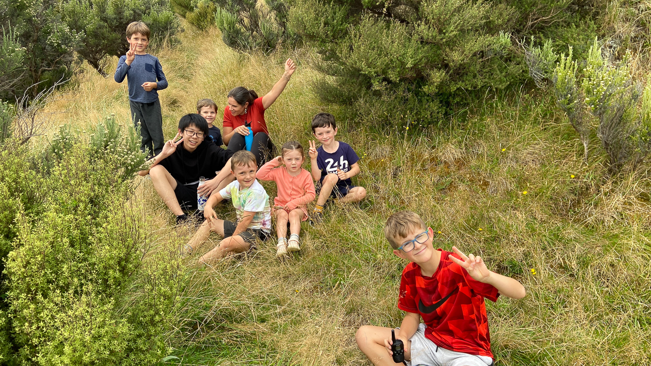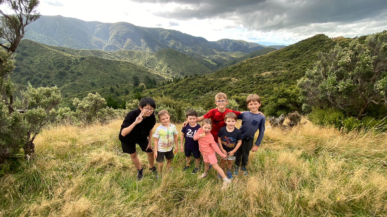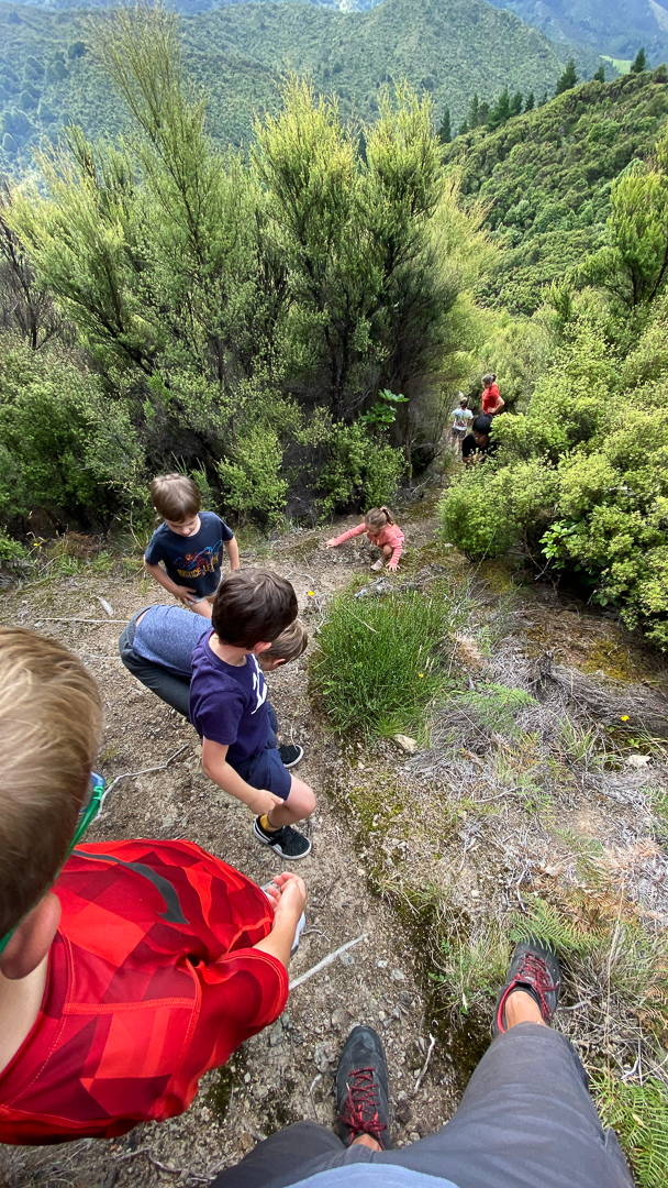 16. A peine arrives a Waikuku Lodge, on part explorer le bush alentour. On trouve un sentier qui monte jusqu'a une crete autour de la maison. C'est tres pentu, mais tout le monde suit!