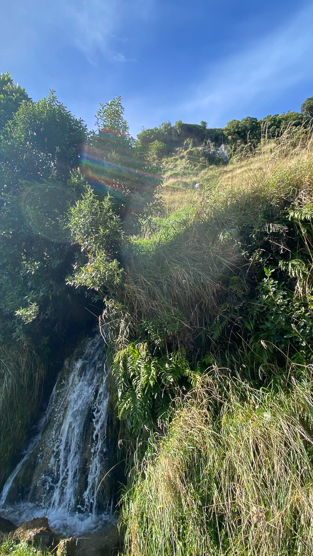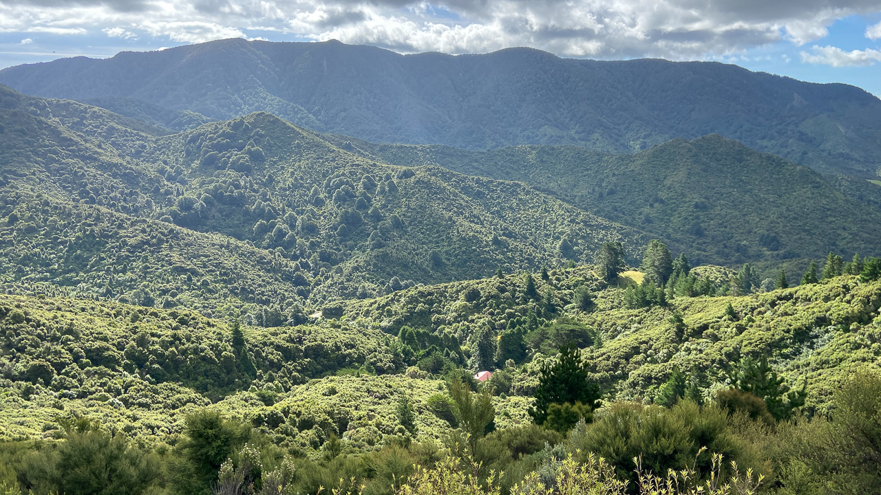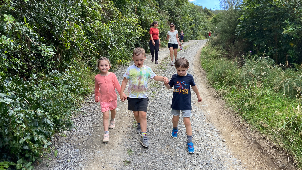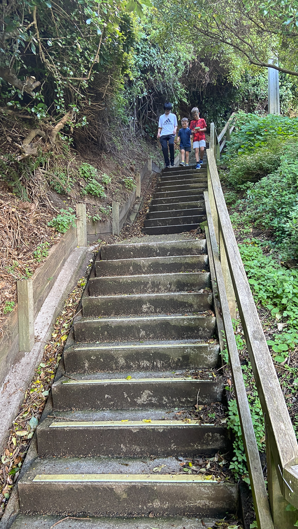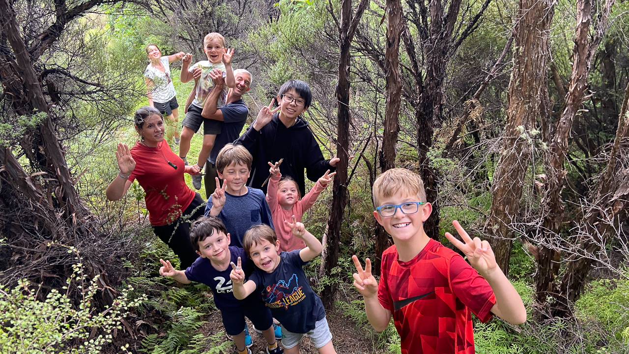 16. A peine arrives a Waikuku Lodge, on part explorer le bush alentour. On trouve un sentier qui monte jusqu'a une crete autour de la maison. C'est tres pentu, mais tout le monde suit!