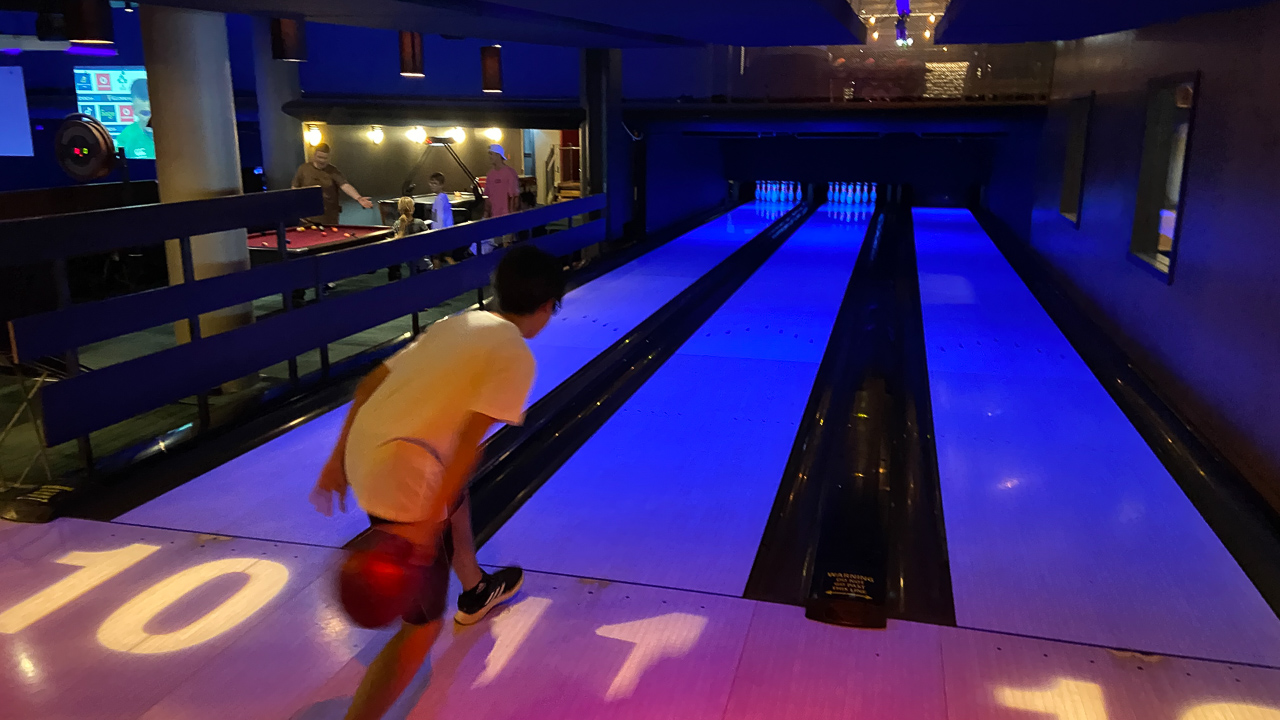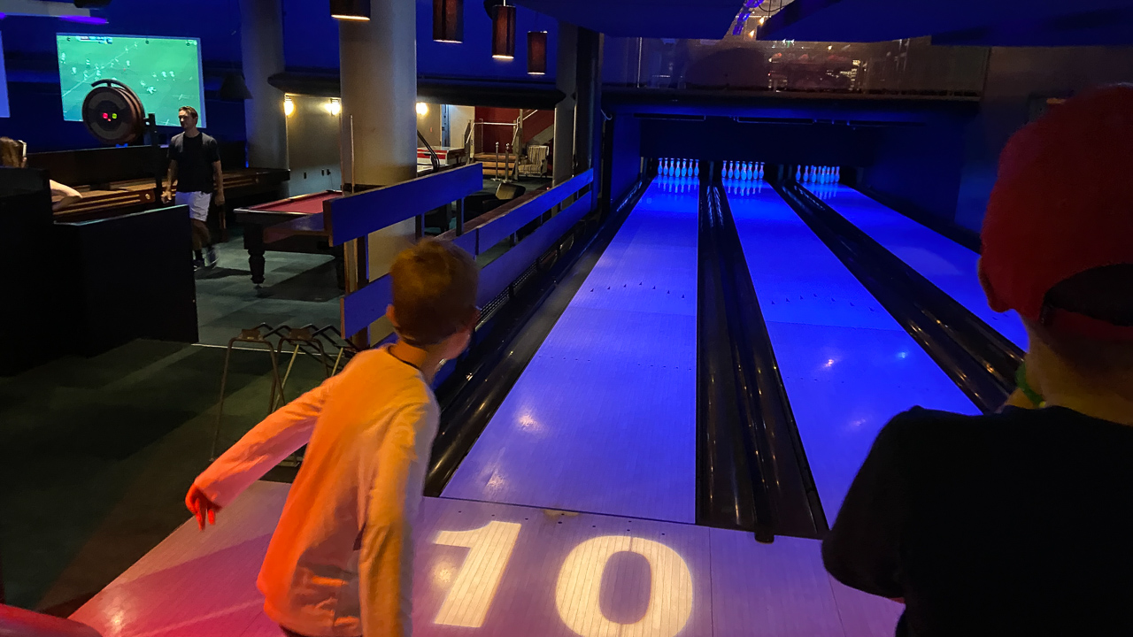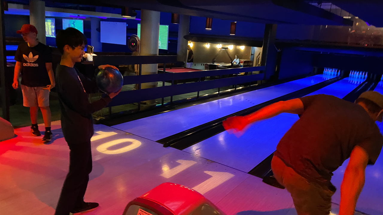 89. Dimanche apres-midi, on offre un peu de simplicite a nos etudiants japonais en les emmenant tous au bowling.
