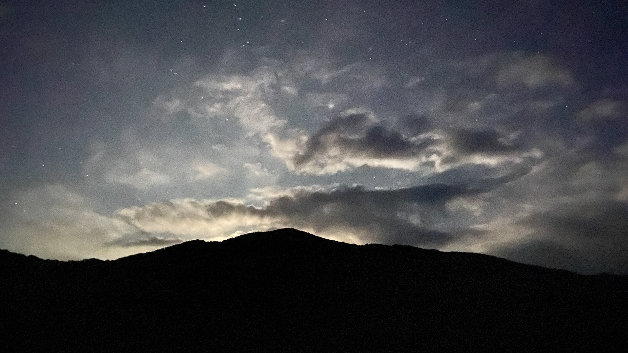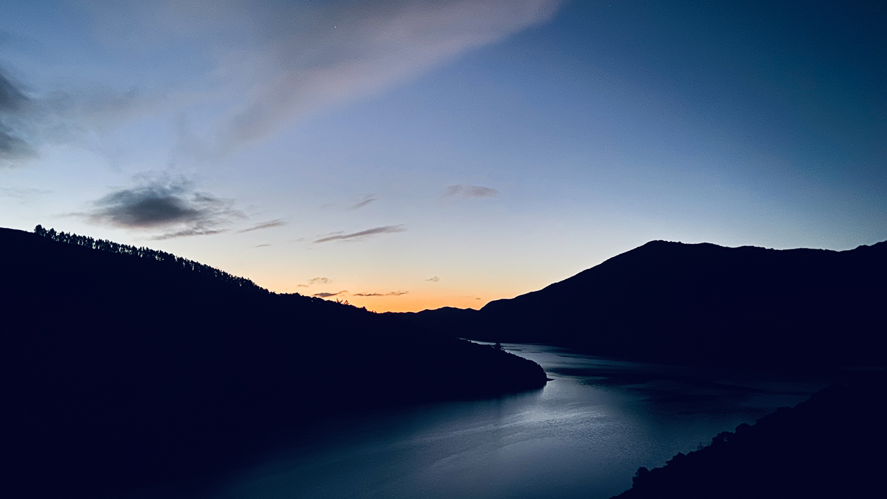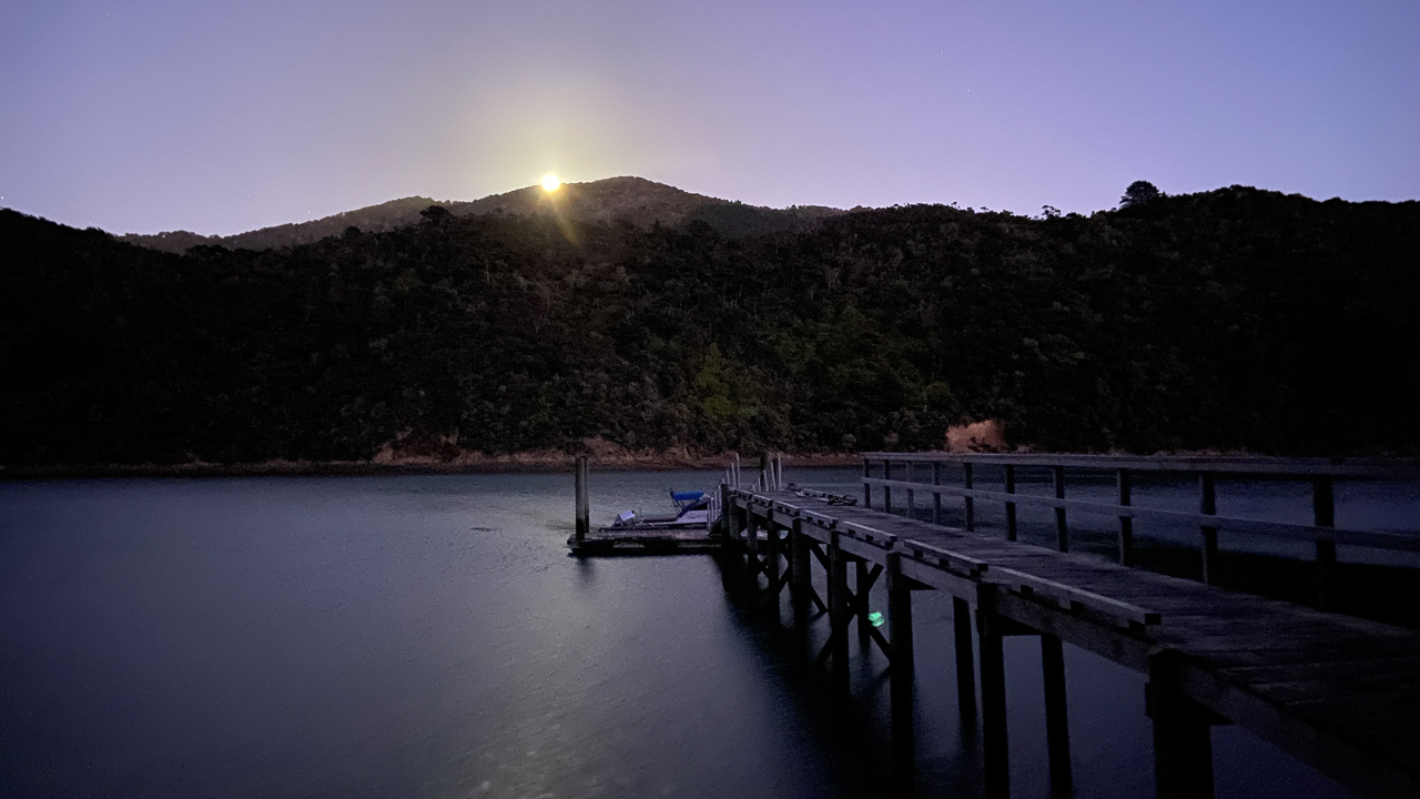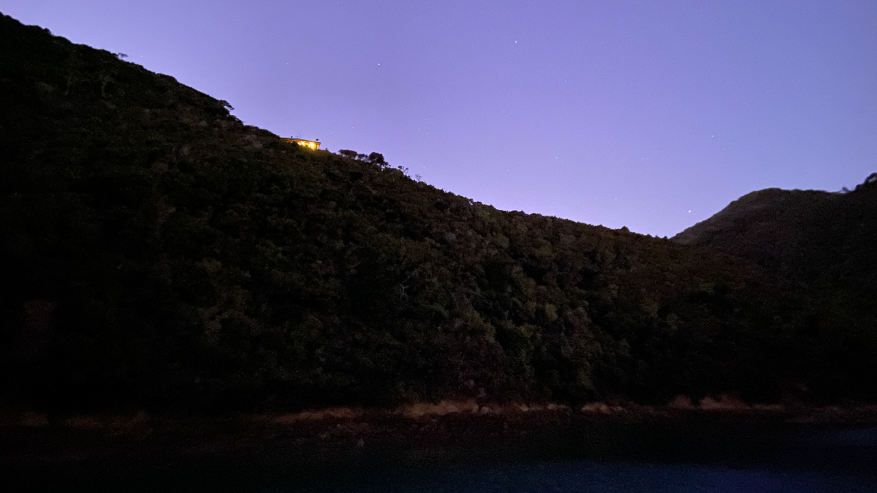56. Aujourd'hui, je pars avec Chris, notre "voisin" chercher des materiaux pour mon projet de chambre et le verger. Je quitte, seul, la maison a 6h du matin. Il fait noir, mais pas tant que ca: la lune eclaire la baie.