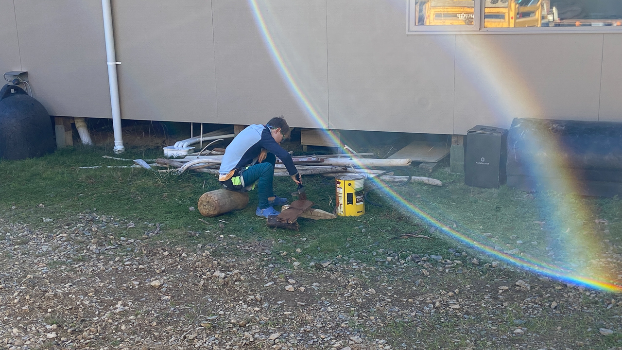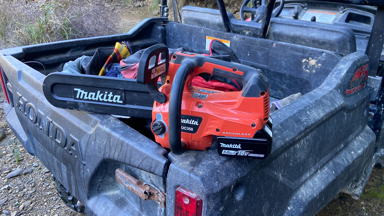 44. Alors, notre ancienne tronconneuse a essence est morte. On a investi dans l'electrique. C'est plus cher, mais c'est fiable, silencieux, puissant, et on peut faire le plein sur place: elle fonctionne a l'eau de riviere!