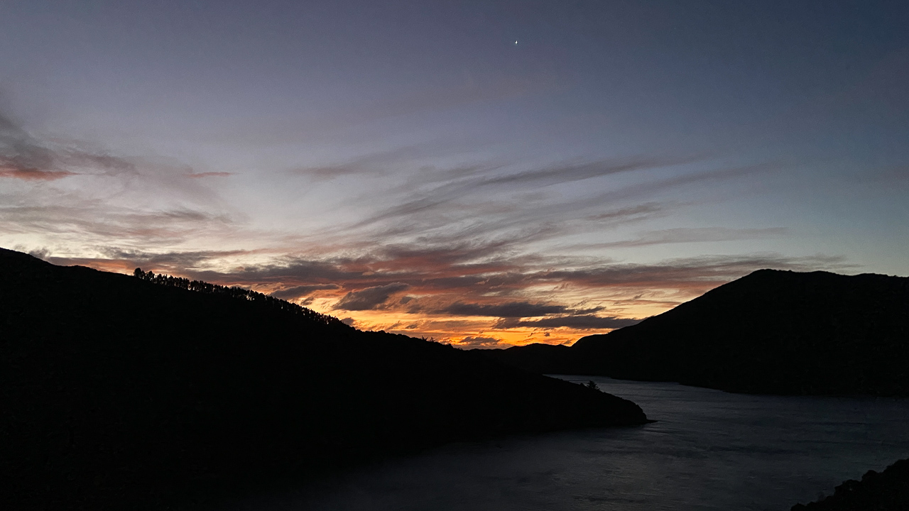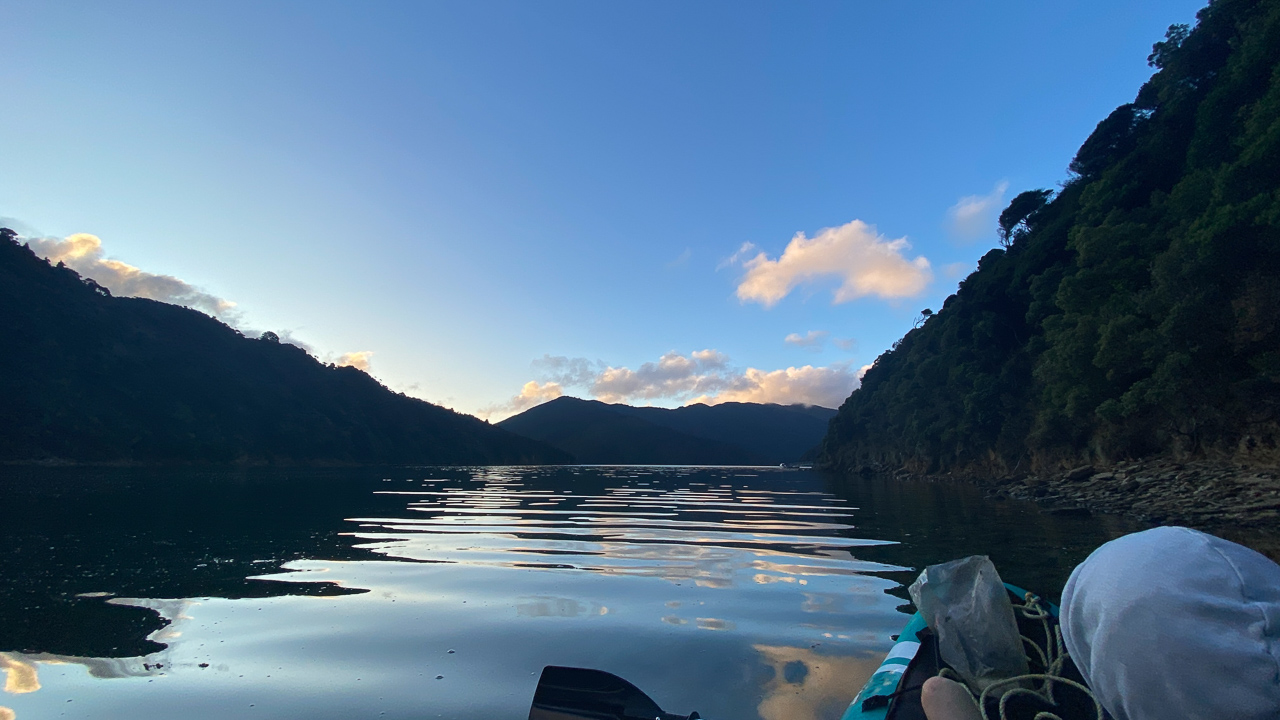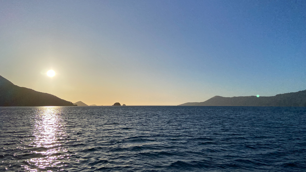 59. Lever de soleil chez Jane et Chris. Celui-ci est venu me chercher en kayak a la bouee, a laquelle j'ai attache le bateau pour la journee.