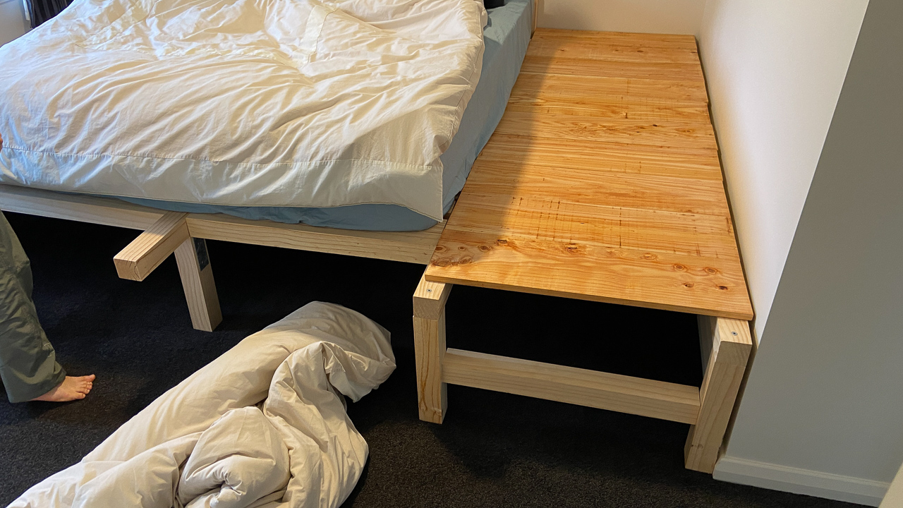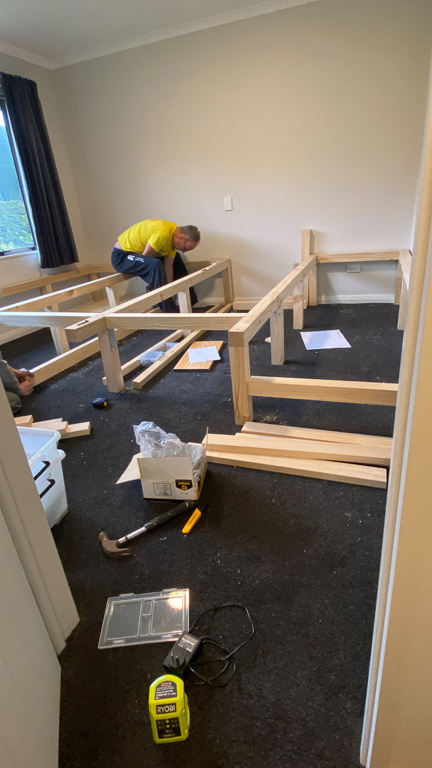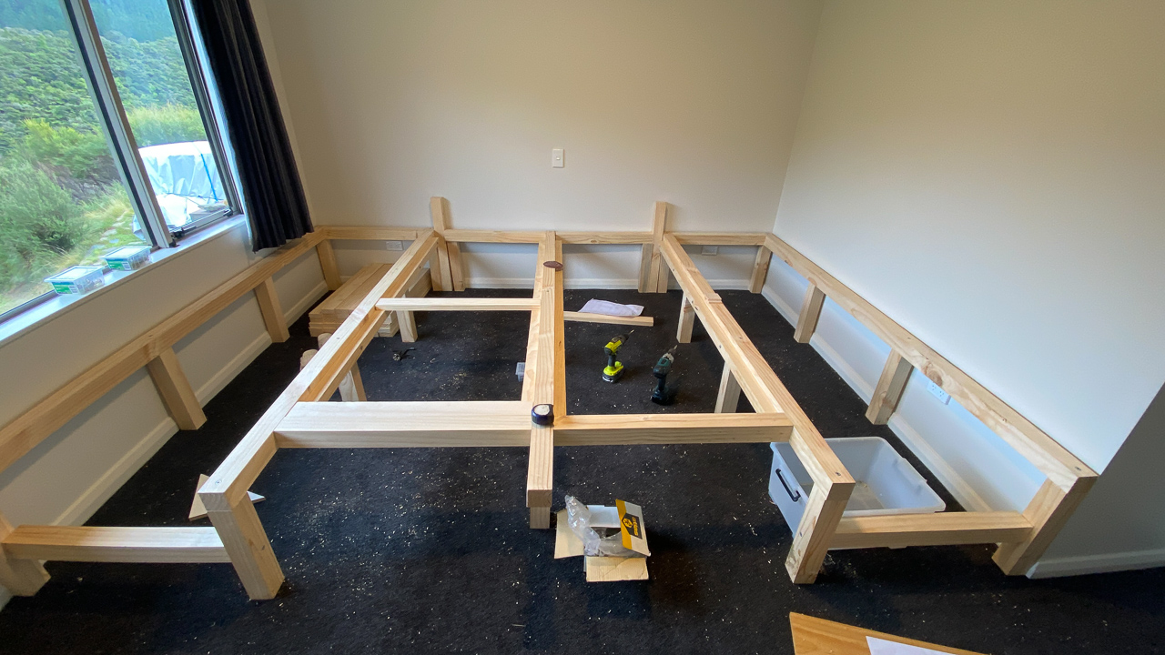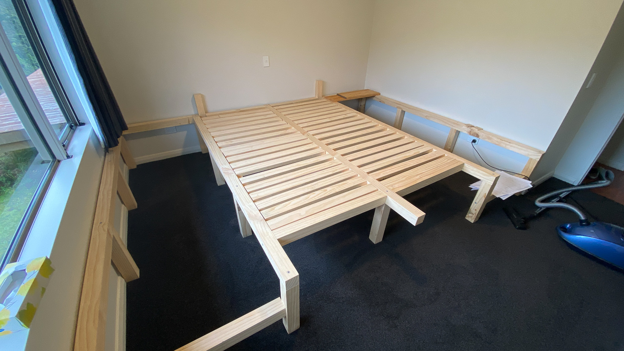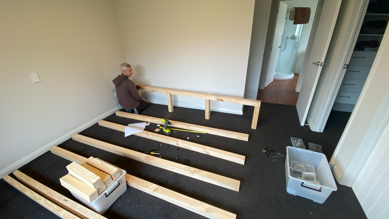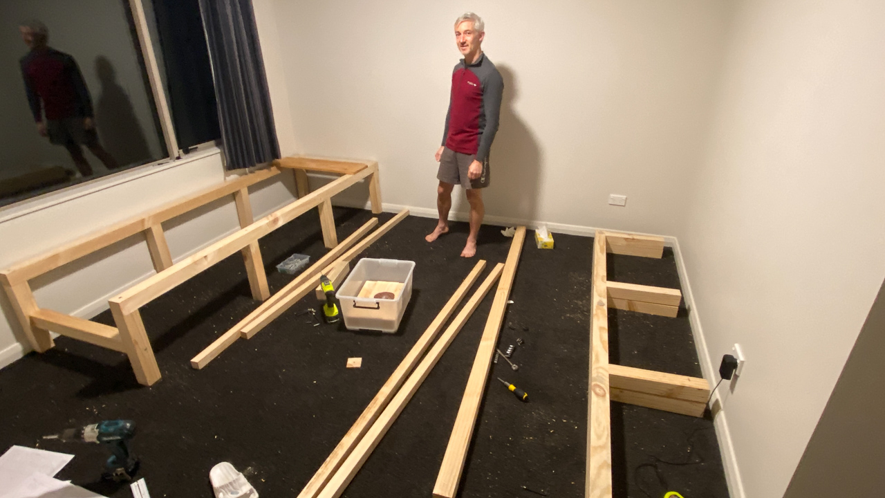 86. On commence la construction de la structure, qui sera un sommier/sol sureleve, et qui occupera presque toute la surface de la chambre. La structure devrait avoir, au final, des marches, un banc, et un espace de rangement pour des livres. On se presse un peu pour construire tout ca pour donner une chance au bois de s'habituer a l'atmosphere de la chambre pendant que nous sommes absents.