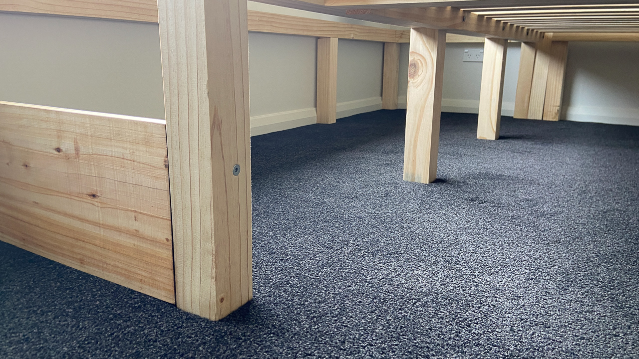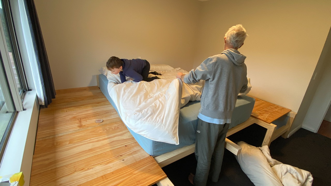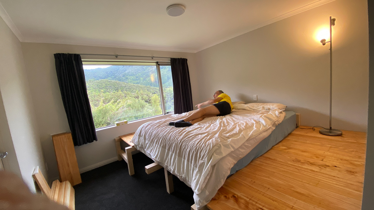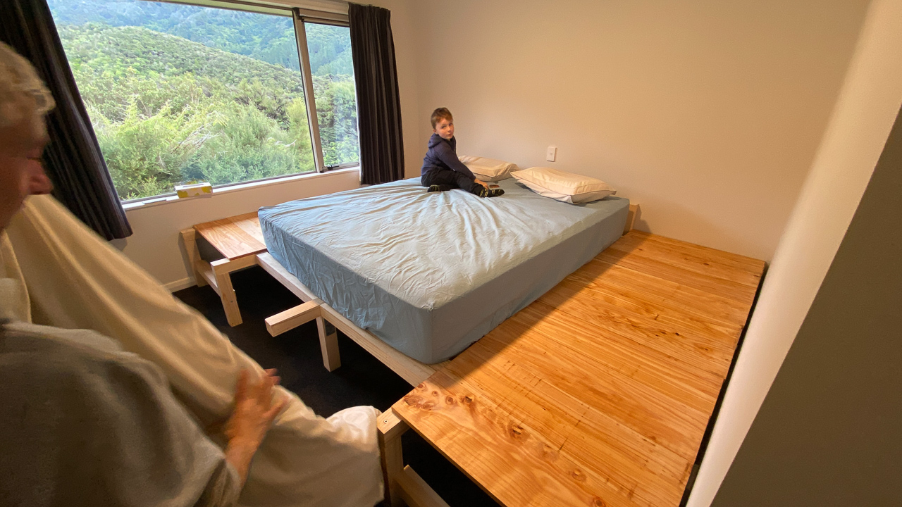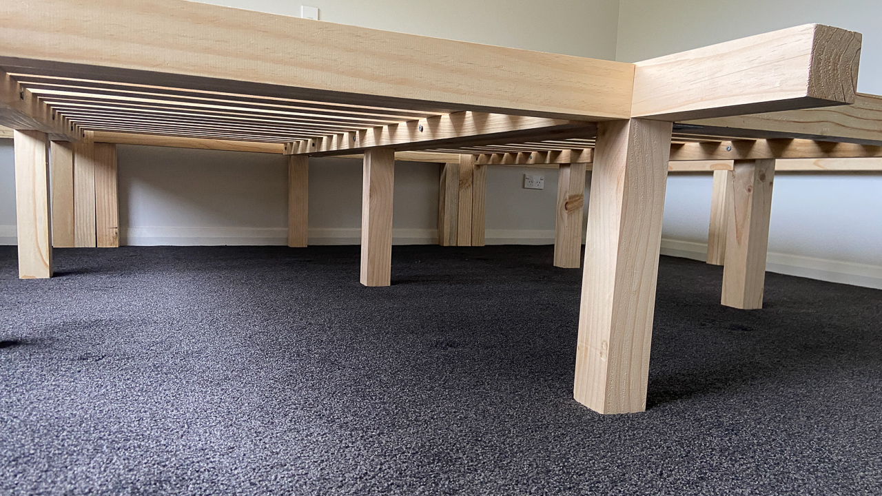 86. On commence la construction de la structure, qui sera un sommier/sol sureleve, et qui occupera presque toute la surface de la chambre. La structure devrait avoir, au final, des marches, un banc, et un espace de rangement pour des livres. On se presse un peu pour construire tout ca pour donner une chance au bois de s'habituer a l'atmosphere de la chambre pendant que nous sommes absents.