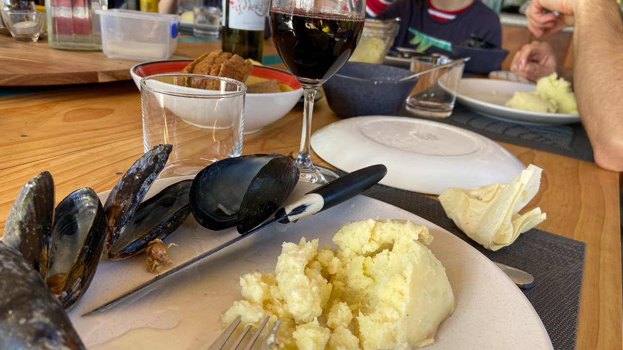 132. Moules et puree maison. Les moules ont ete nettoyees avec une brosse attachee a une perceuse, et ca marche plutot pas mal!
