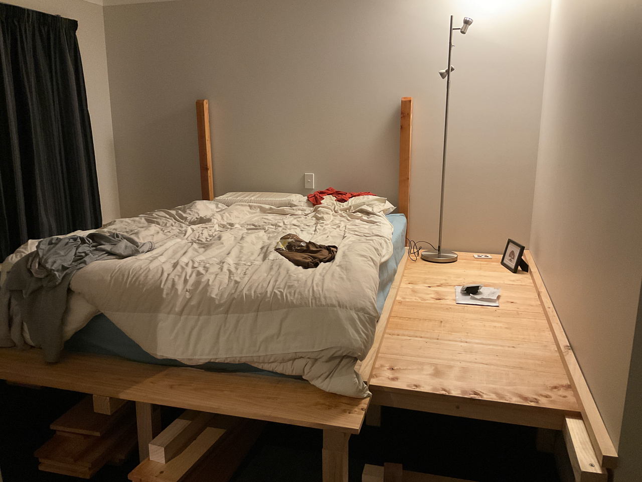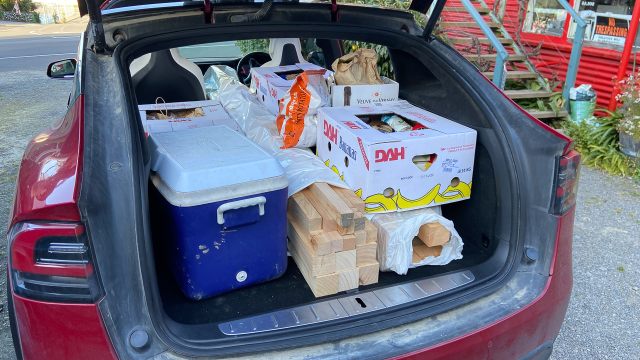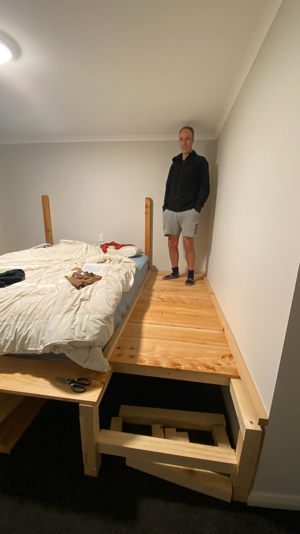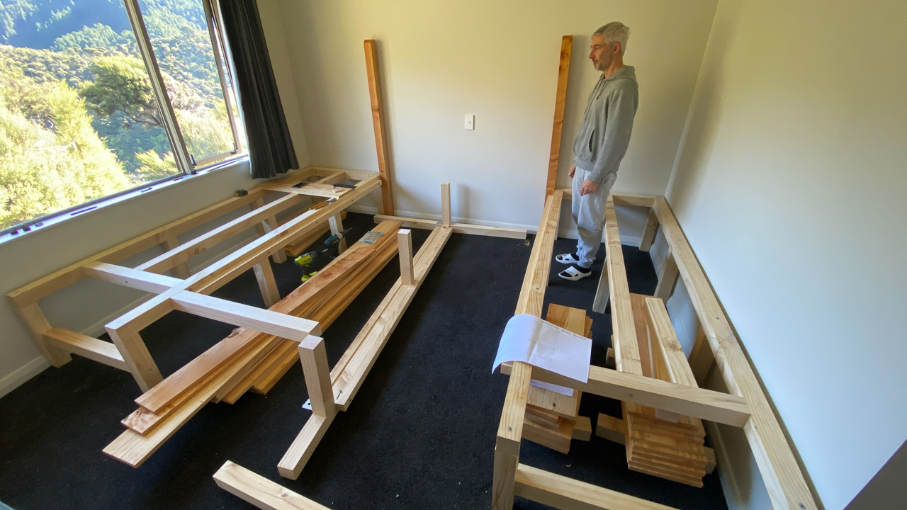 51. J'ai ramene du bois pour terminer le lit/la chambre. Malheureusement, certaines pieces auraient du etre du macrocarpa, mais c'est du pin qu'ils m'ont donne. Ce n'est pas trop grave car je n'aurai pas le temps de tout deployer de toutes facons, mais le fournisseur va devoir rattraper le coup pour la prochaine fois.
