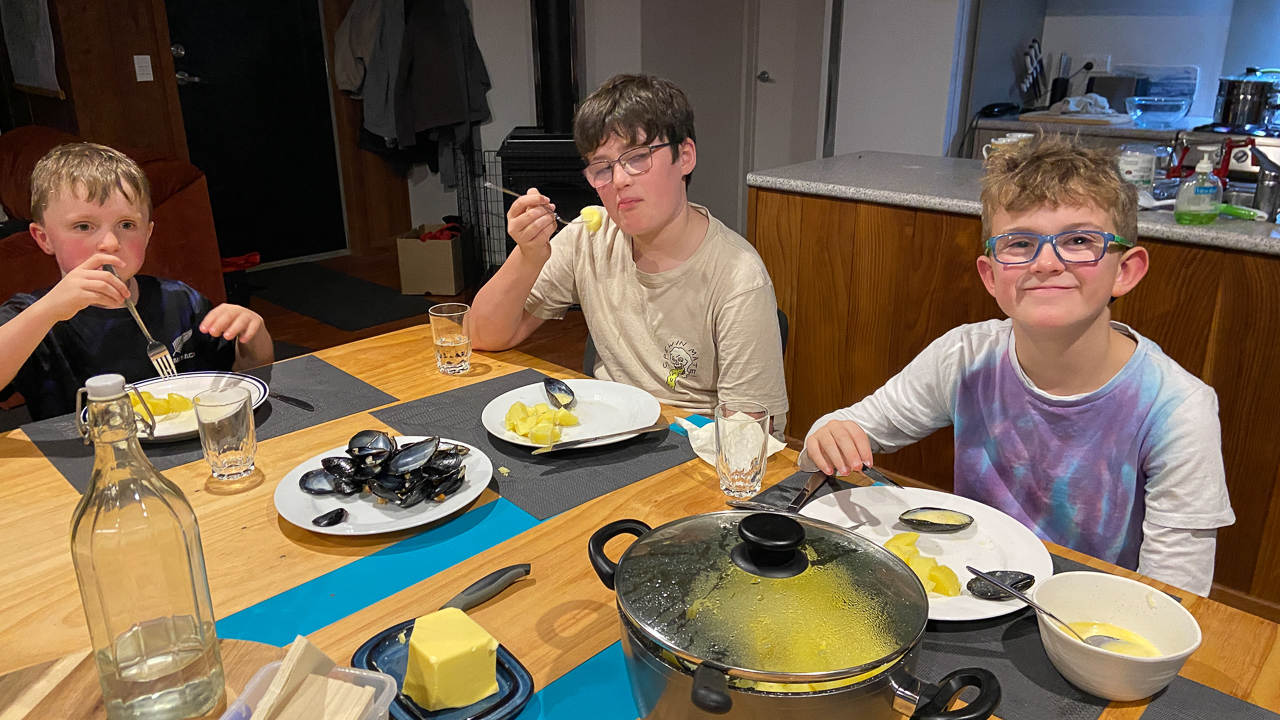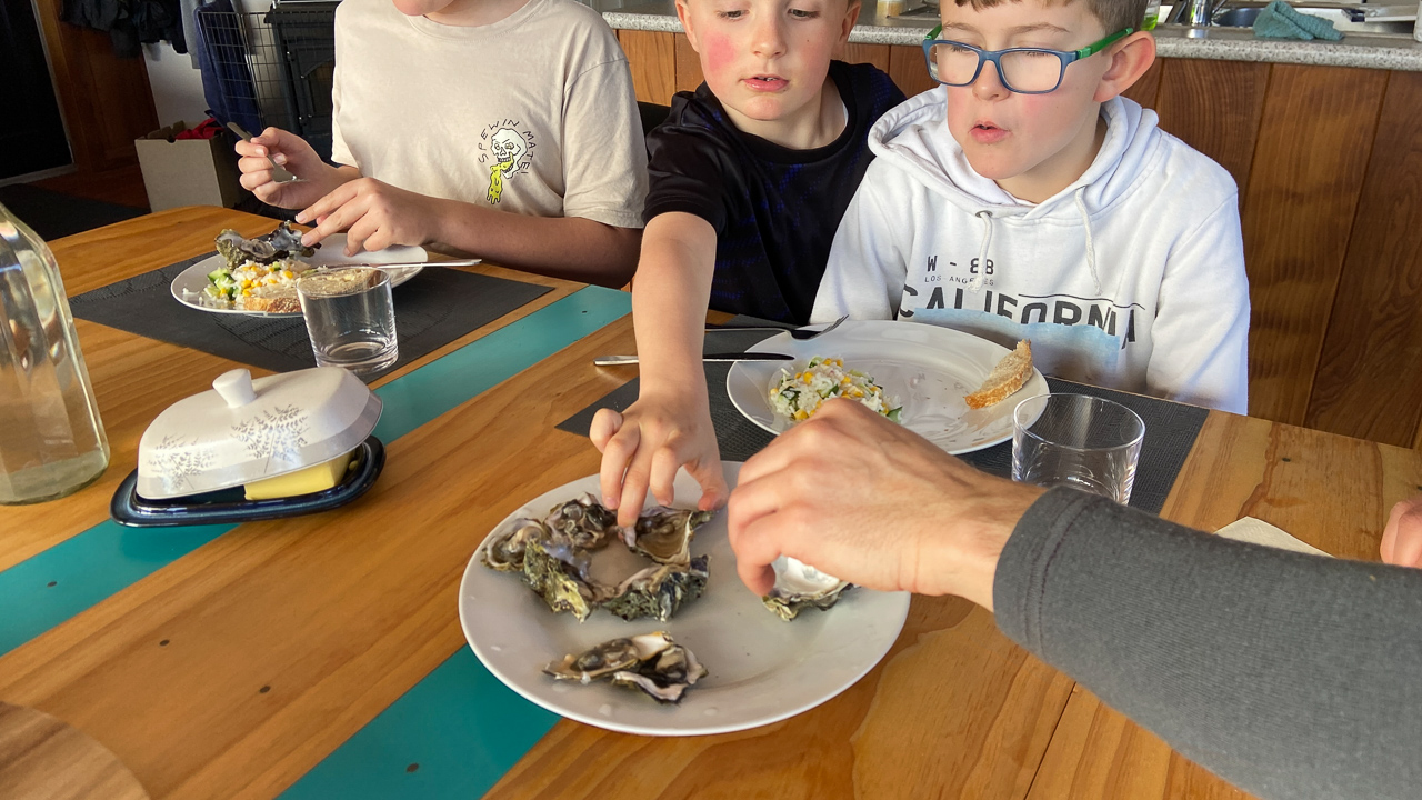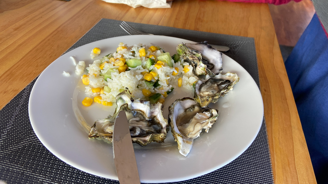 43. Nous ne sommes pas arrives depuis 24 heures que nous avons deja mange poissons, moules et huitres locales!