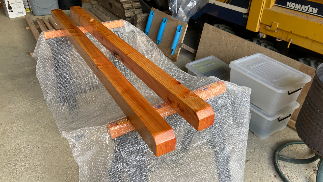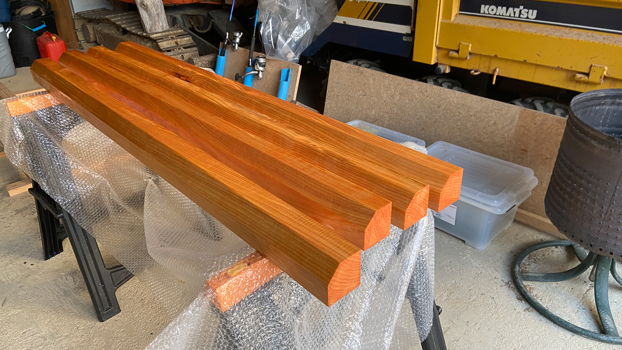 108. Chris m'a aide a biseauter les poutres transversales de notre future tete de lit. Ici, huilee au lin.