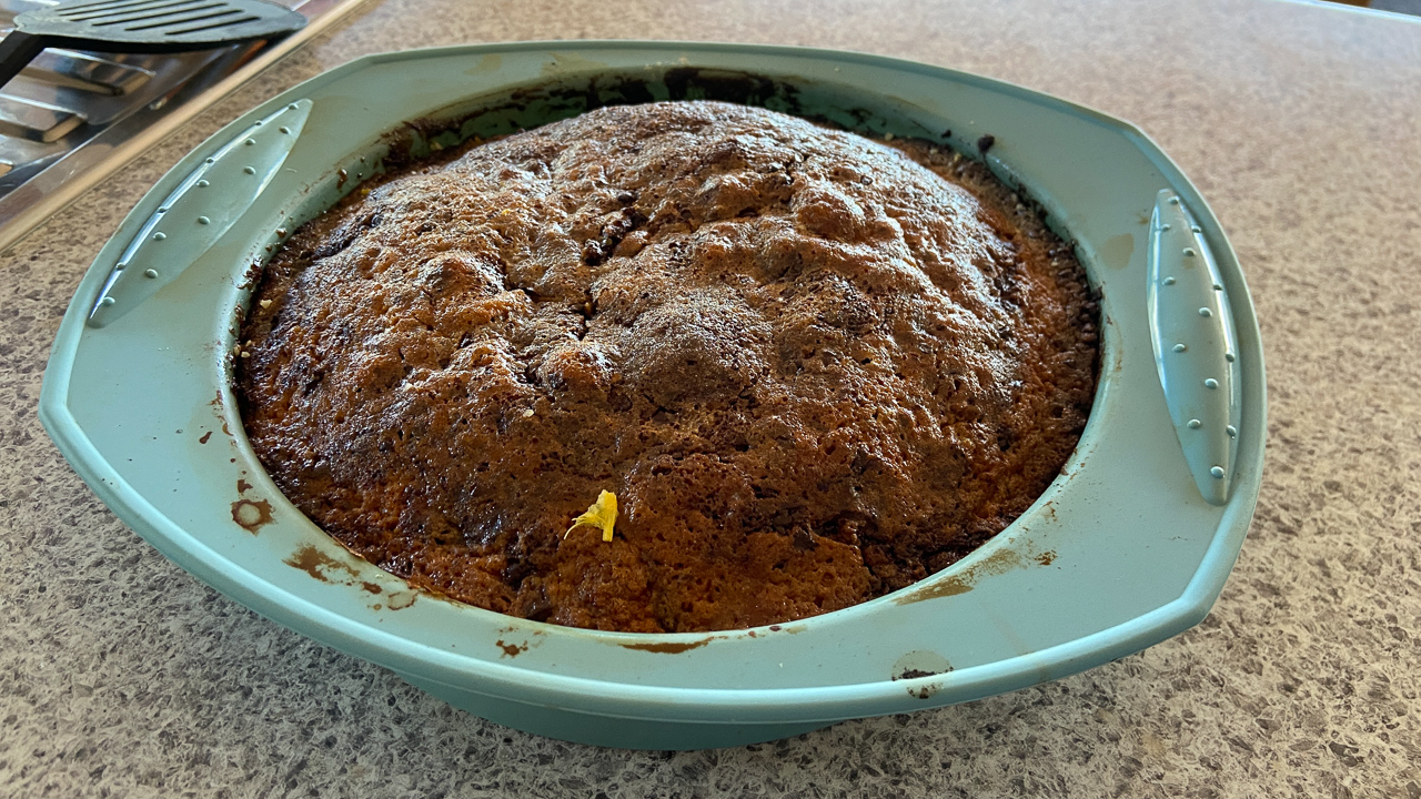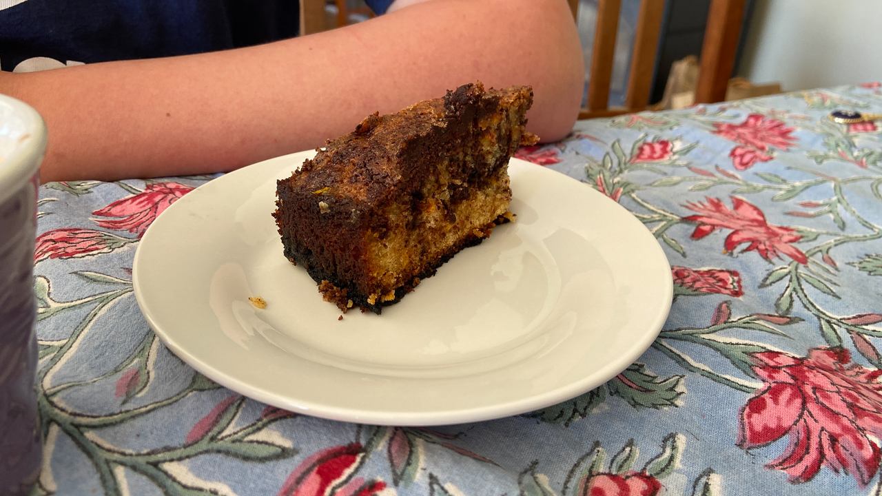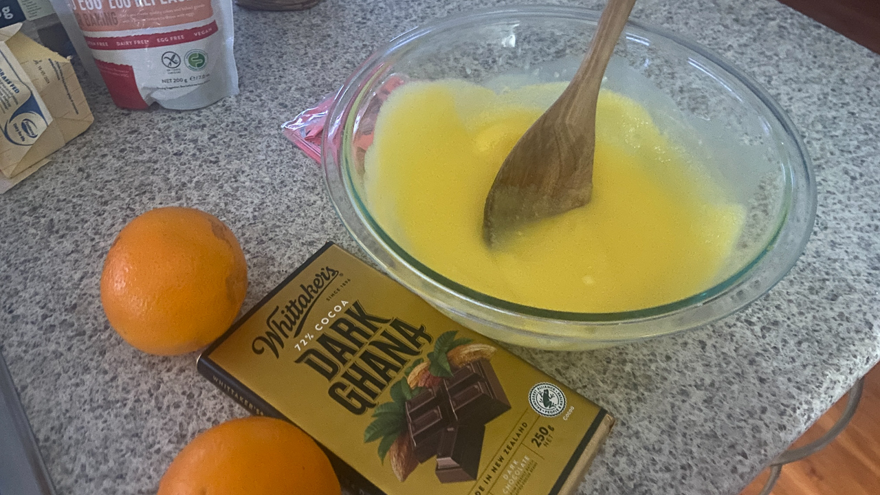 103. Aujourd'hui, nous allons manger chez Jane et Chris. Alors je fais un dessert: un gateau chocolat orange, facon Mamie a Aire. Seul pour le cuisiner aux toutes petites heures du matin, je ne peux pas faire de bruit, et le fait donc "a la traditionelle", a la main. Ce fut une petite heure passee avec Mamie tout en me preparant pour la visite chez nos amis.
