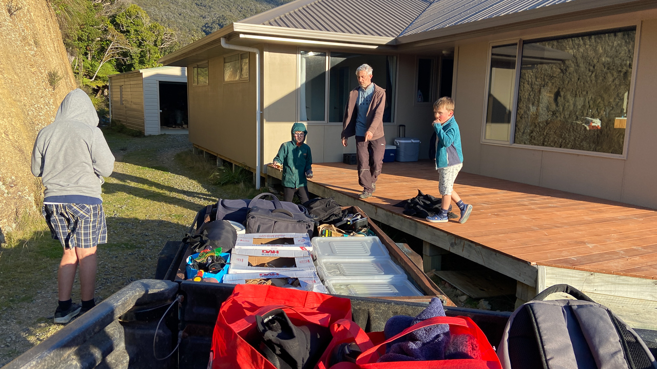 115. Une semaine apres notre arrivee, il est temps de preparer notre retour sur la terre ferme. La remorque, une fois encore, nous aide beaucoup a vider la maison et charger le bateau.