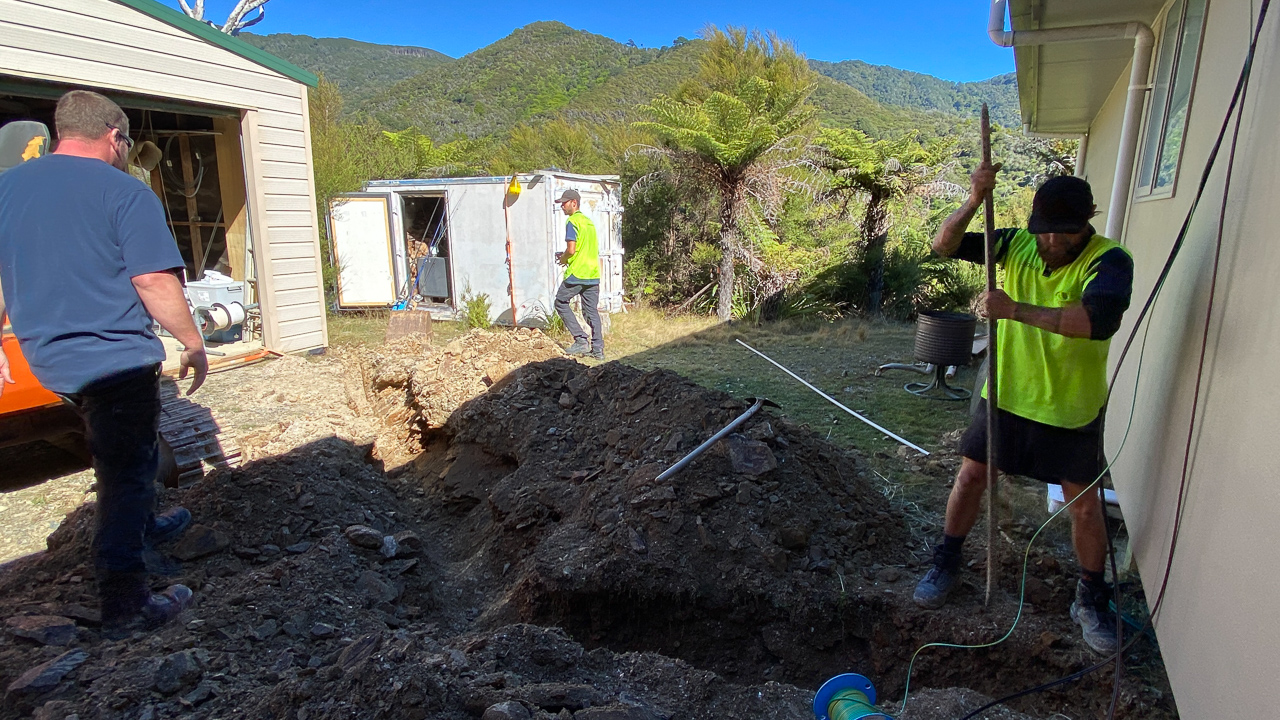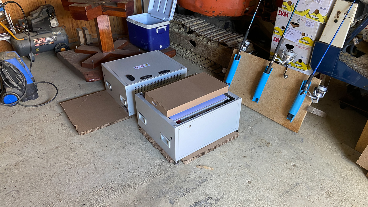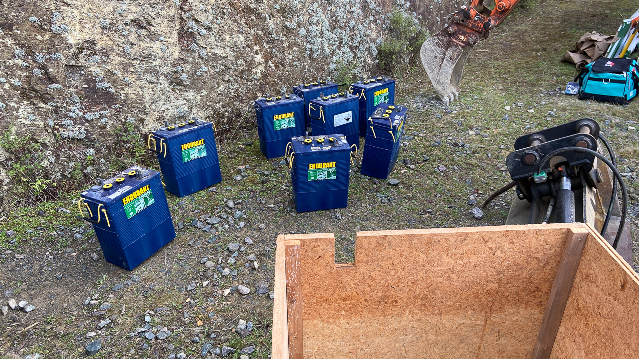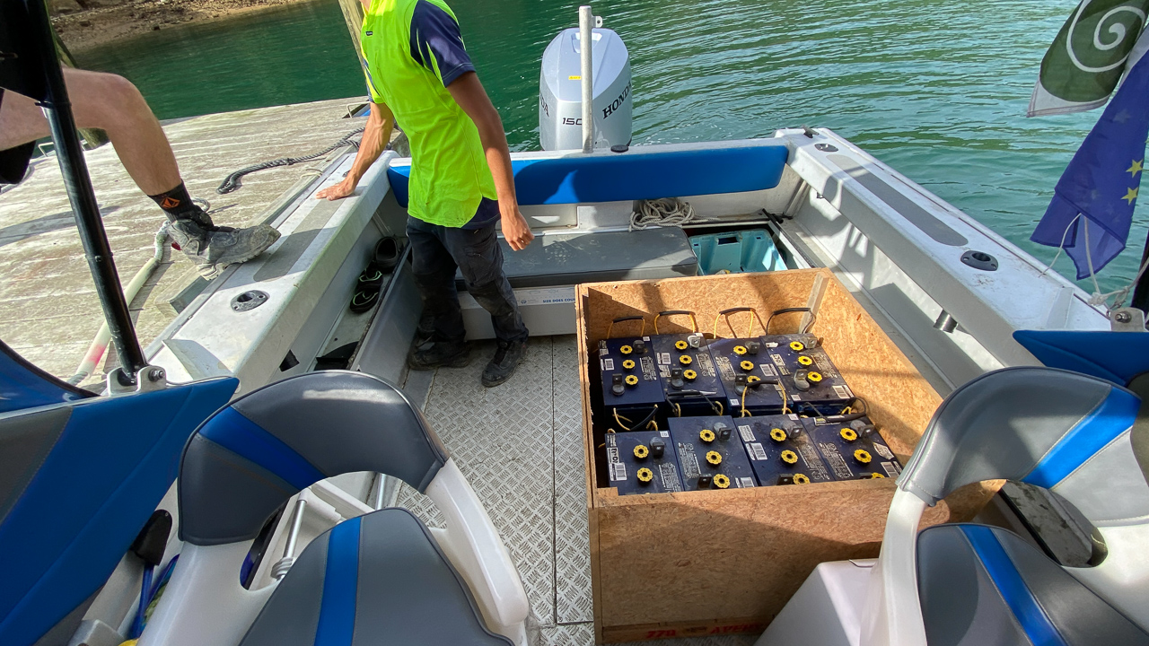 4. Les deux nouvelles batteries qui vont remplacer les vieilles a d'Urville, avaient ete deposees dans le bateau plus tot dans la semaine. A environ 60kg chacune, les ramener sur l'ile etait un defi en soit. Mais a force de methode et de patience, nous les avons deposees sur le sol du garage.