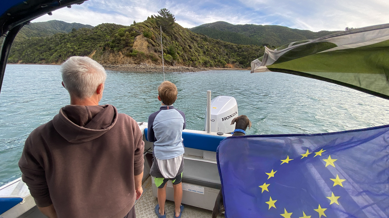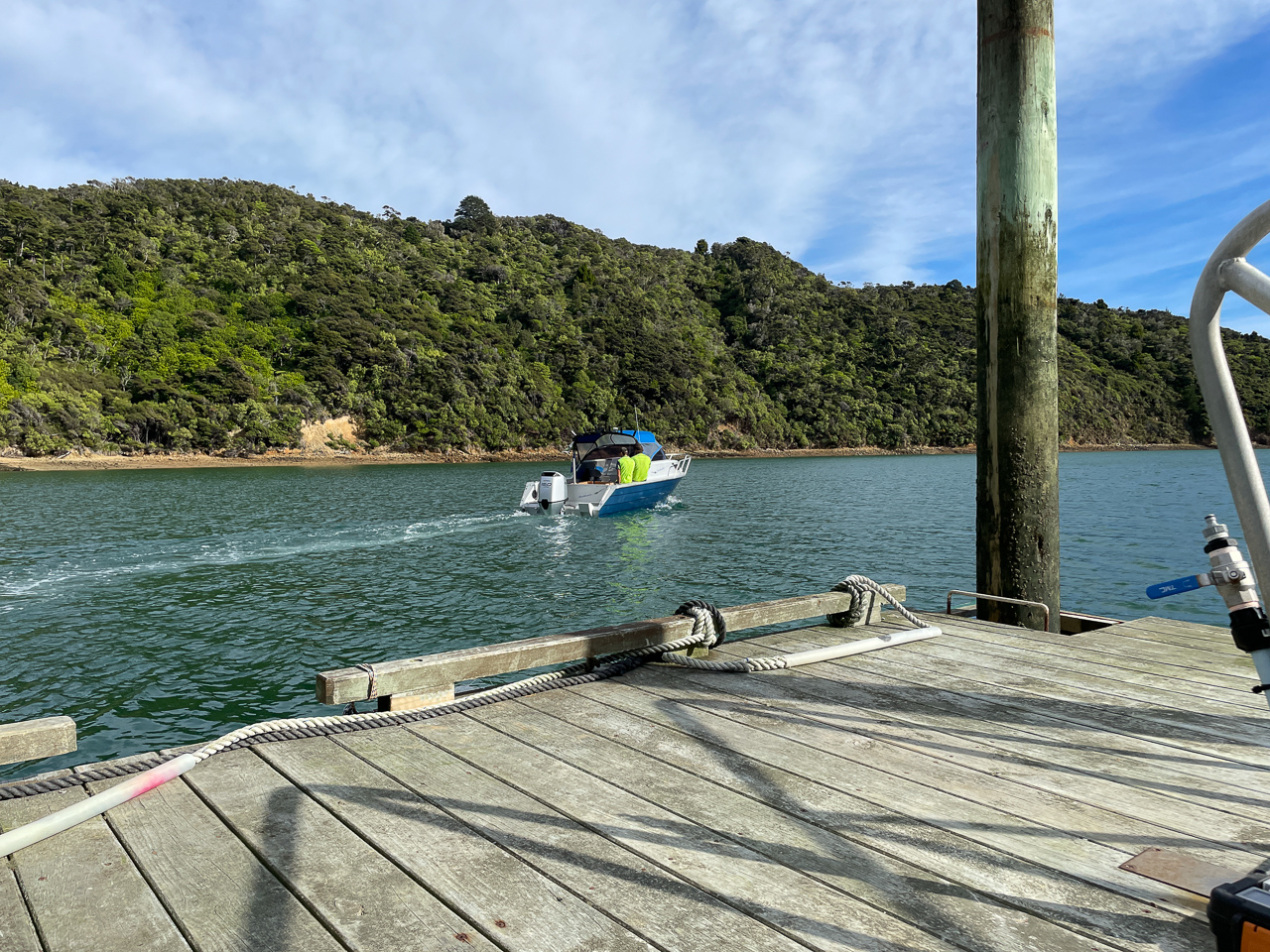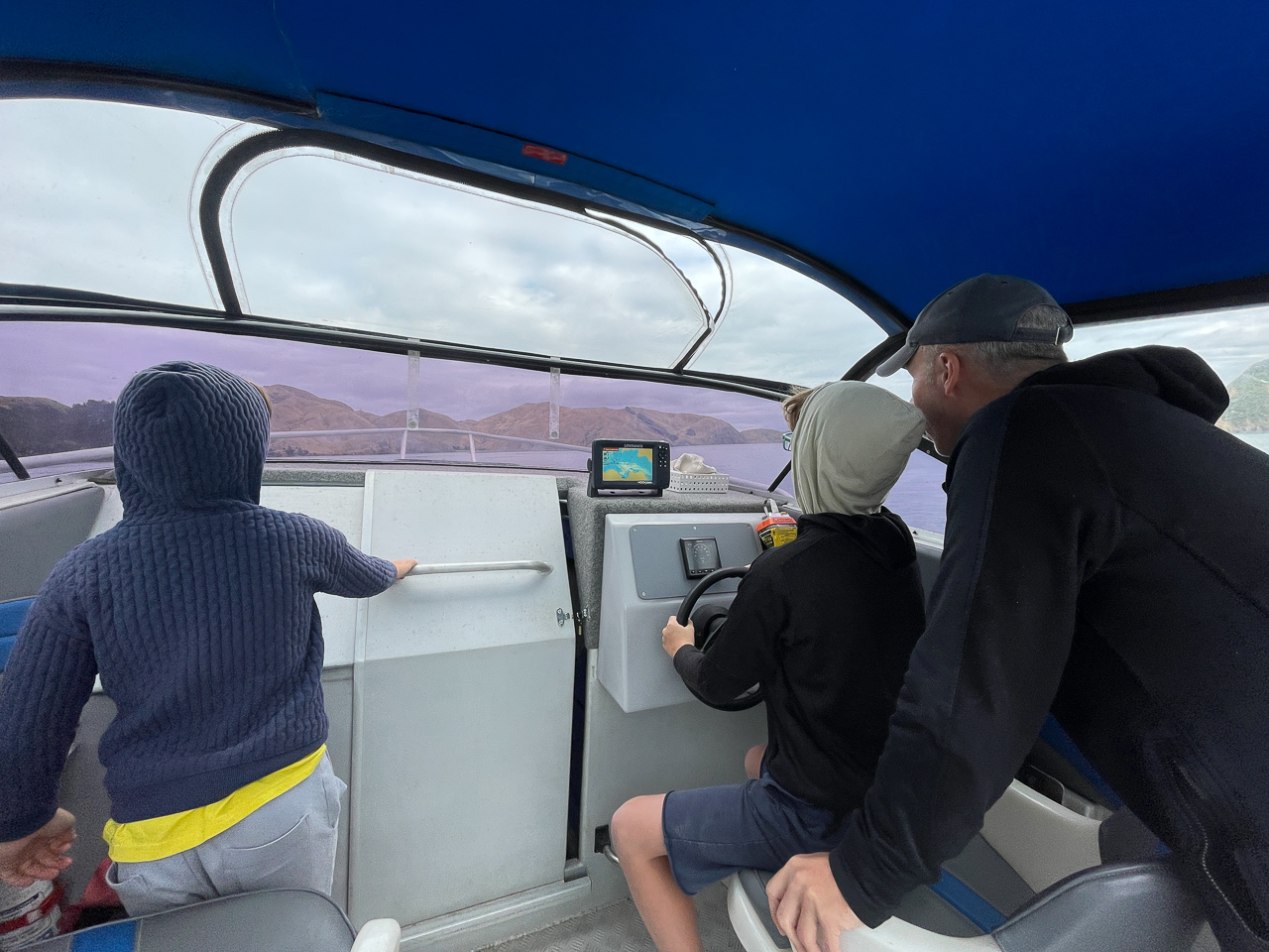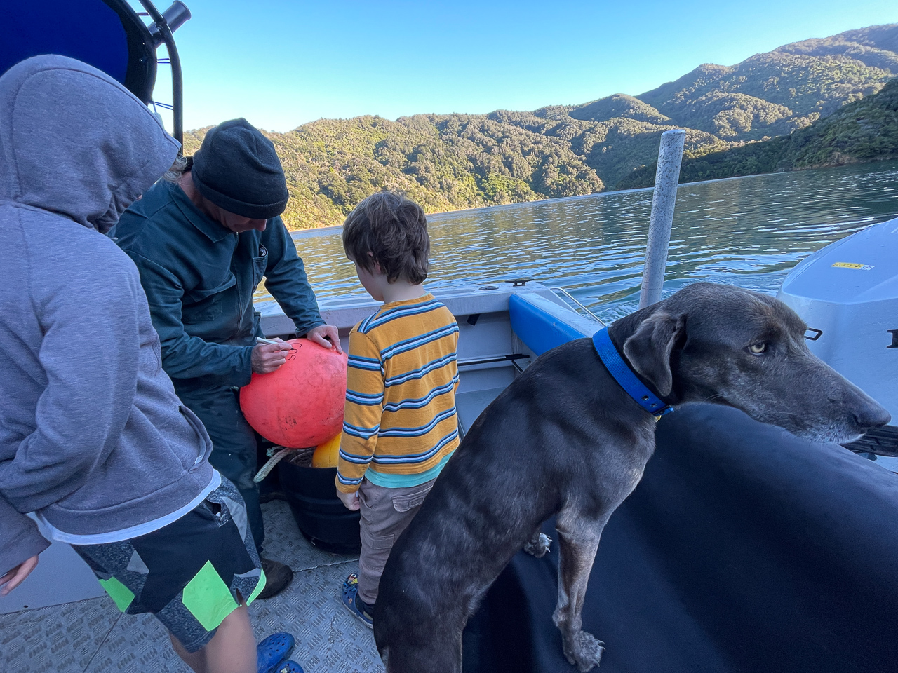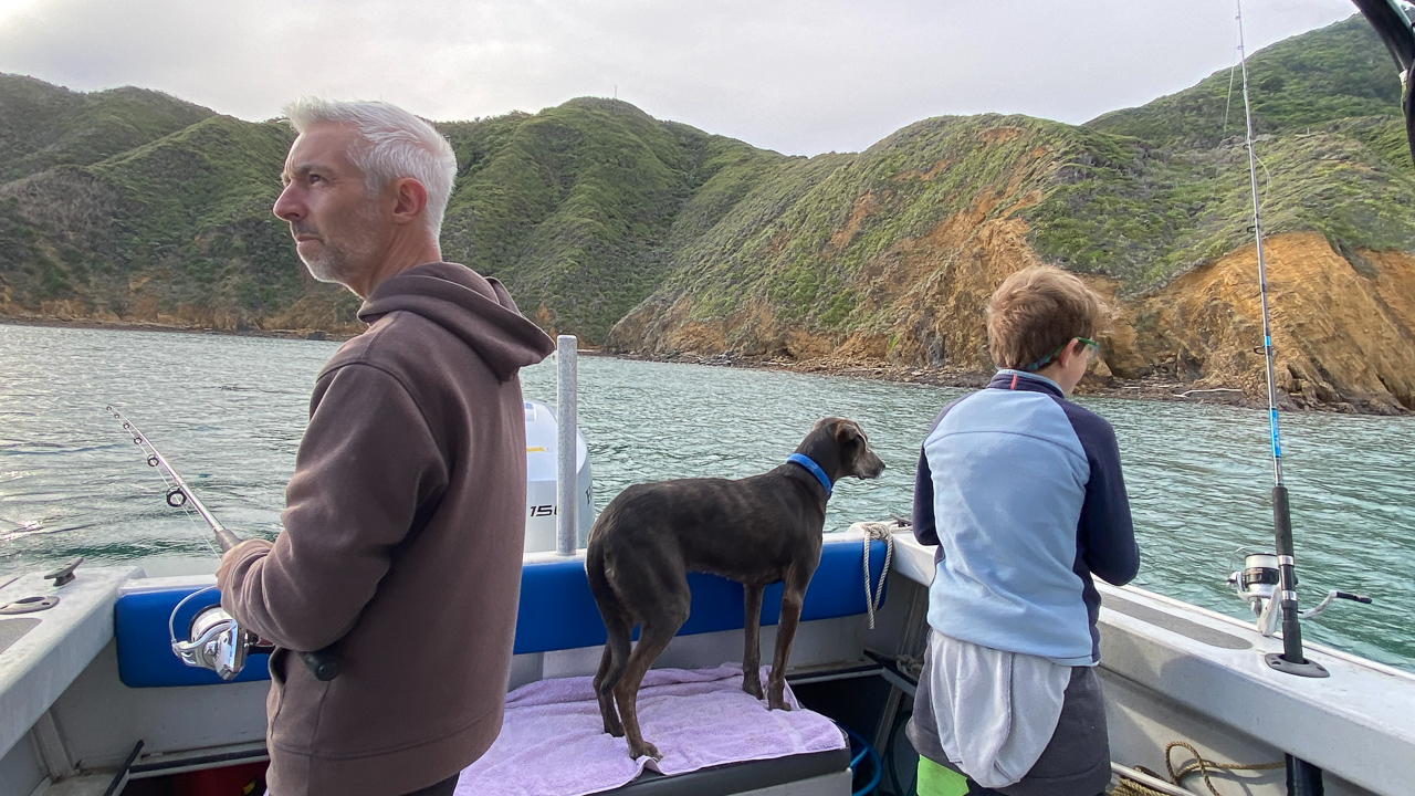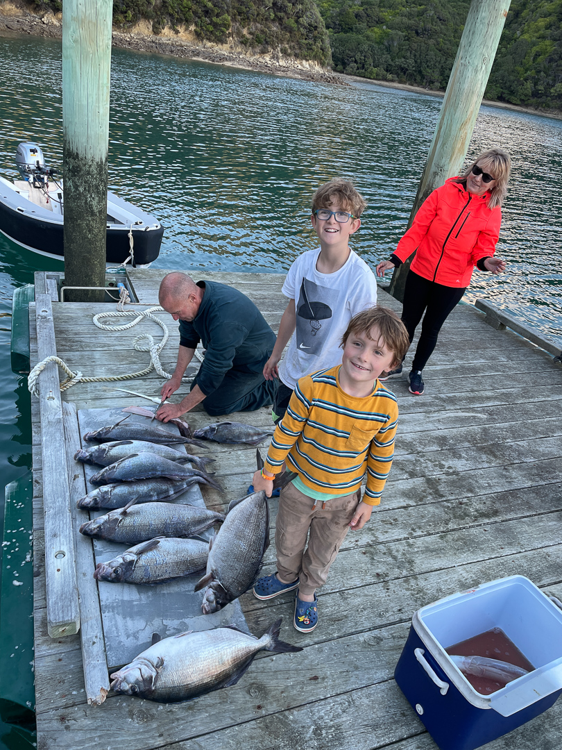 202. De retour au ponton, coincidence, un banc de kahawai fait fretiller la surface en chassant leur petit dej'. Graeme emmene Cosmo et Adan sur son annexe ...