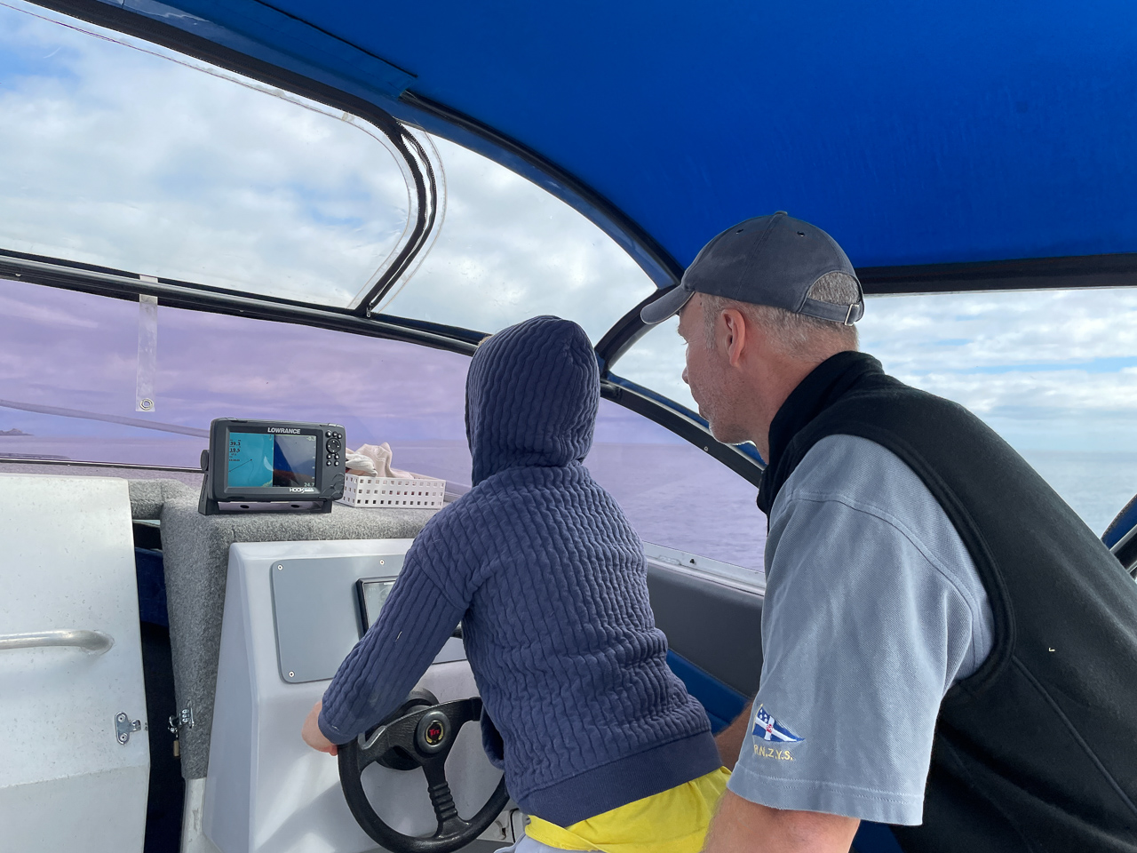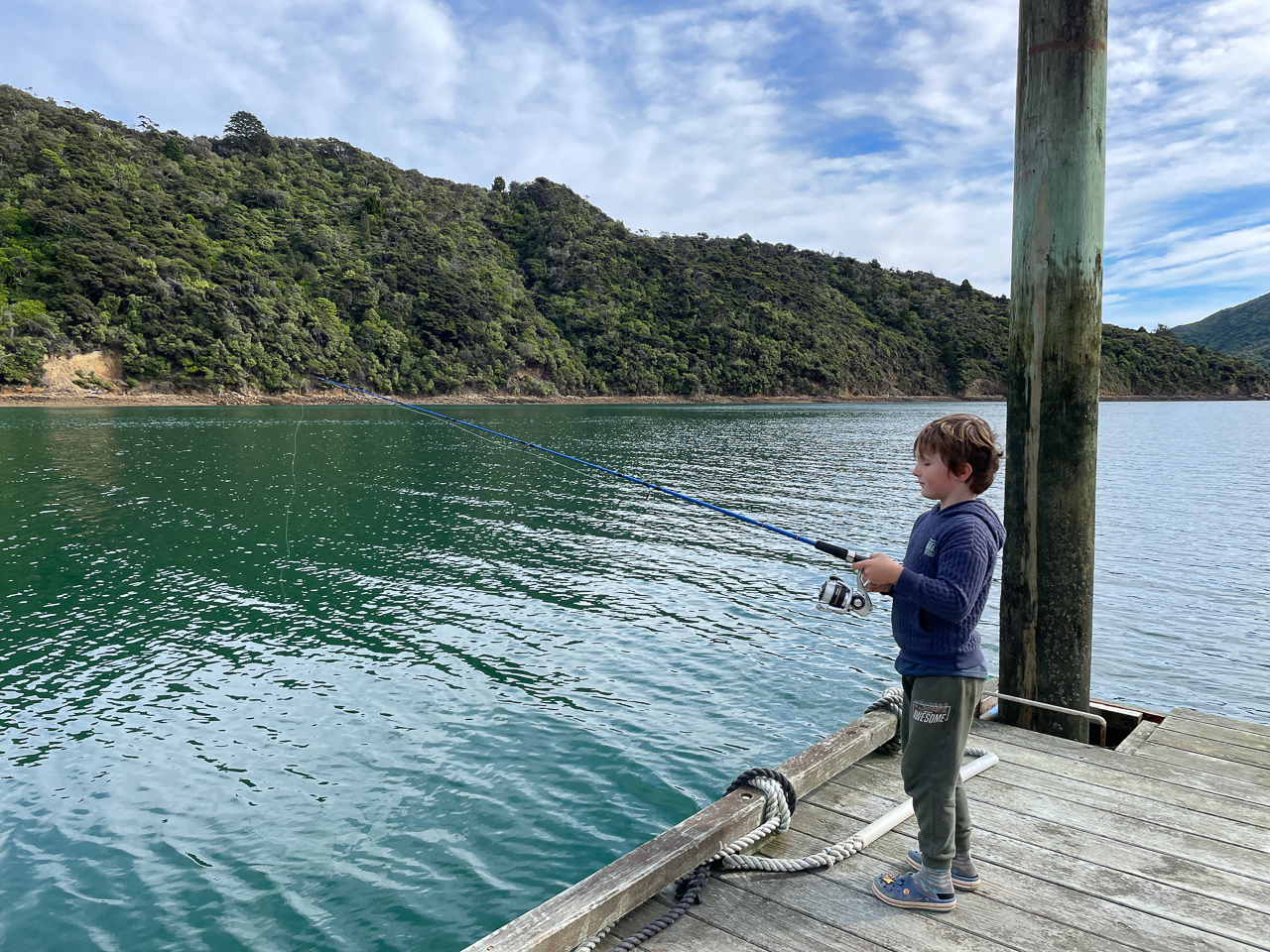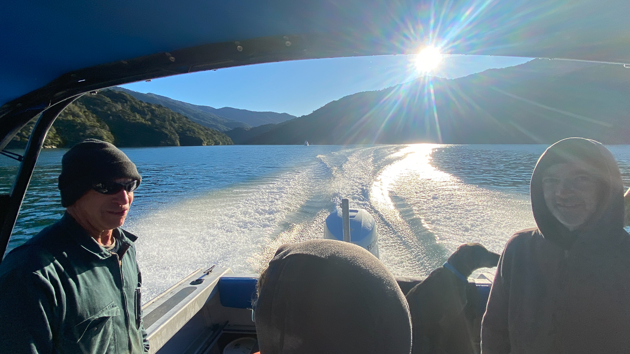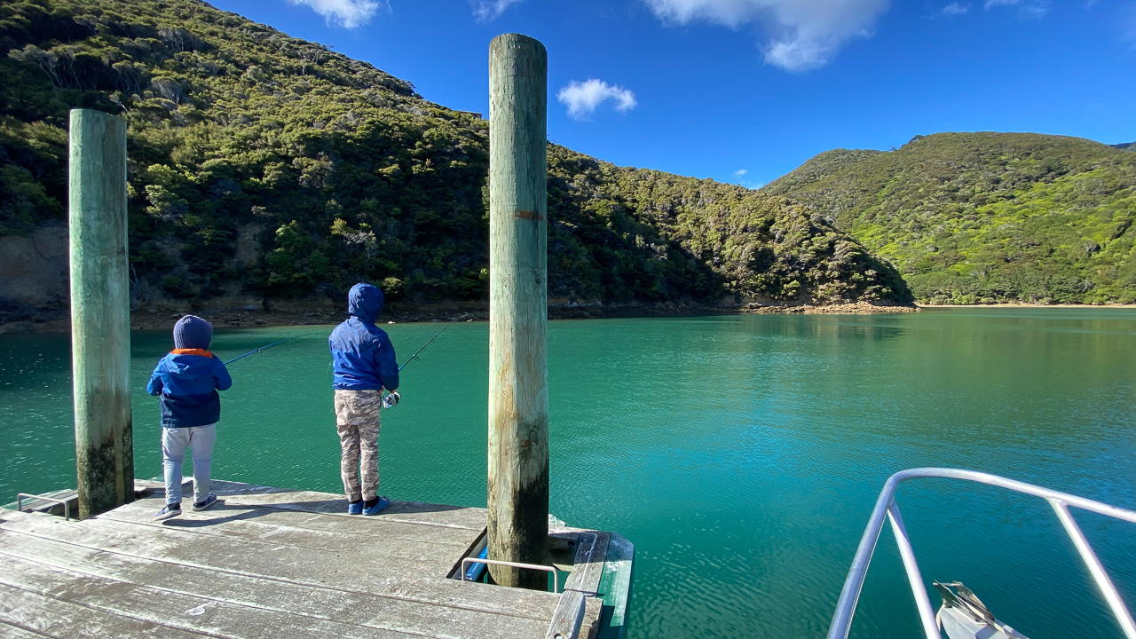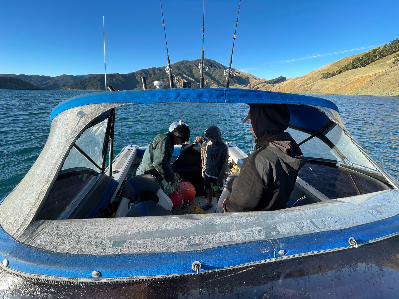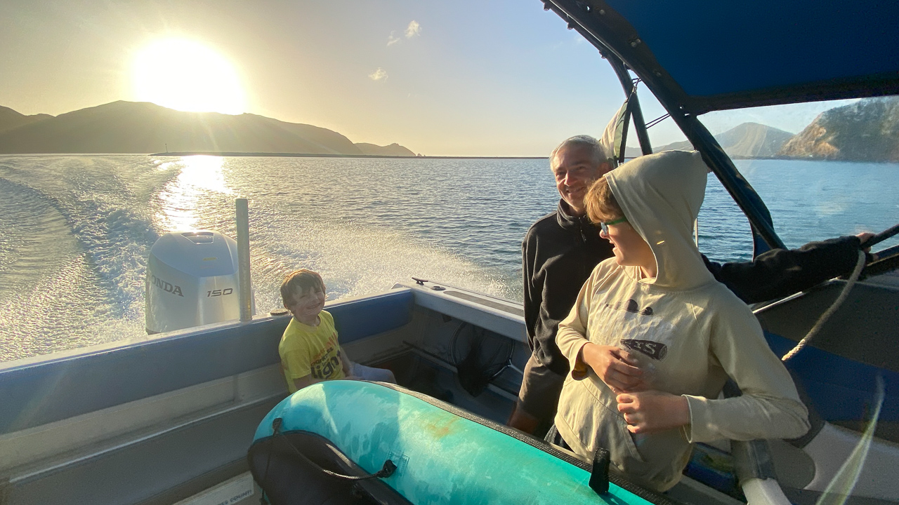 202. De retour au ponton, coincidence, un banc de kahawai fait fretiller la surface en chassant leur petit dej'. Graeme emmene Cosmo et Adan sur son annexe ...