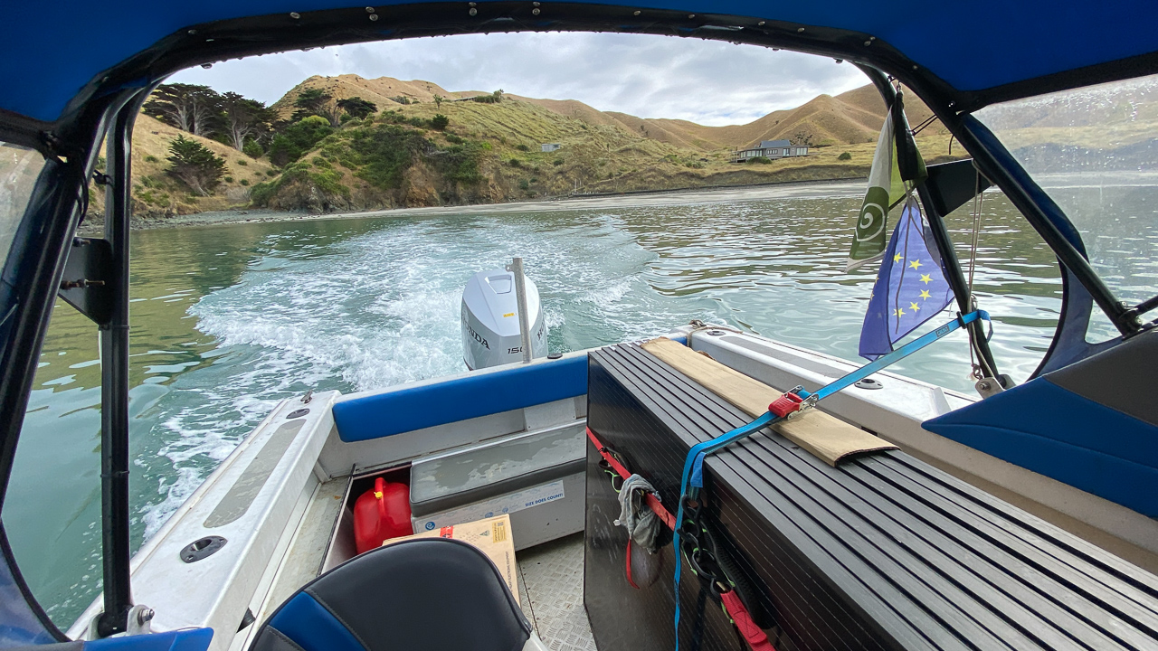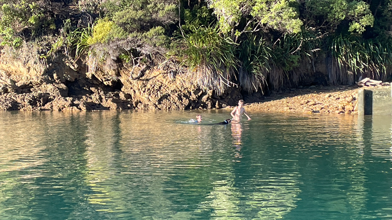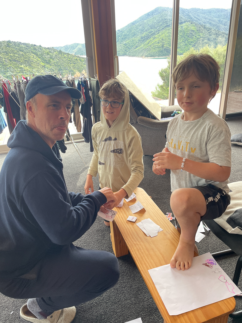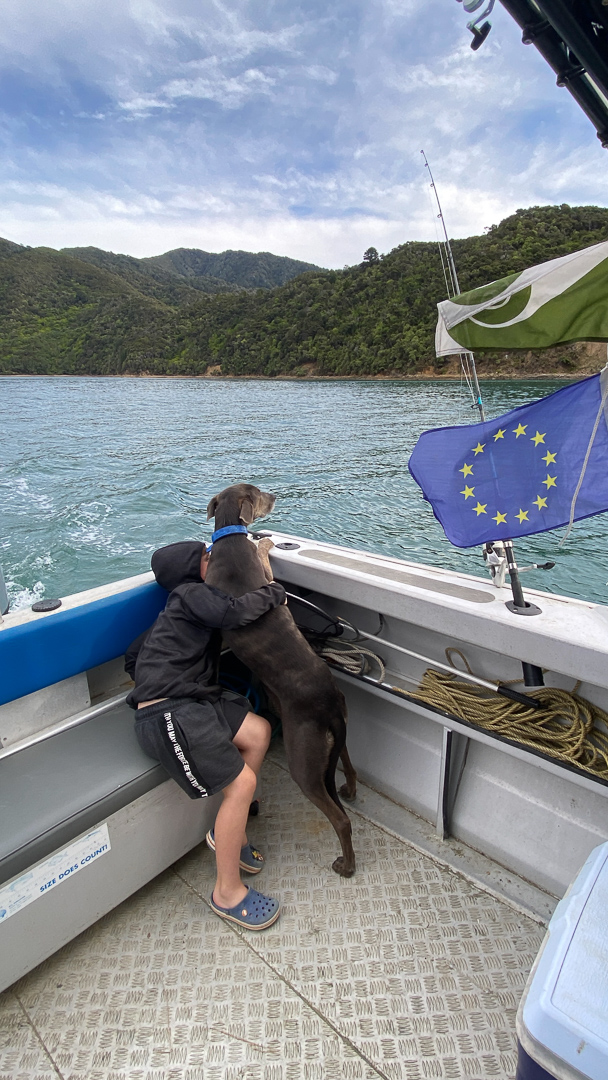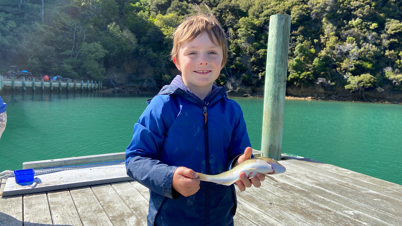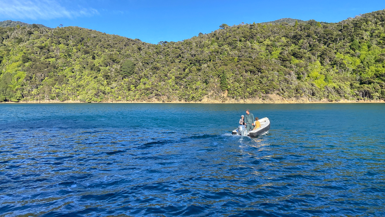 202. De retour au ponton, coincidence, un banc de kahawai fait fretiller la surface en chassant leur petit dej'. Graeme emmene Cosmo et Adan sur son annexe ...