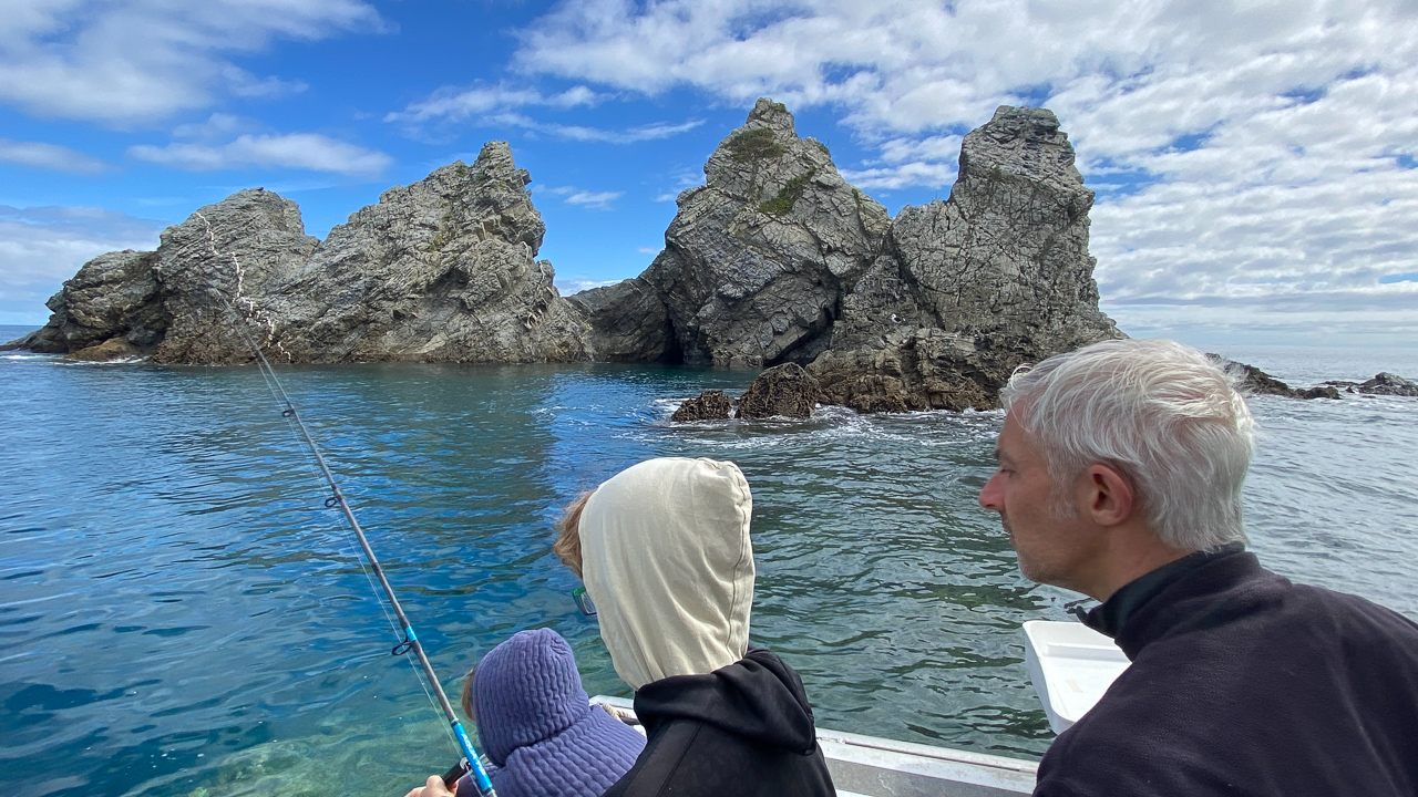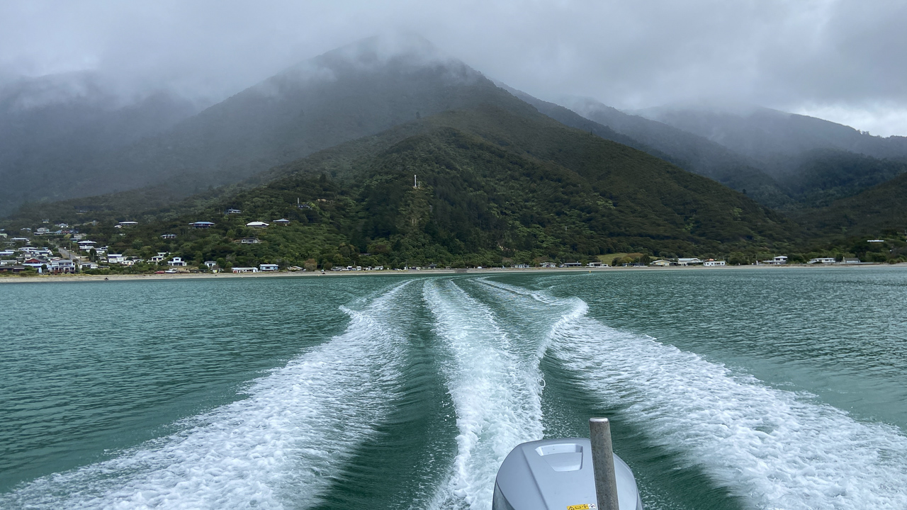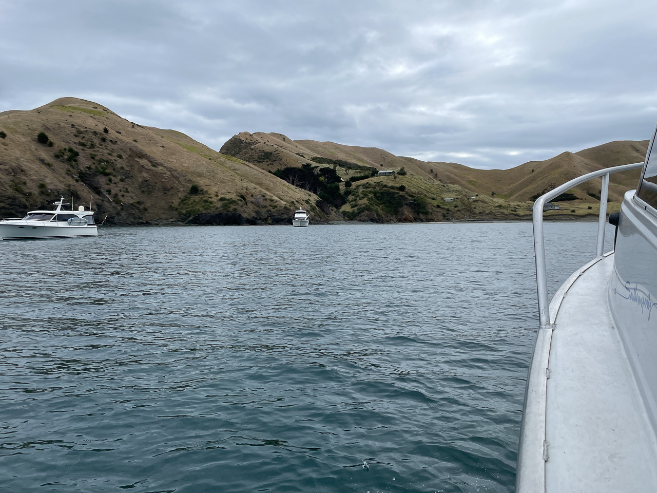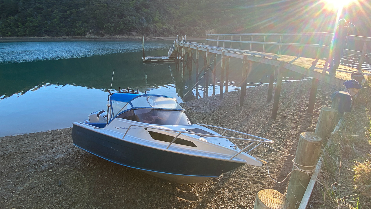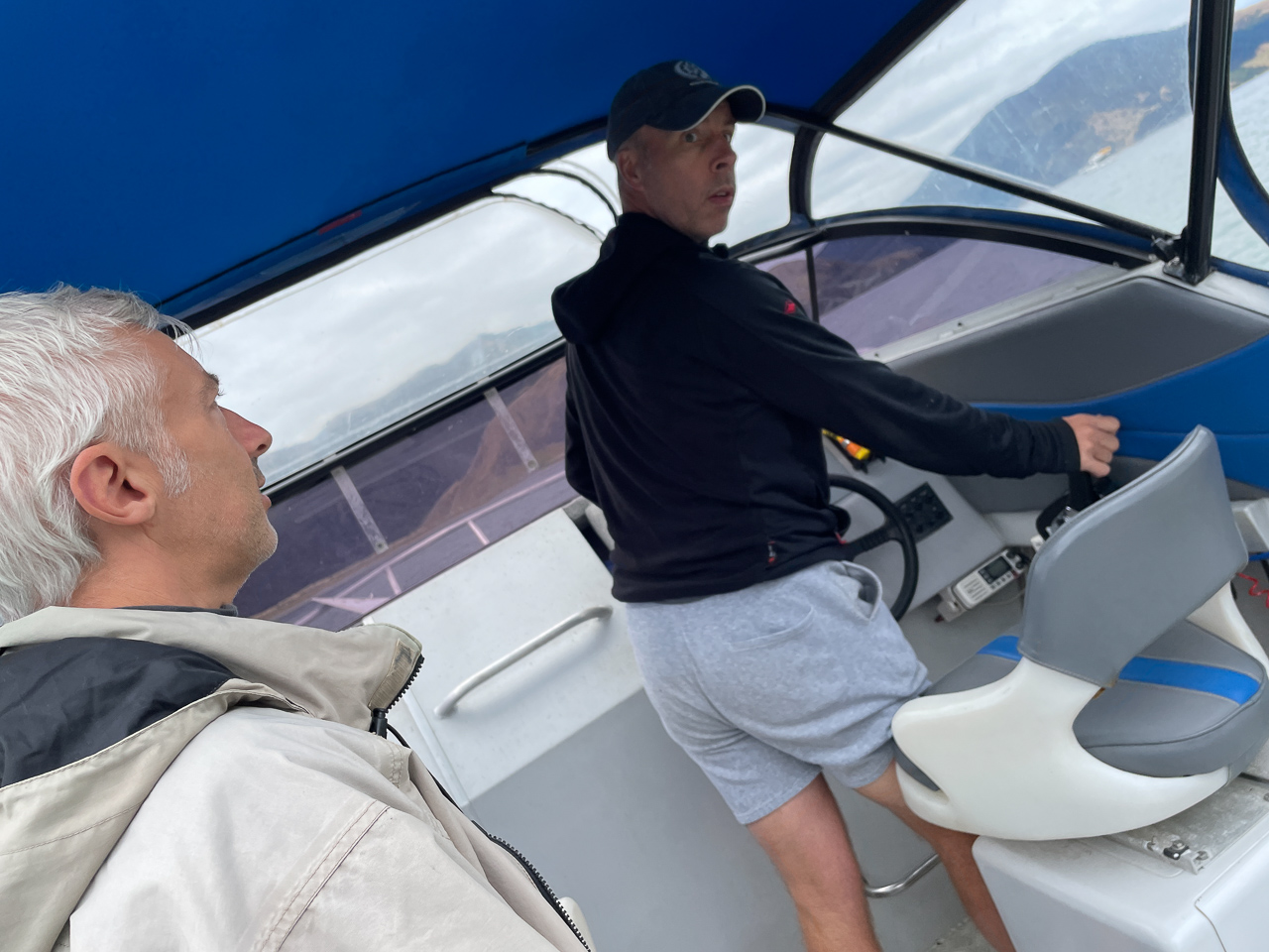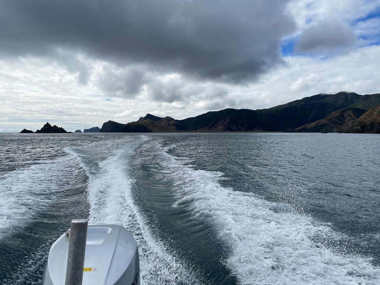 202. De retour au ponton, coincidence, un banc de kahawai fait fretiller la surface en chassant leur petit dej'. Graeme emmene Cosmo et Adan sur son annexe ...