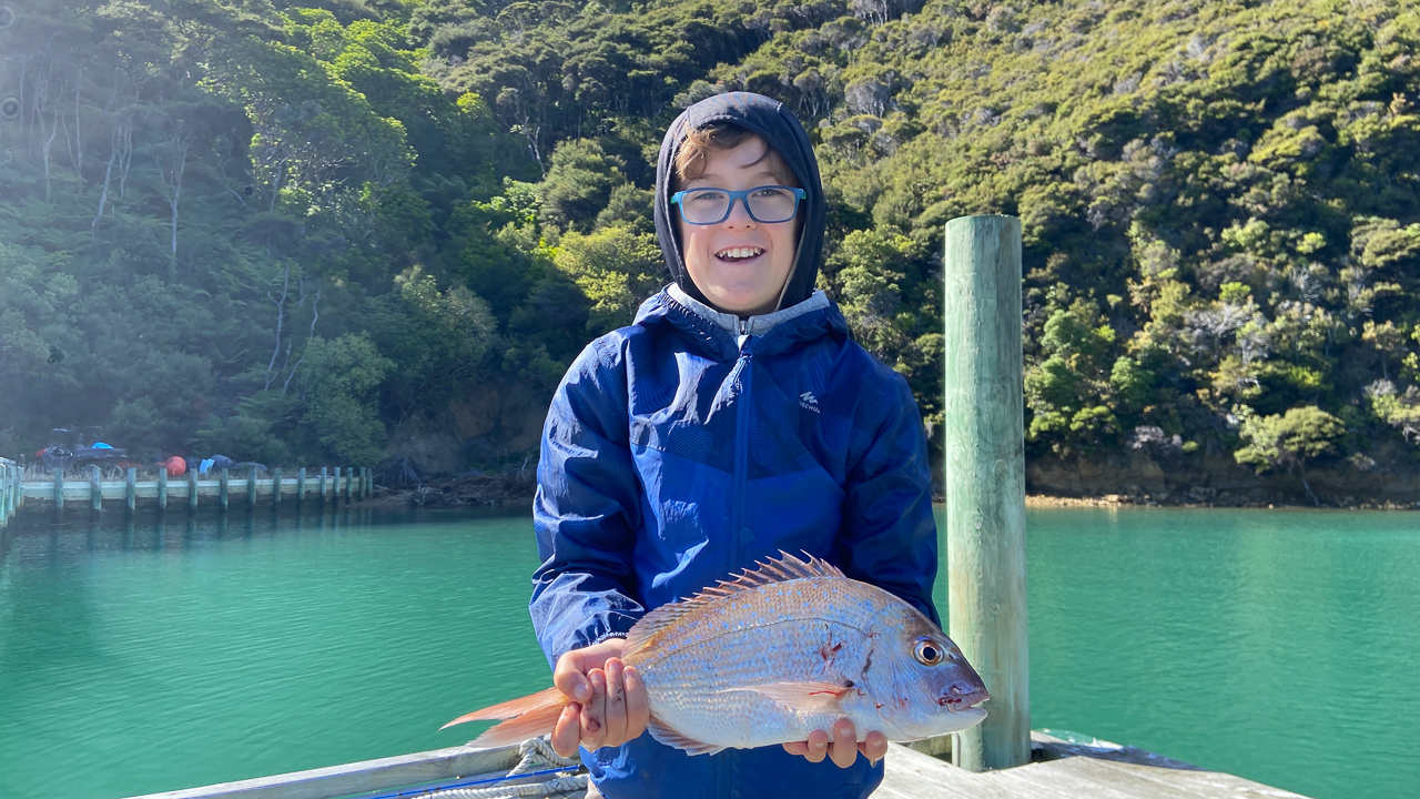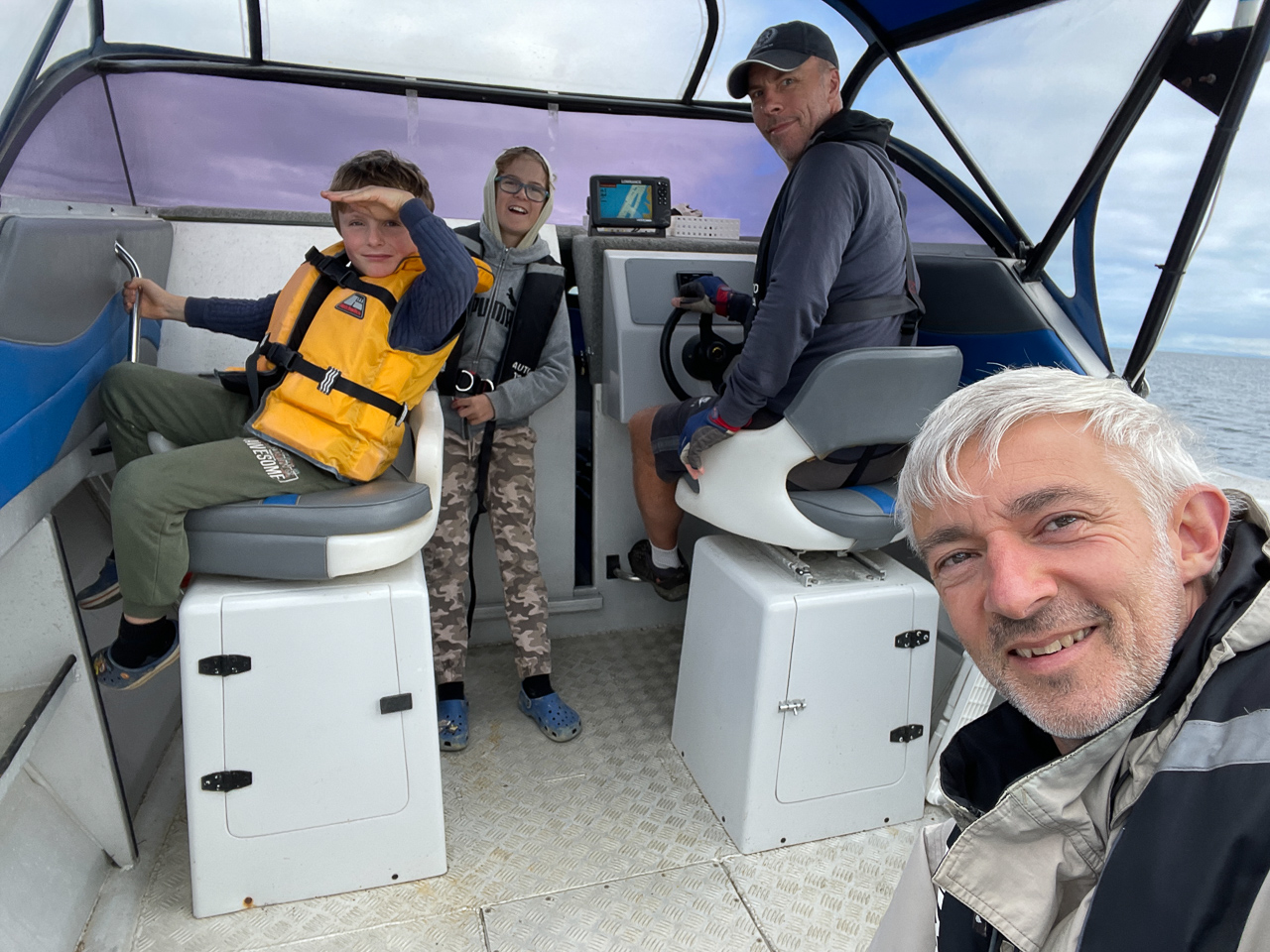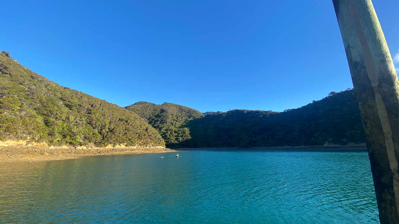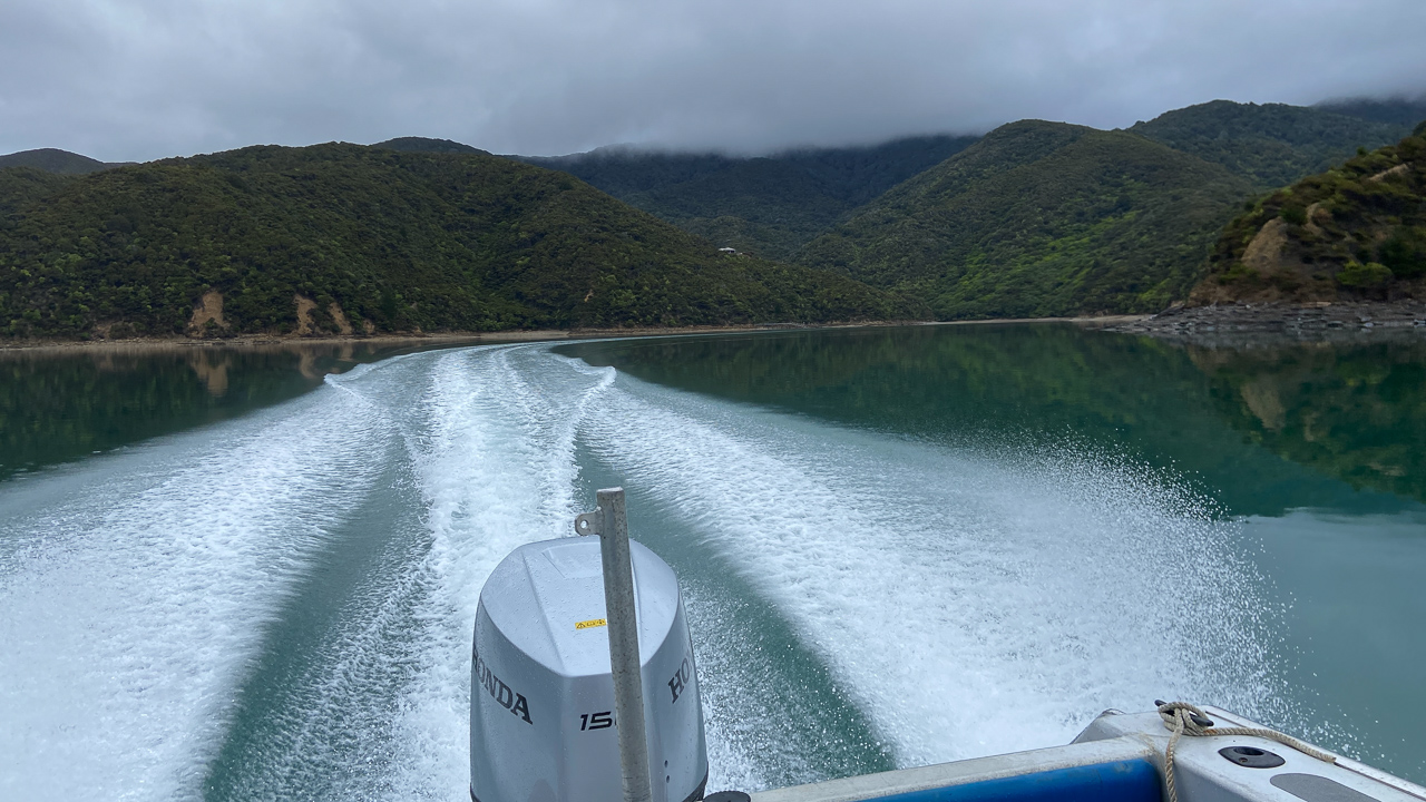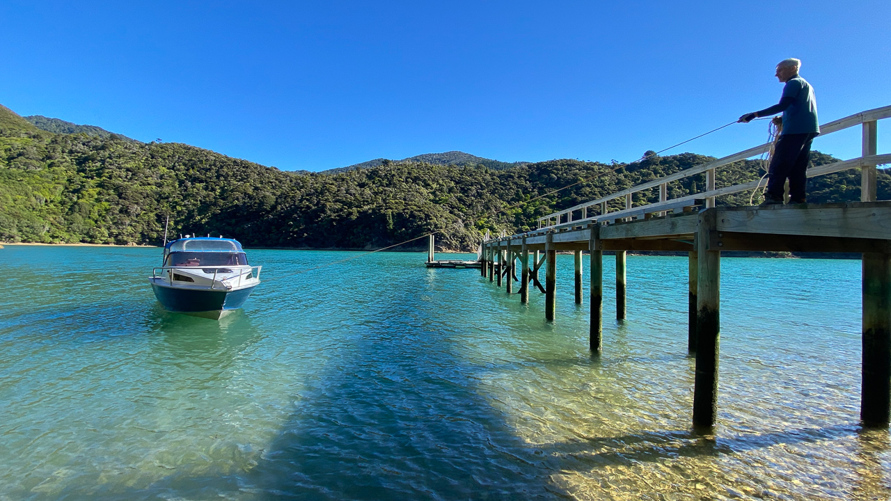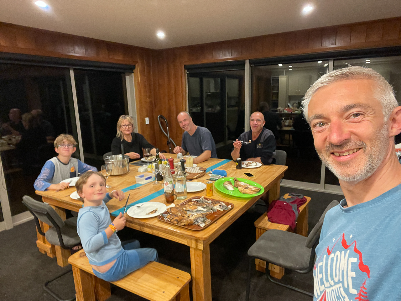 202. De retour au ponton, coincidence, un banc de kahawai fait fretiller la surface en chassant leur petit dej'. Graeme emmene Cosmo et Adan sur son annexe ...