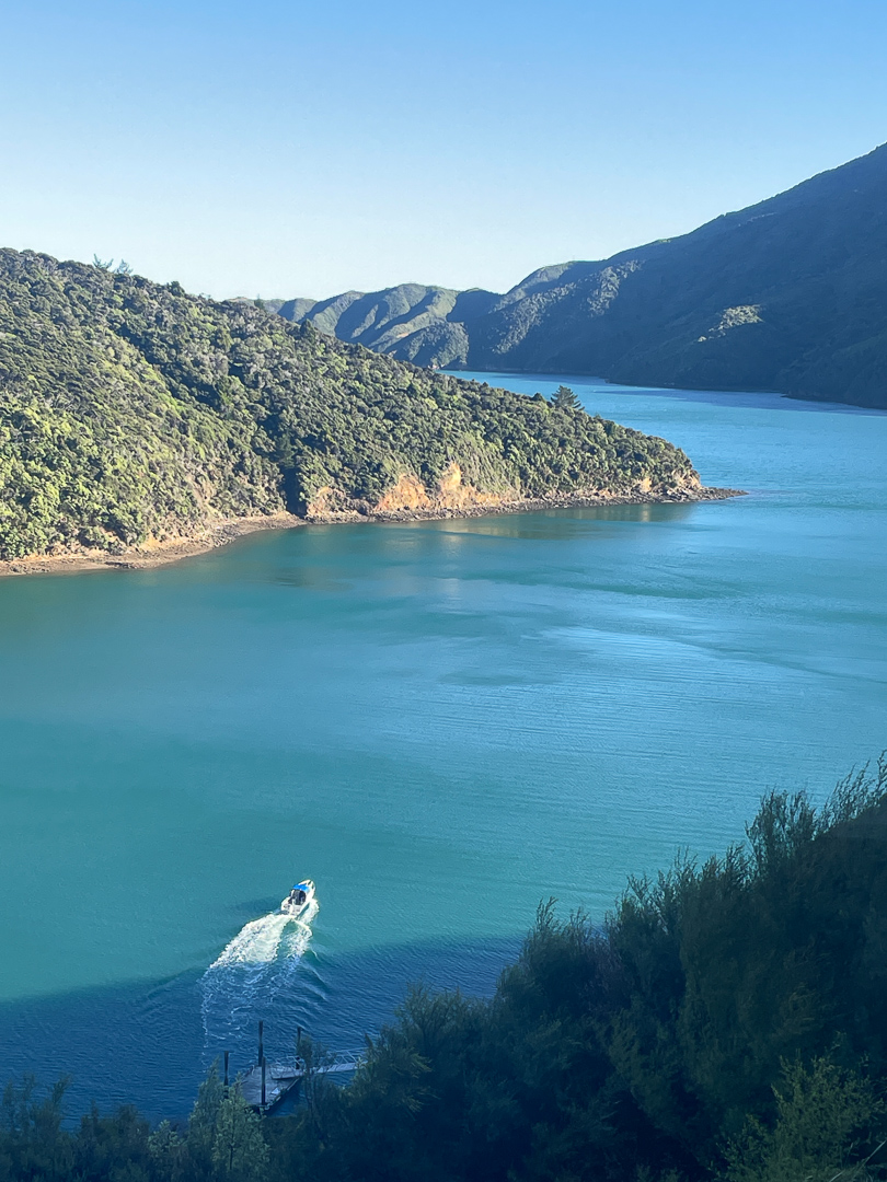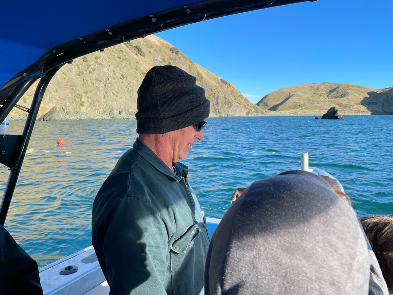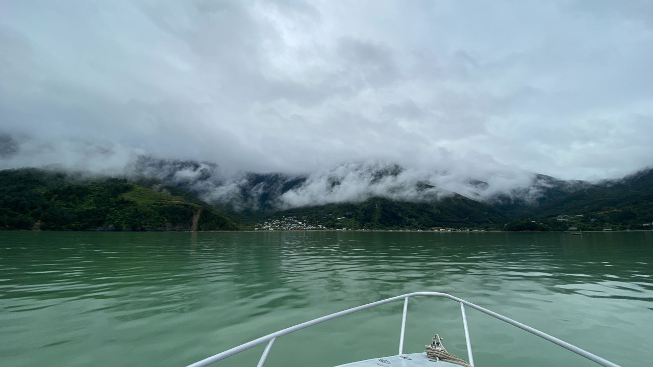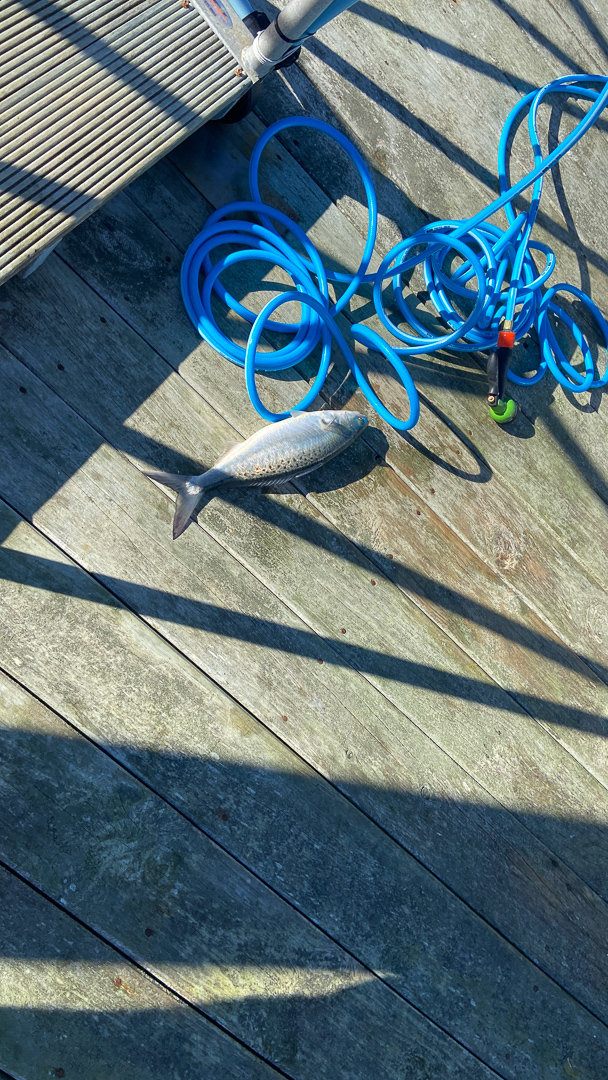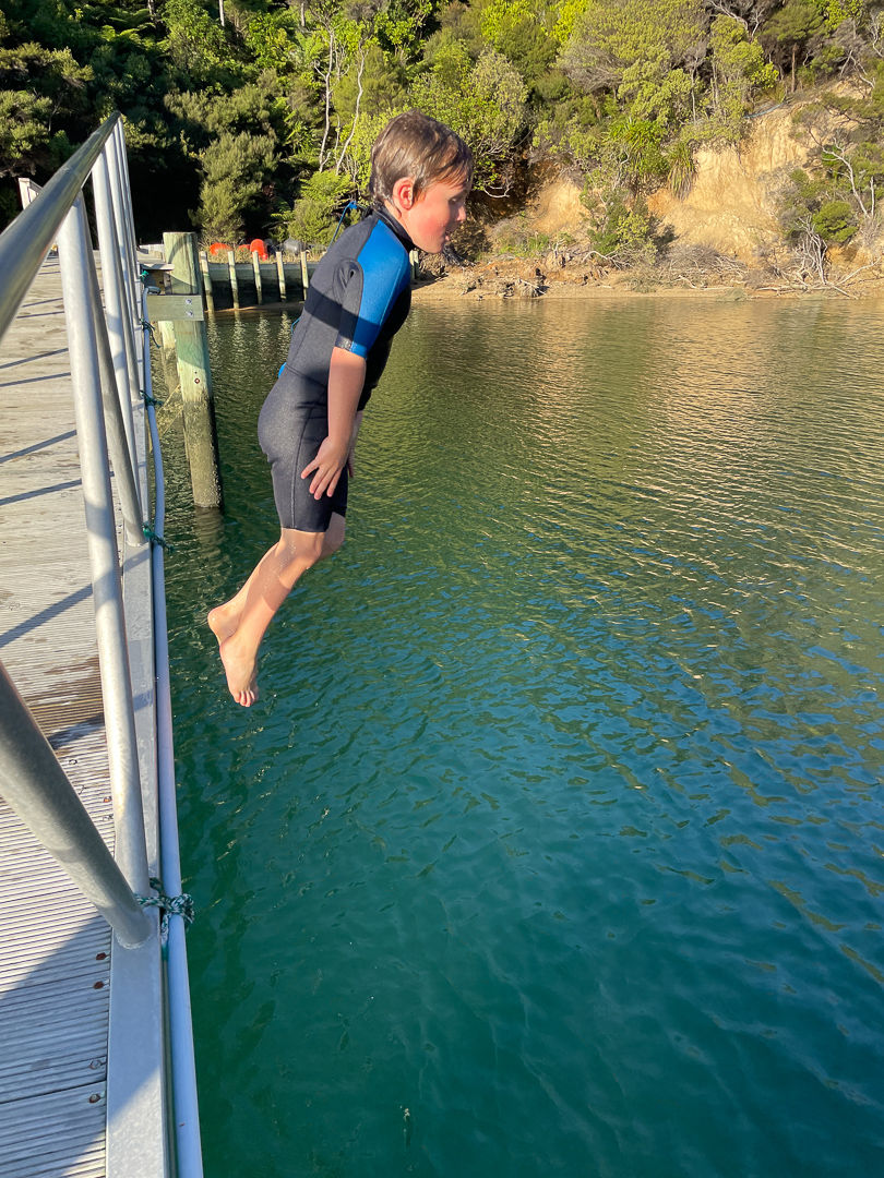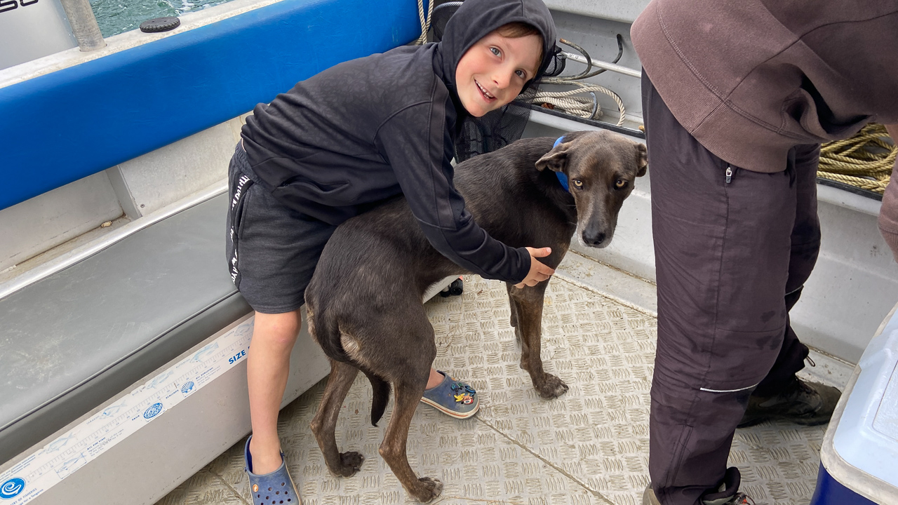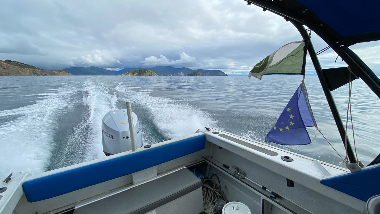 202. De retour au ponton, coincidence, un banc de kahawai fait fretiller la surface en chassant leur petit dej'. Graeme emmene Cosmo et Adan sur son annexe ...