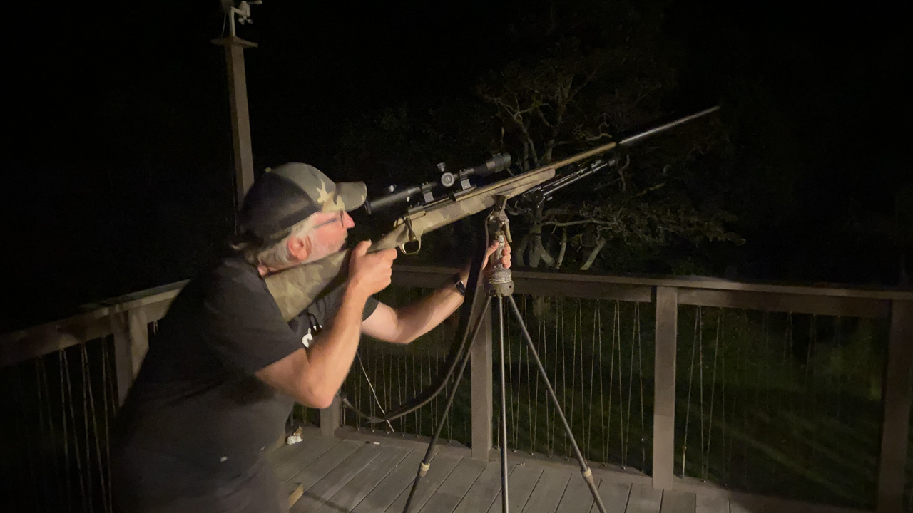 64. Quelques jours plus tard, alors que j'ai passe la soiree chez Jane et Chris pour y faire de la fraiseuse (un voyage chez eux en kayak avec mon bois, epique!), Chris sort son fusil et viseur nocturne. Et ca ne manque pas: sur la crete, on distingue (dans la lunette bien sur) des biches.