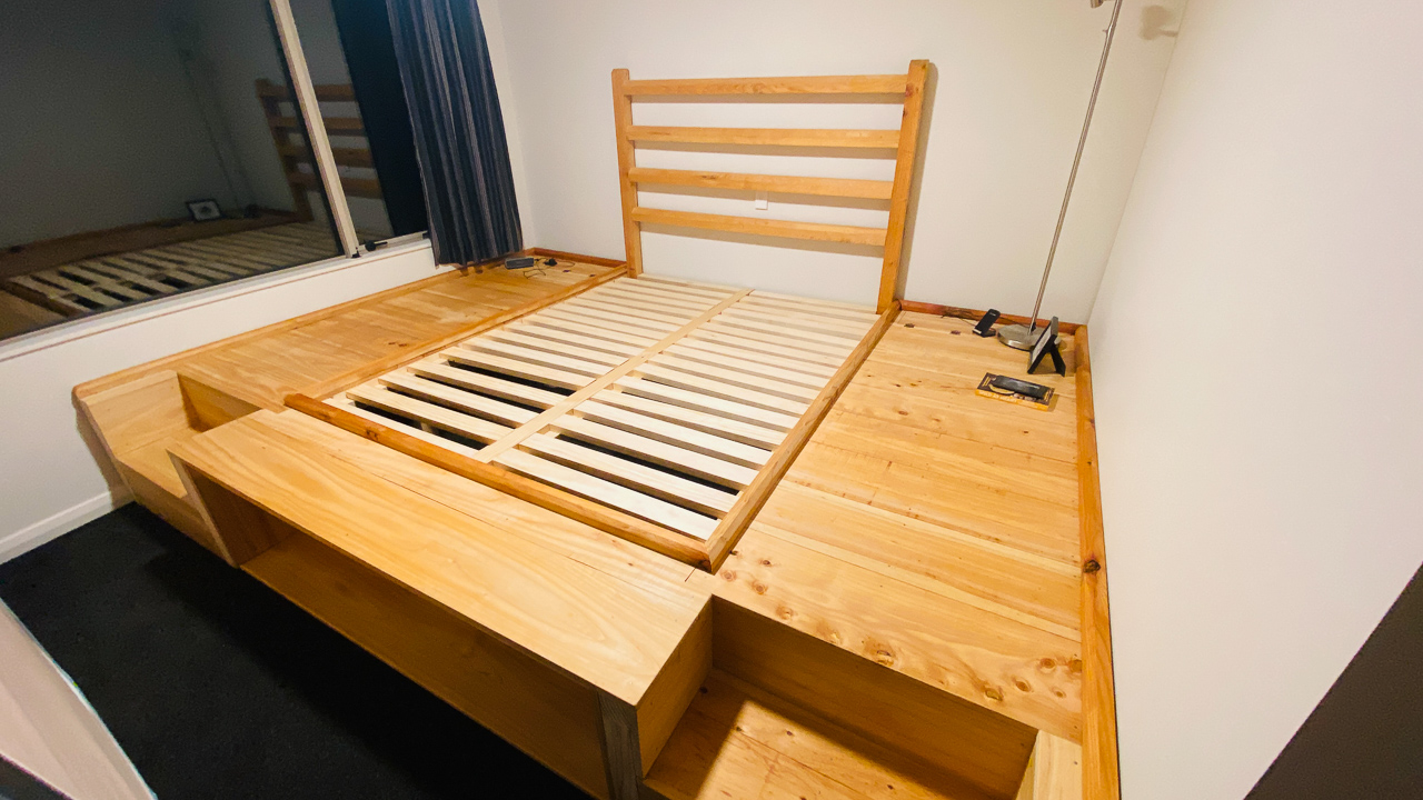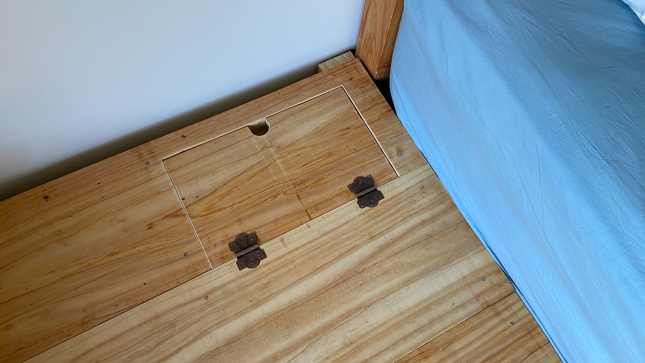 76. La chambre continue d'avancer. Apres les trappes, les plaintes, que j'ai ete fraiser chez Chris, et que j'ai fini de biseauter a la maison. Je les colle a la structure, pour ne pas avoir trop de clous apparents.